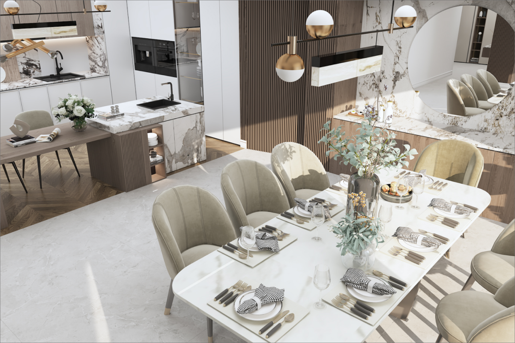 Eclectic art pieces in dynamic shapes and vibrant colors harmonize with a white marble floor and distinctive curvy furniture, all while celebrating the elegance of minimalism. This thoughtfully designed space instantly elevates the mood and inspires a sense of joy.