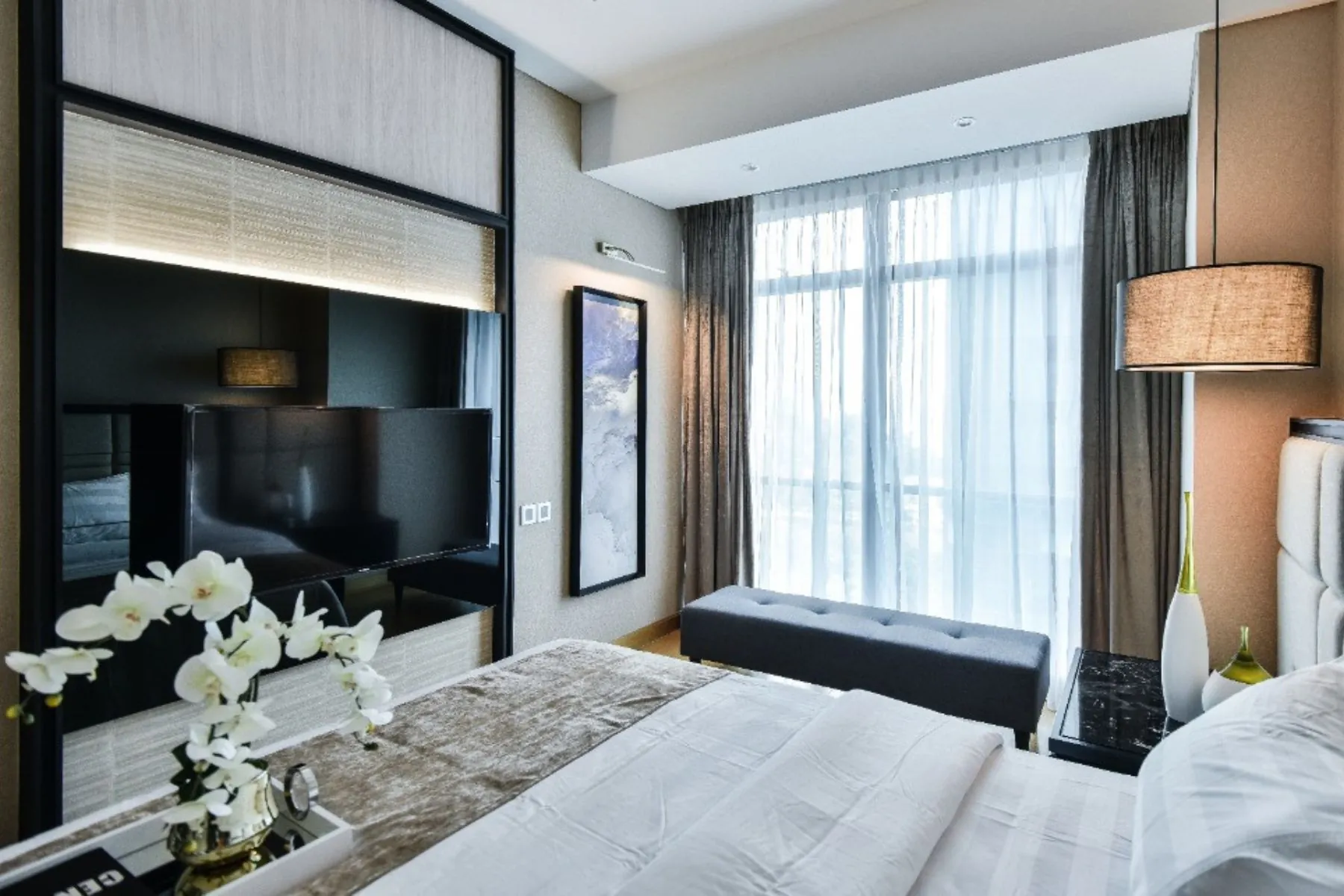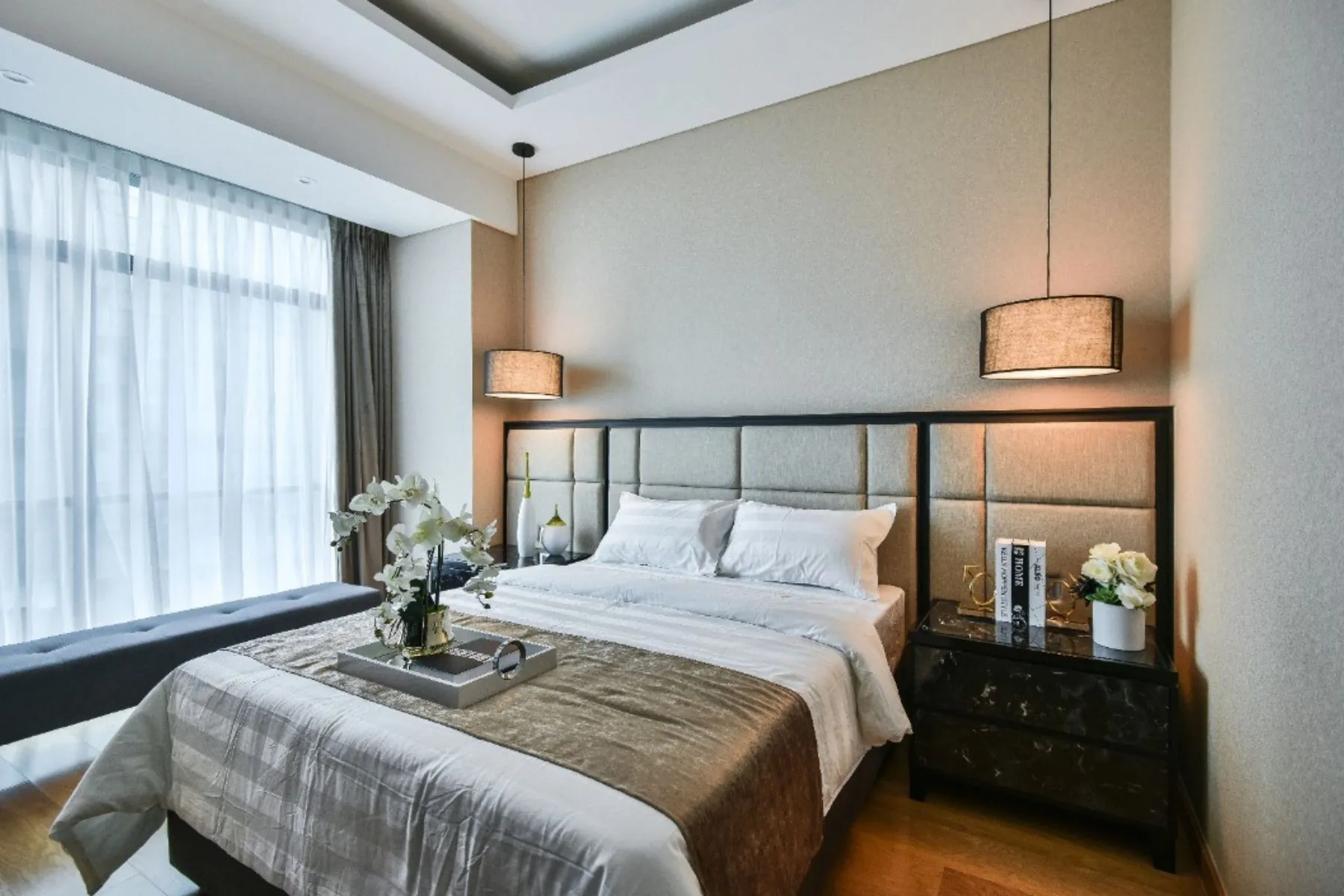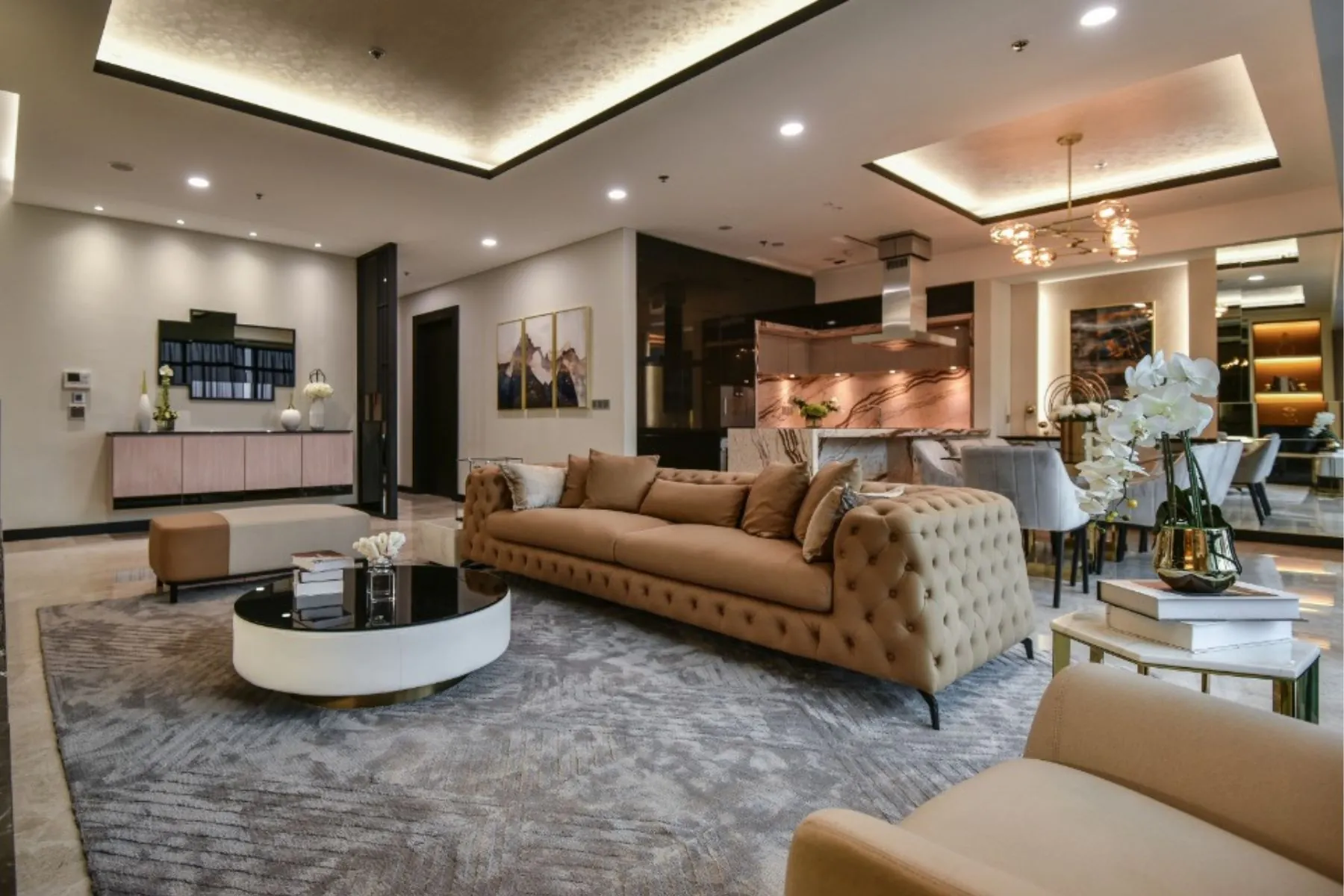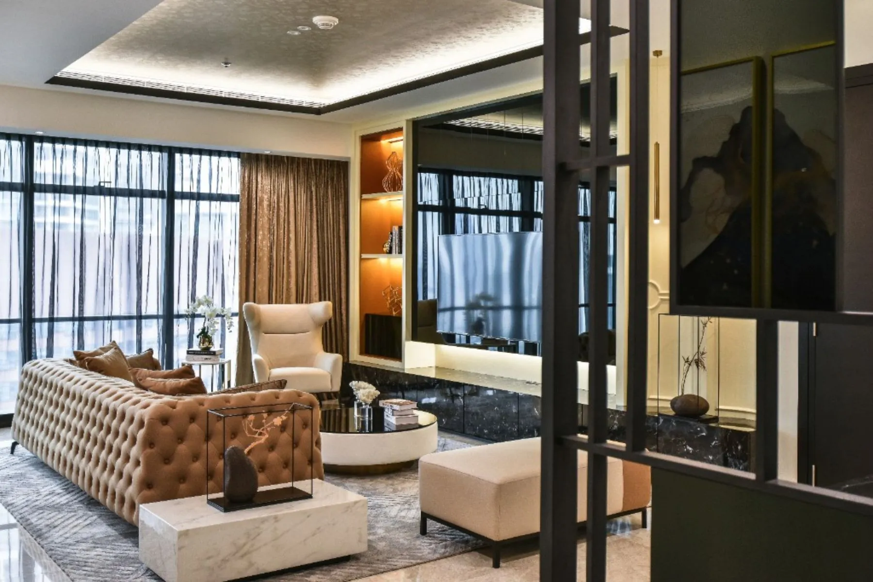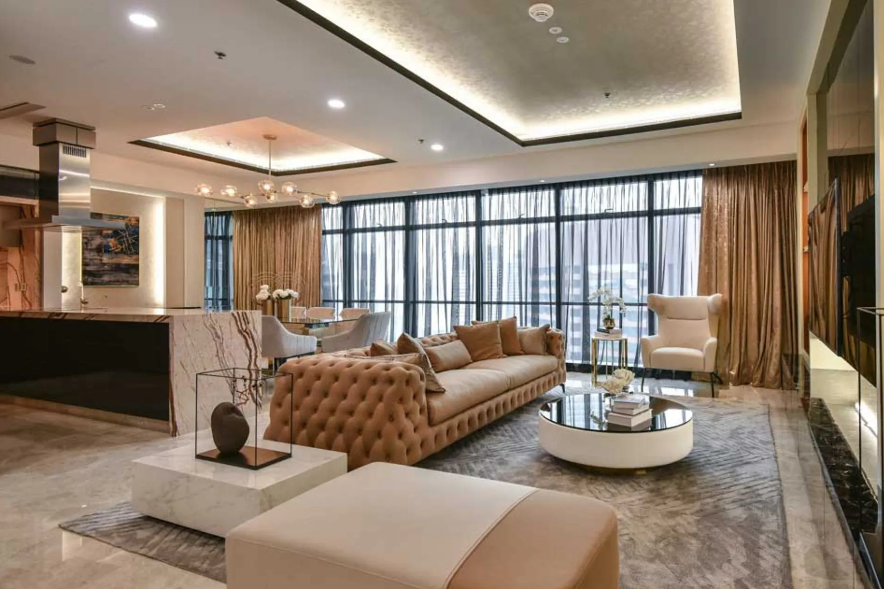 Nestled in the heart of an urban oasis, the Ritz Carlton Residence displays impeccable modern design. The living area is a blend of comfort and style, featuring plush seating and sun-drenched floor-to-ceiling windows that offer breathtaking panoramic views. Natural light enhances the carefully selected artwork and warm, neutral colour palette.
