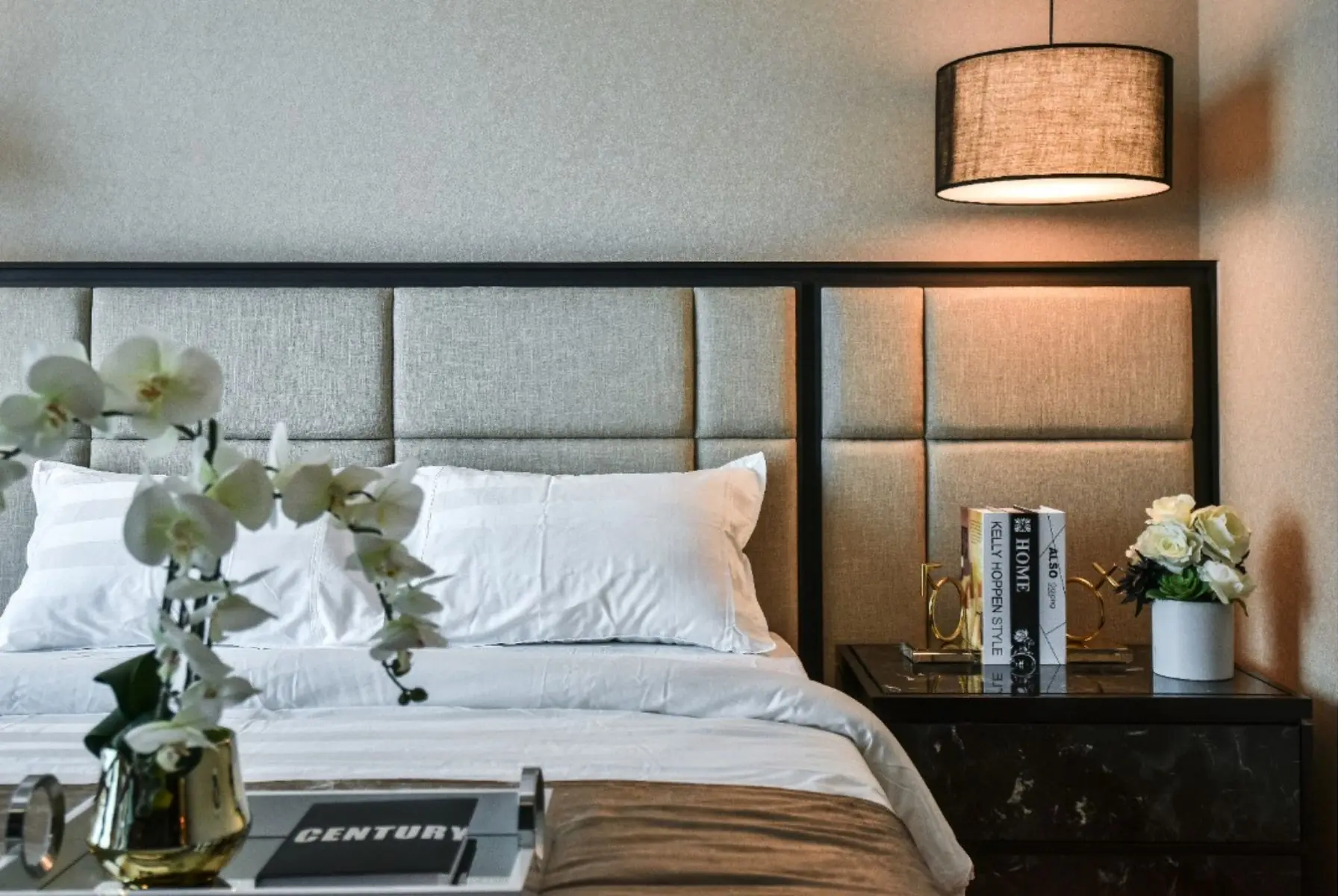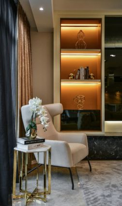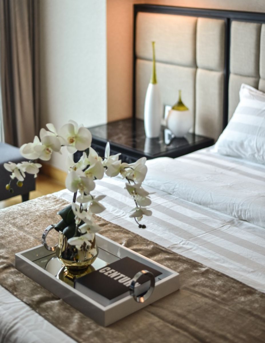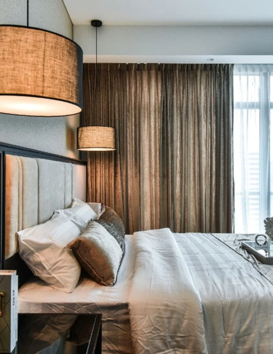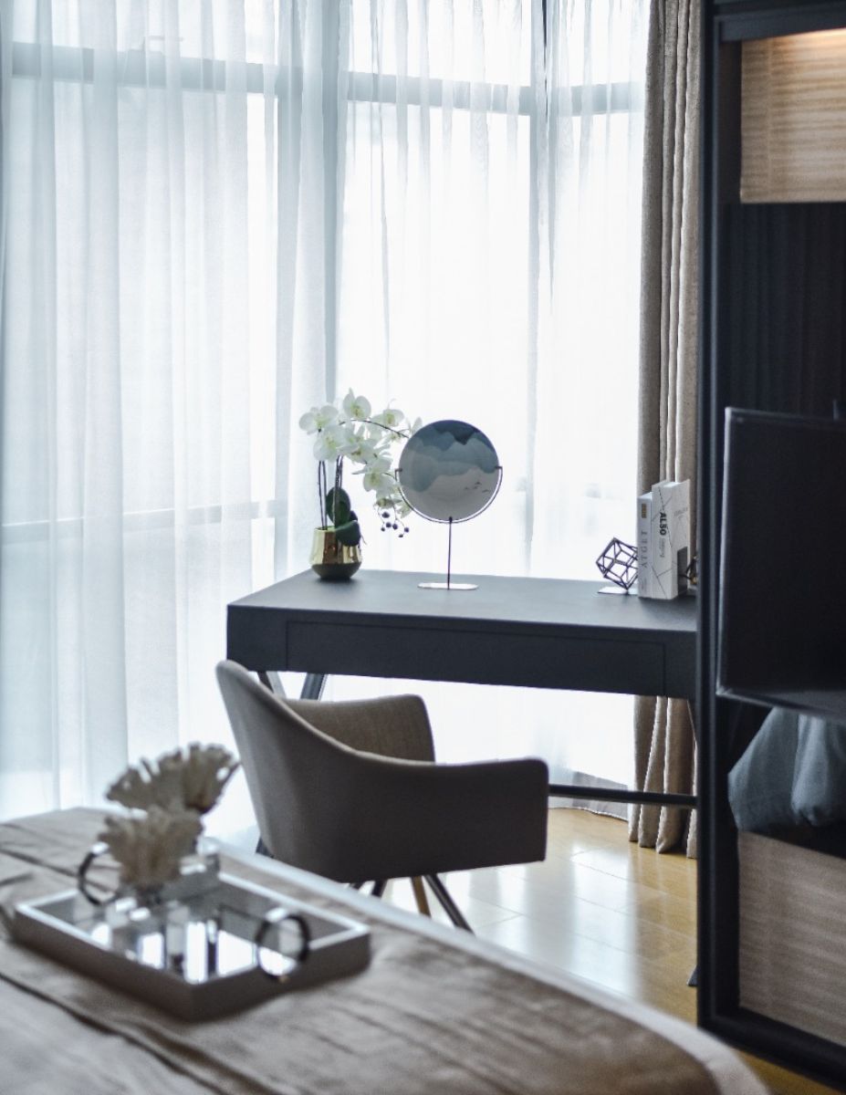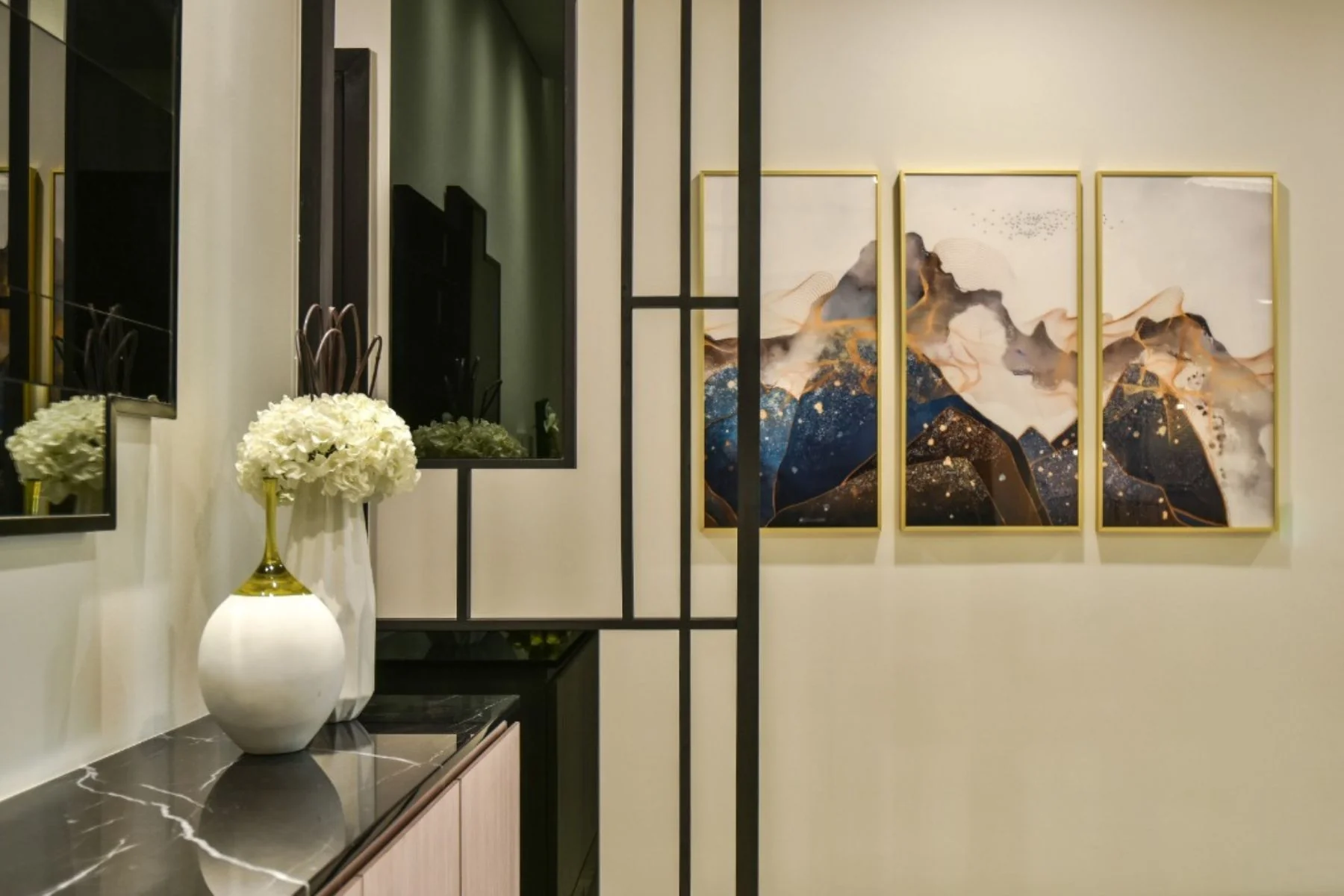 Nestled in the heart of an urban oasis, the Ritz Carlton Residence displays impeccable modern design. The living area is a blend of comfort and style, featuring plush seating and sun-drenched floor-to-ceiling windows that offer breathtaking panoramic views. Natural light enhances the carefully selected artwork and warm, neutral colour palette.