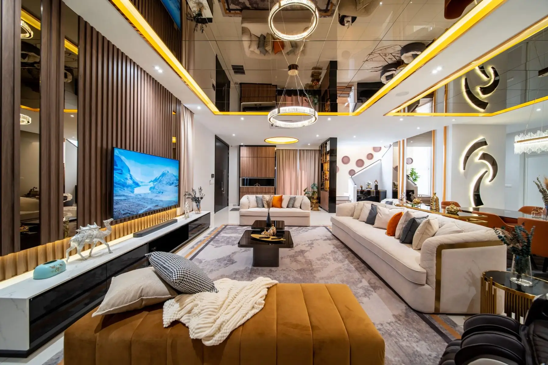 Each room displays a symphony of colours, textures, and exquisite furnishings. Natural light floods the spacious interiors through expansive windows, enhancing the harmonious ambiance. This bungalow combines architectural brilliance with impeccable design.