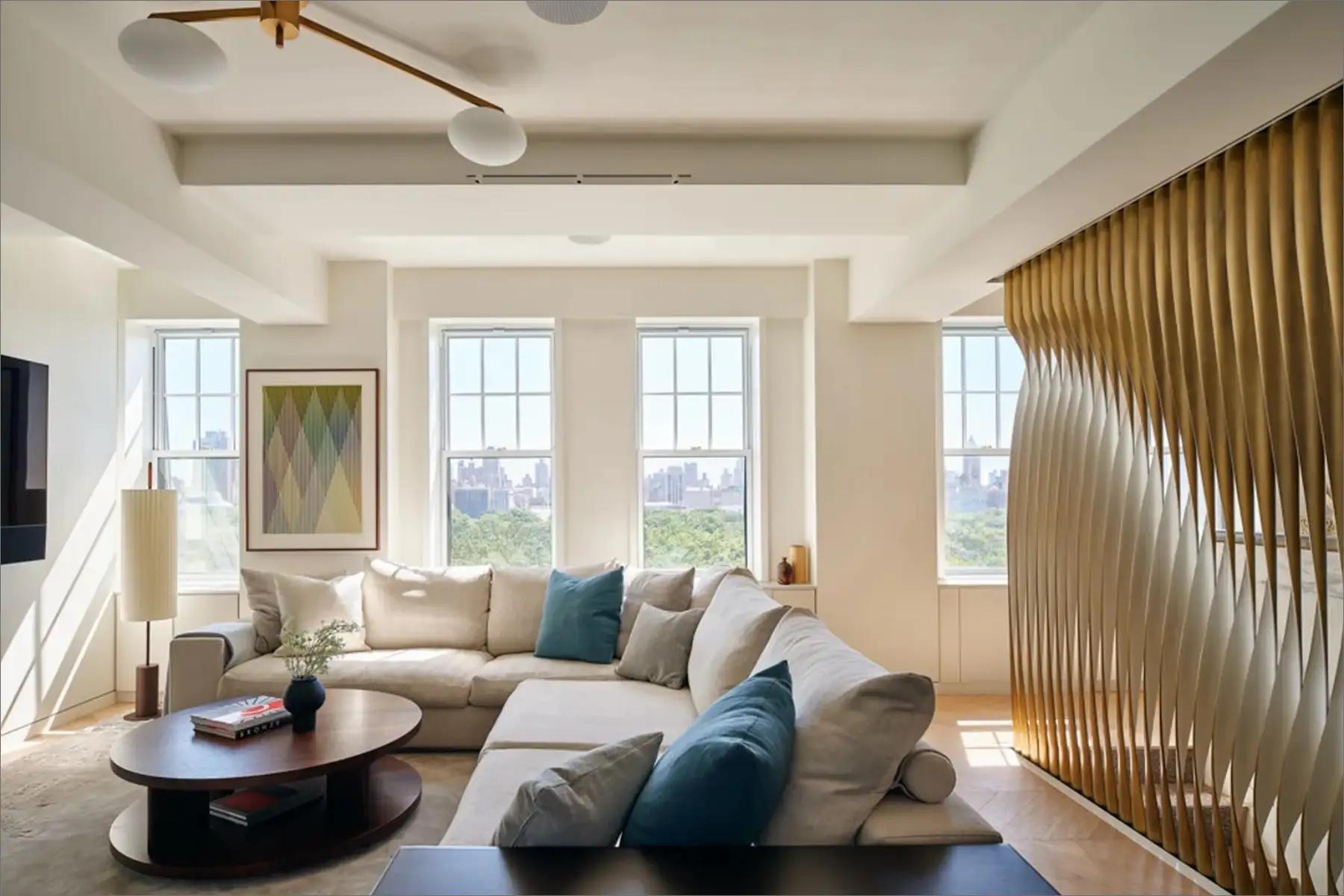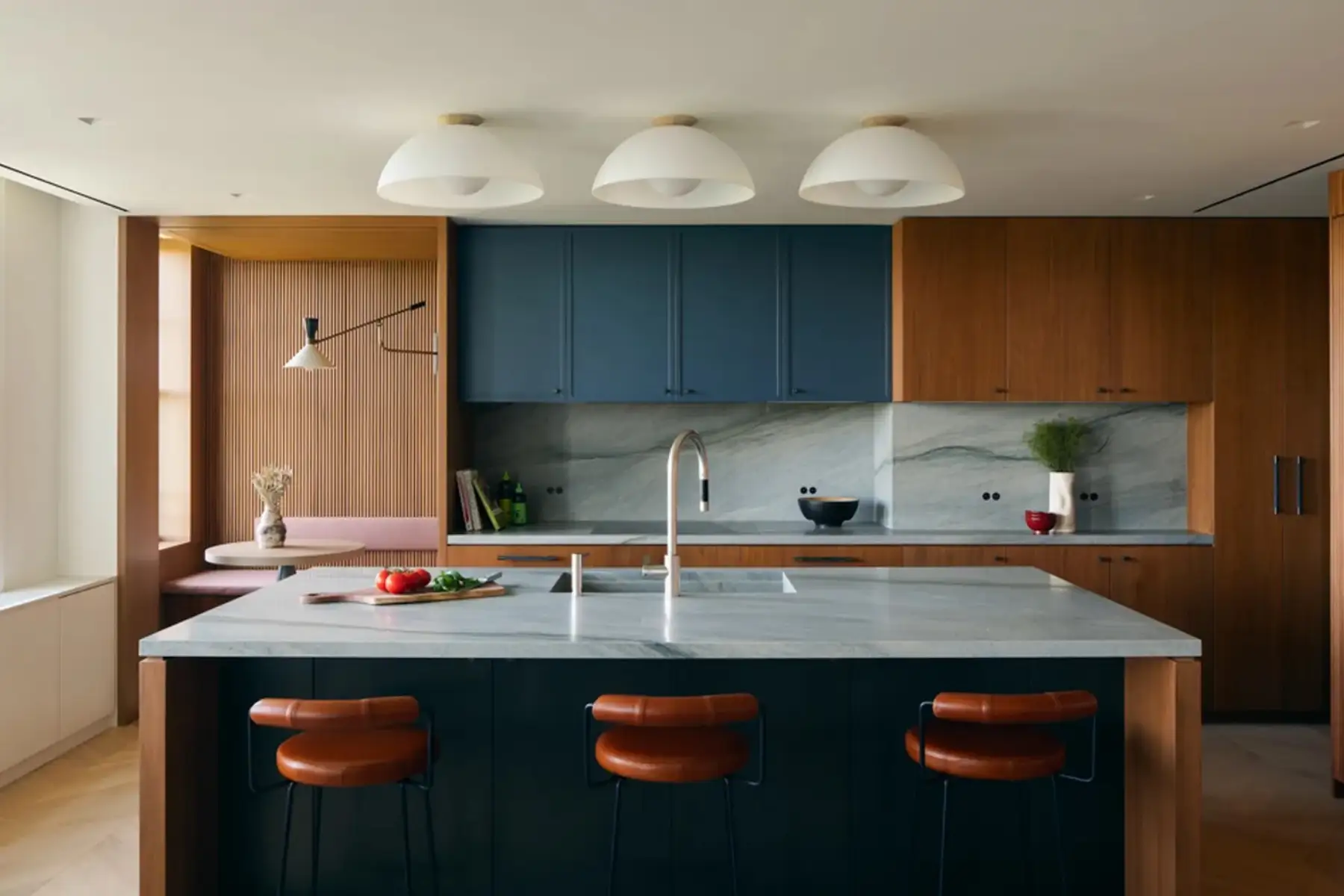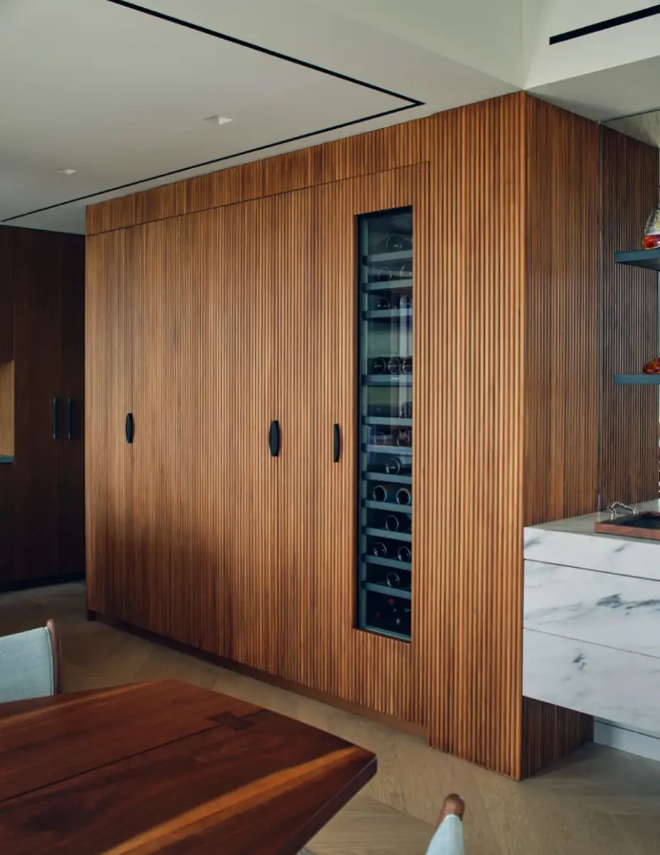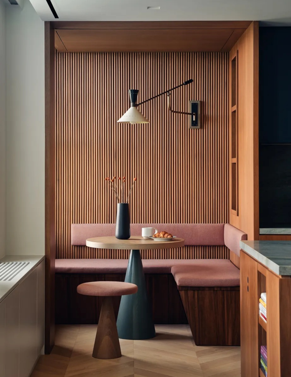 In this complete apartment renovation, multiple units were combined to create a sanctuary for a growing family above Central Park. Ribbed walnut panelling links the kitchen to a light-filled breakfast nook, adding warmth and texture, while marble accents on the walls and counters provide classic grandeur.