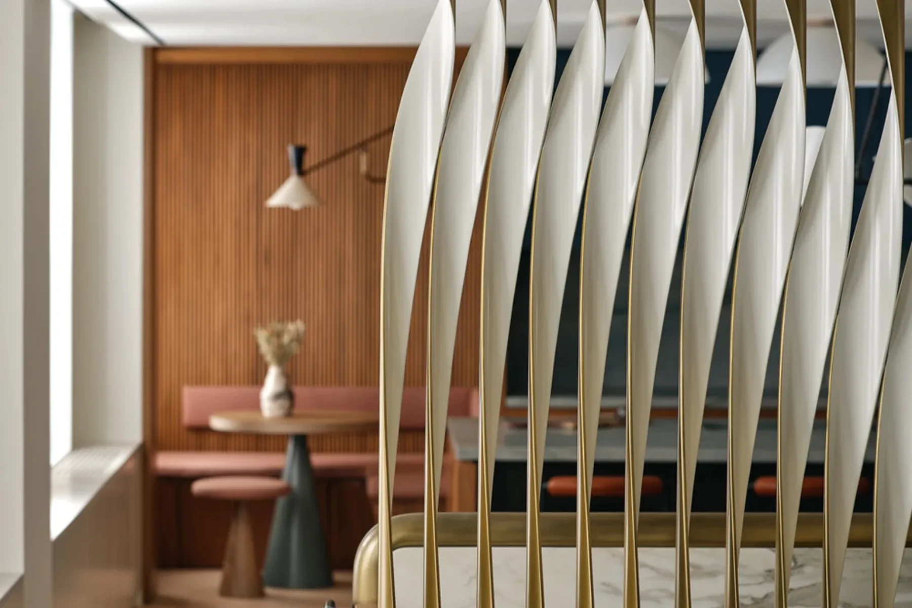 The custom-designed double-height screen features powder-coated steel columns that twist, creating a swooping pattern that optimises views throughout the apartment. Alternating gold and white paint enhances the illusion of movement while seamlessly connecting the lower and upper floors.