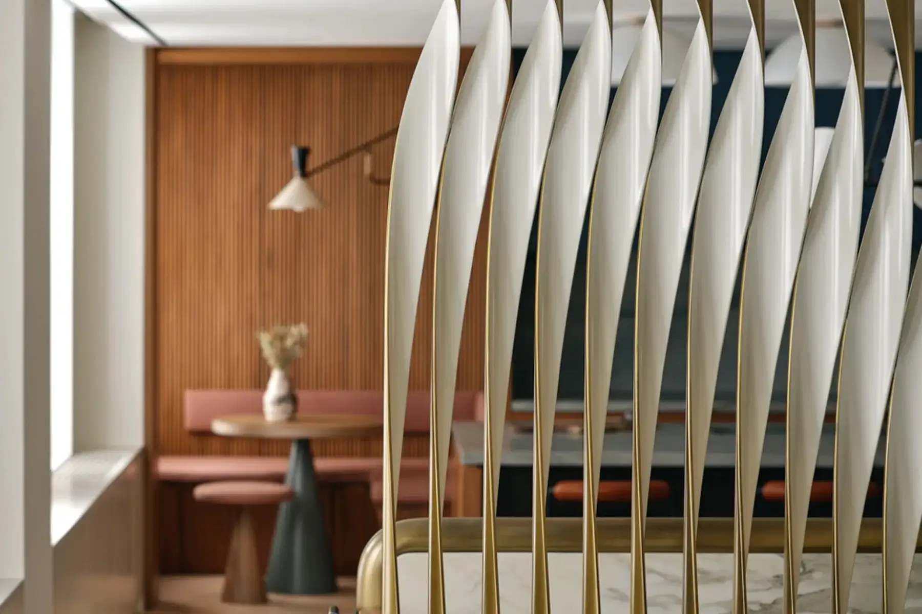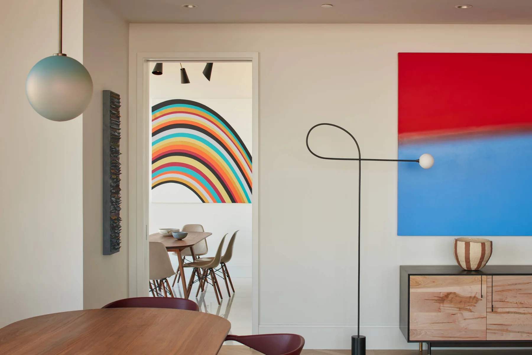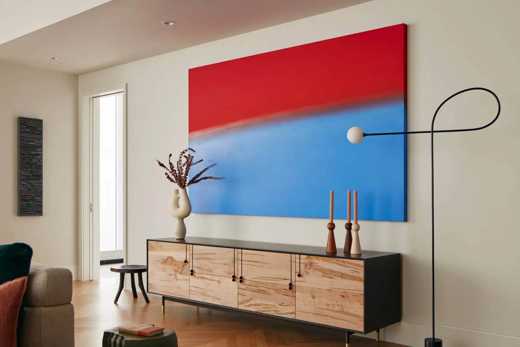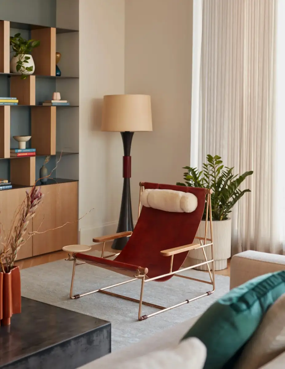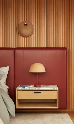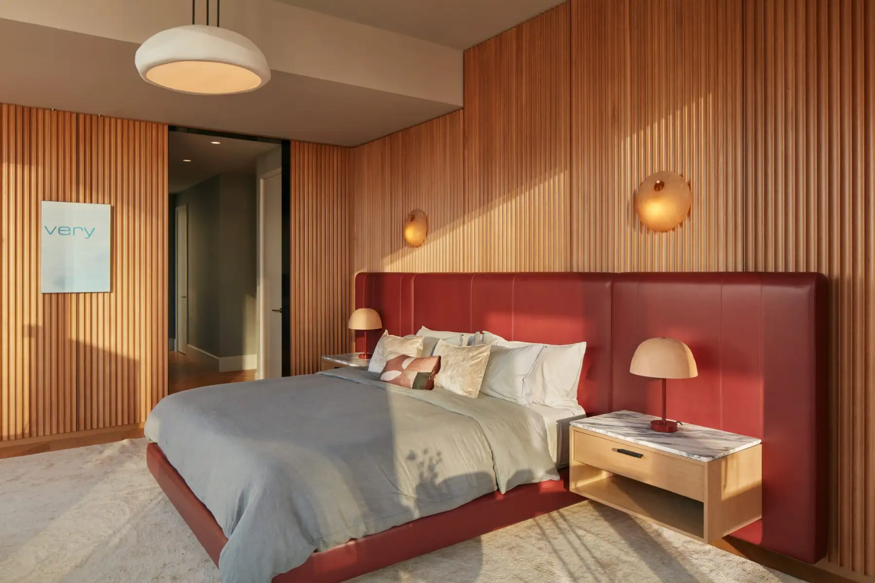 To address this, DF&A designed a custom mill piece that incorporates backlighting, texture, and depth to soften the living room's striking vista. For the bedroom, DF&A clad the non-window walls in scalloped wood, creating a handcrafted warmth. The space is transformed with custom furnishings, including a supple red leather headboard with integrated nightstands, mirrors, and ceramic lamps, turning the glass-sided box into a cozy retreat.