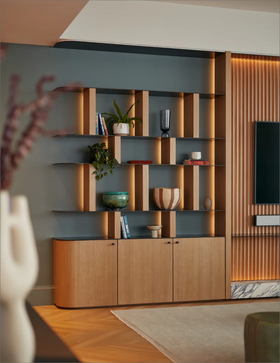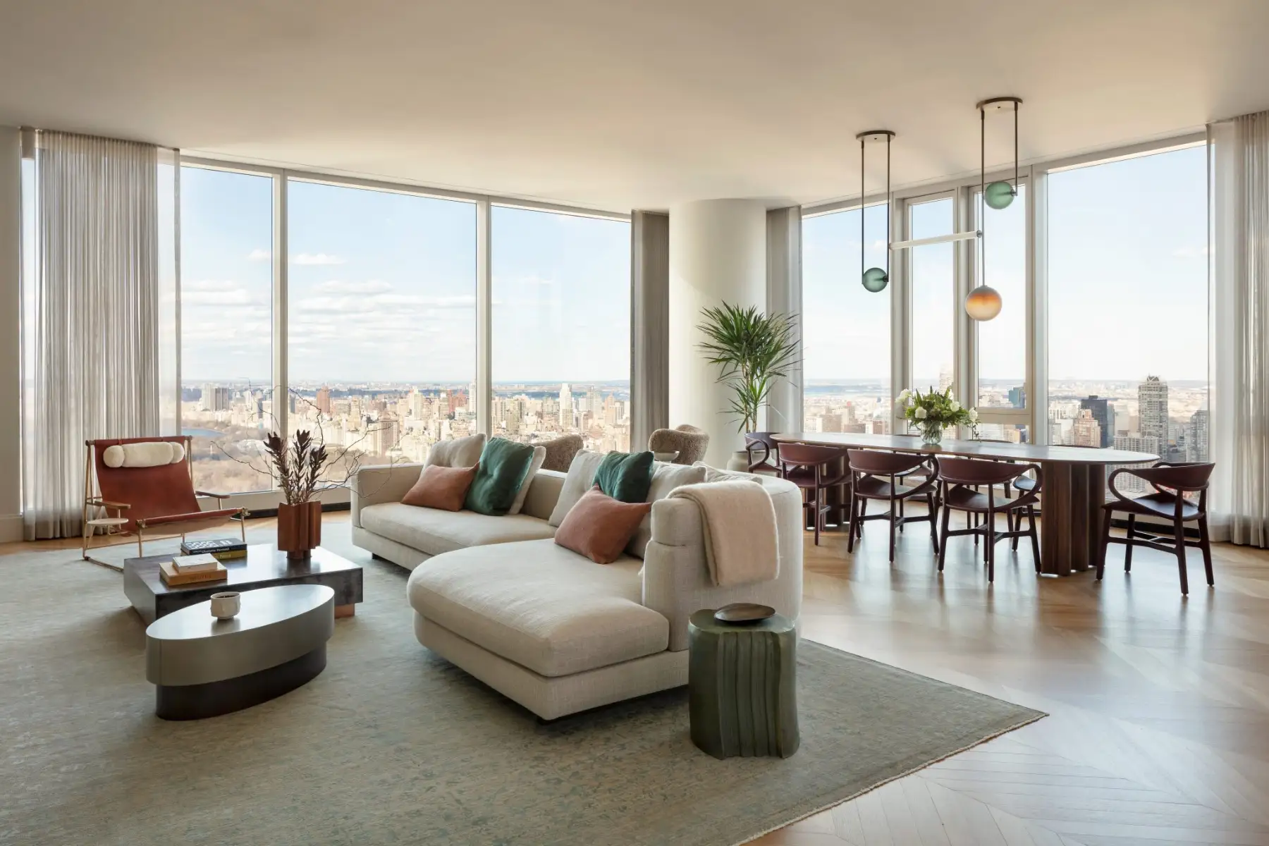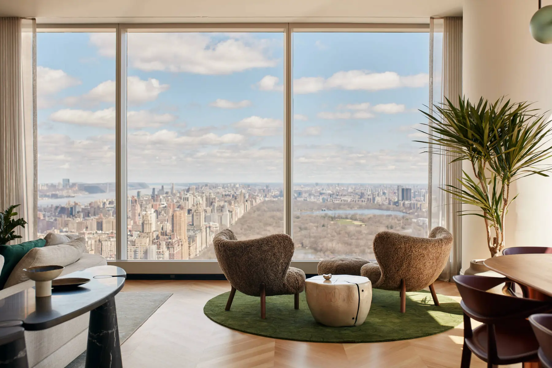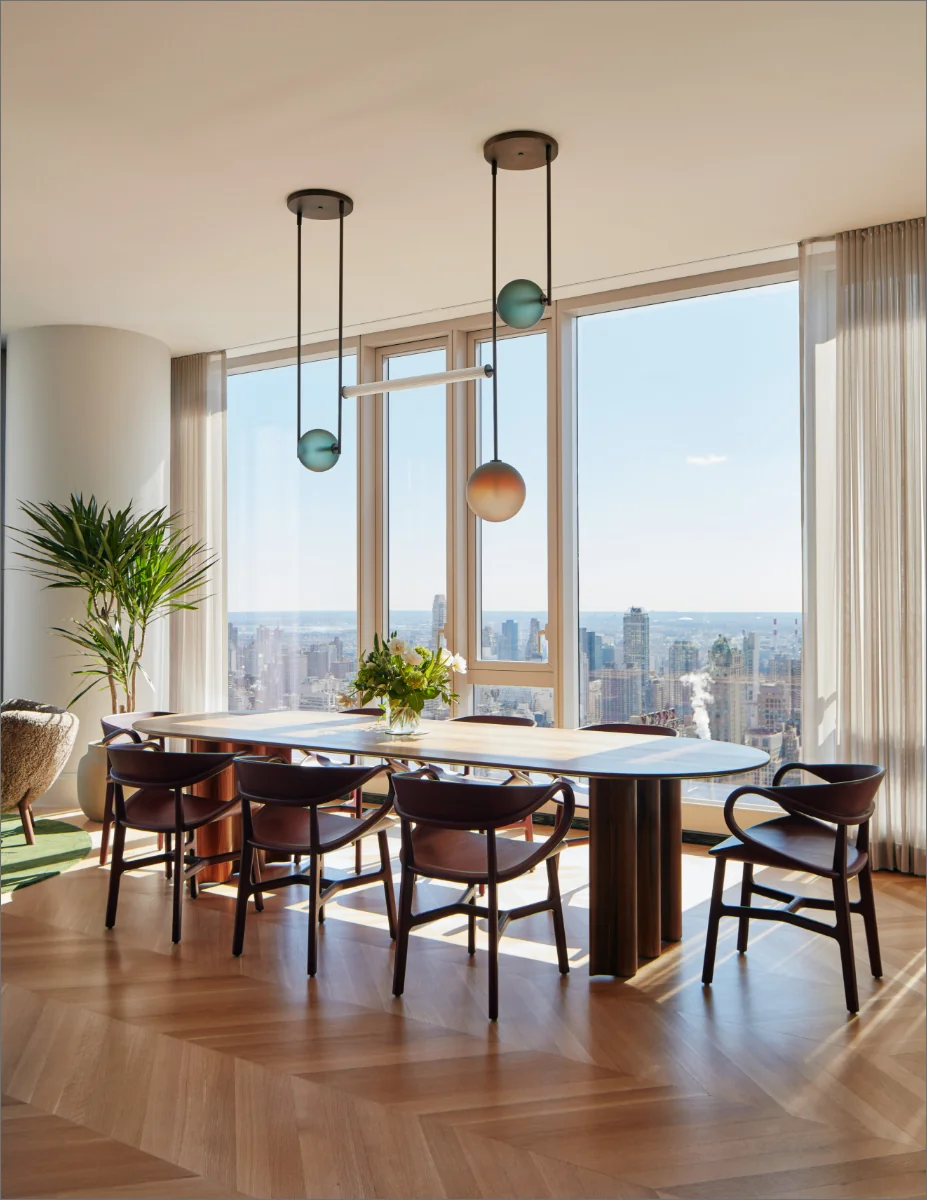 At this elevated luxury apartment, the expansive view of Central Park is breathtaking but can feel overwhelming. DF&A's challenge was to introduce a sense of human scale into this glass-and-steel aerie, balancing the grandeur of the views with the intimacy of home.