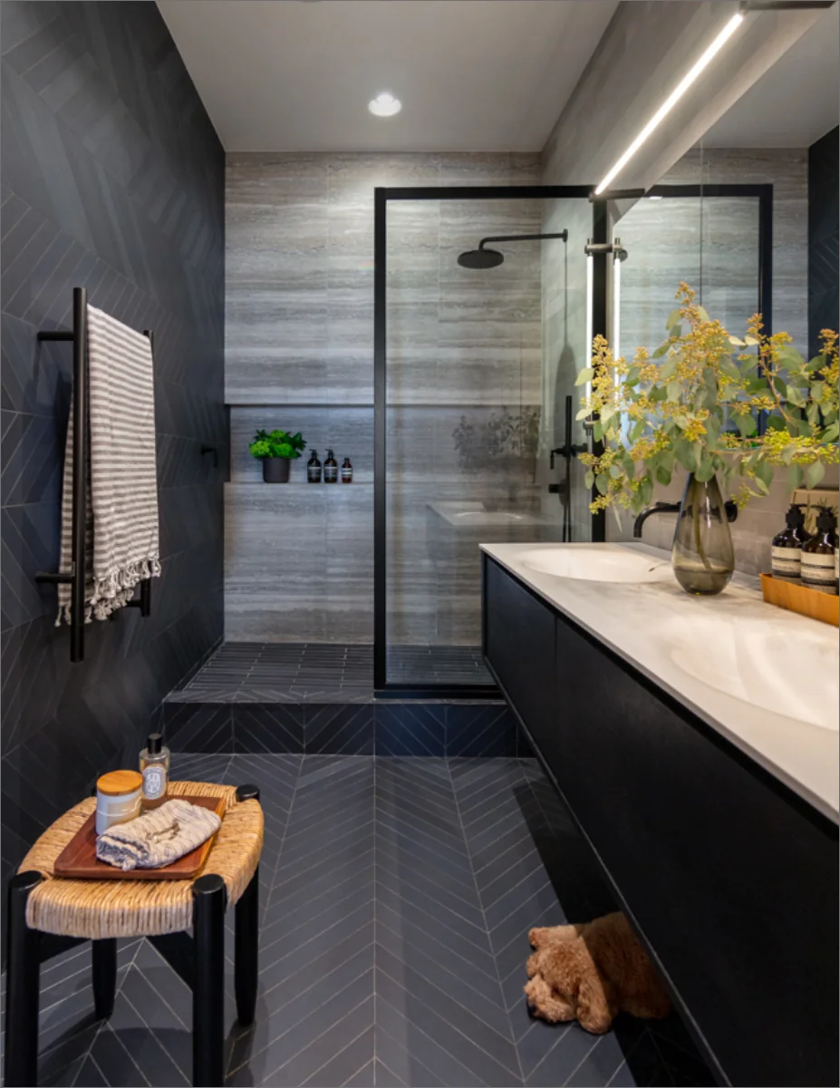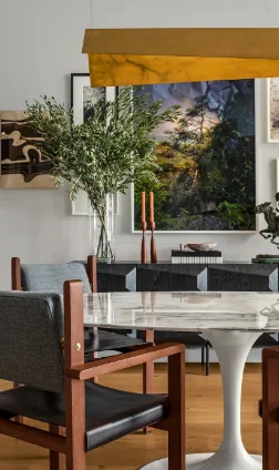 In the kitchen and dining area, DF&A installed dark walnut cabinetry and lowered the ceiling to create a cozy atmosphere. The kitchen's rich millwork is complemented by a brass chandelier in the dining area, which features an angular design softened by warm hues. While maintaining the stylish austerity of white walls, Danny introduced texture through cladding: limestone in the master bath shower, chevron-patterned tile that flows from wall to floor, and wood wrapping the master bedroom walls.