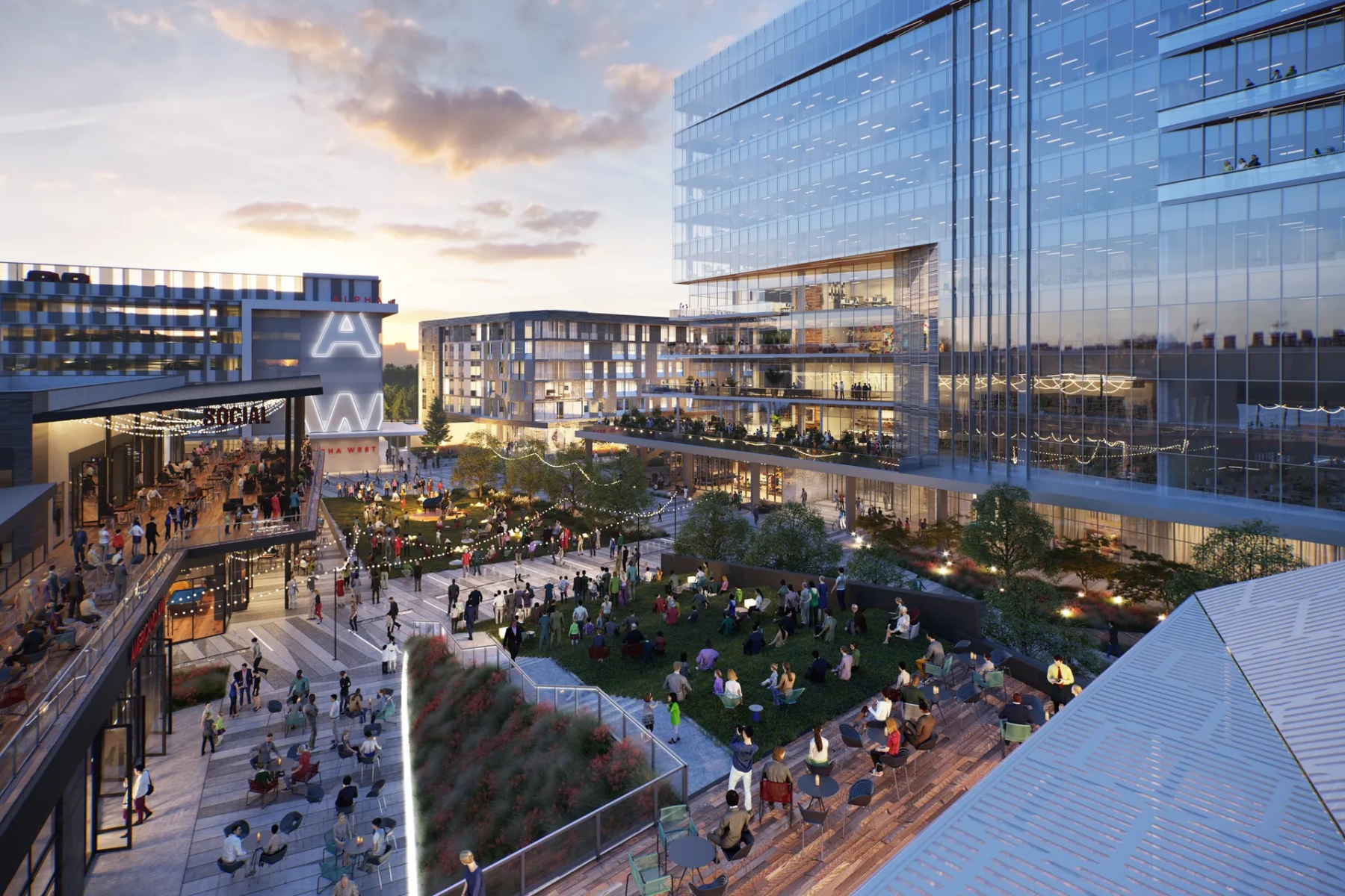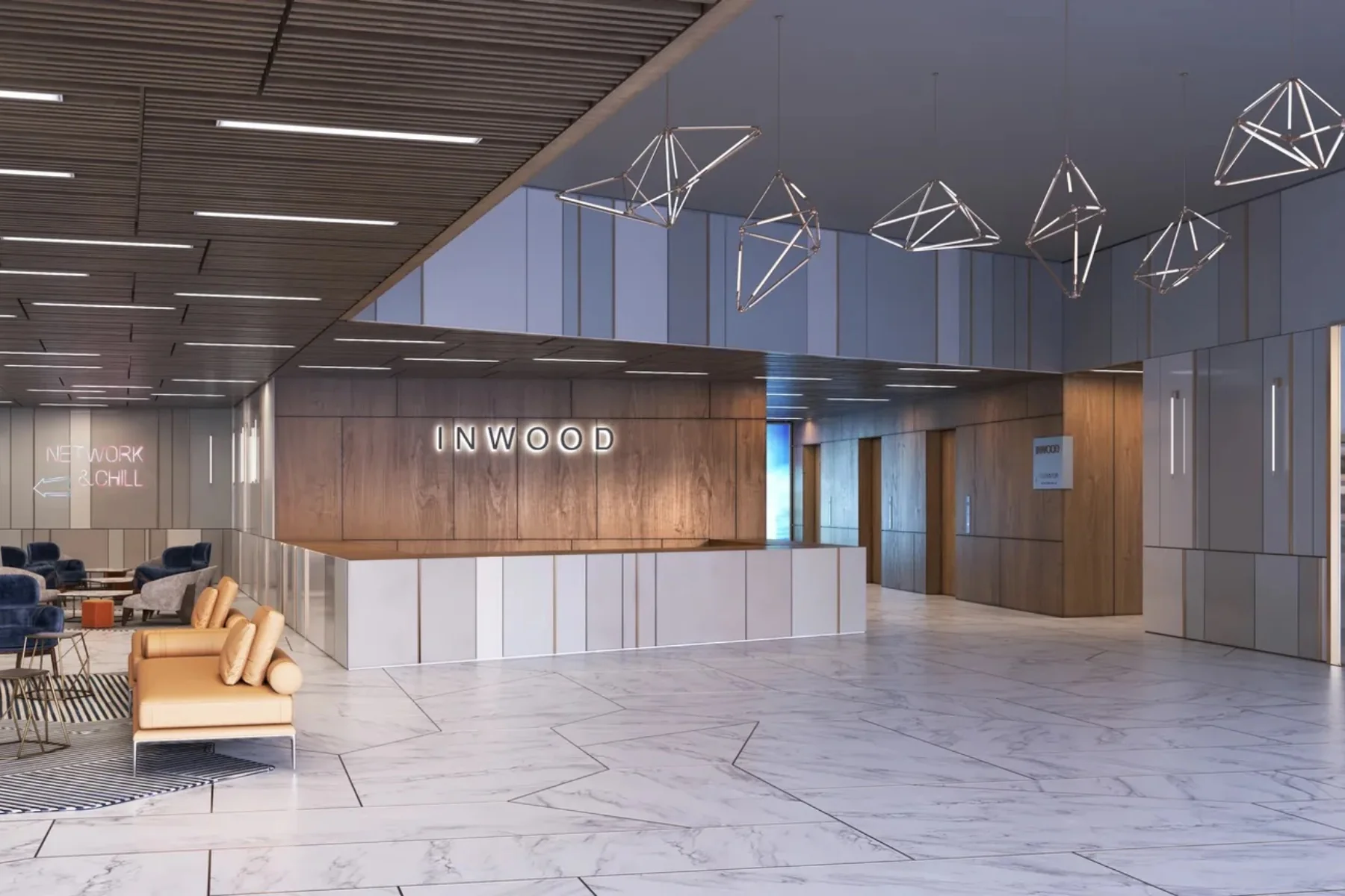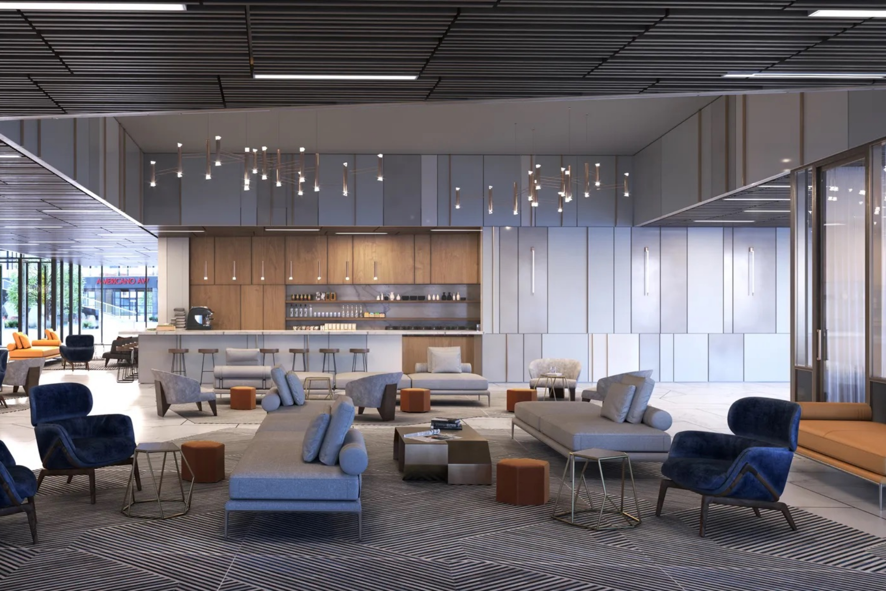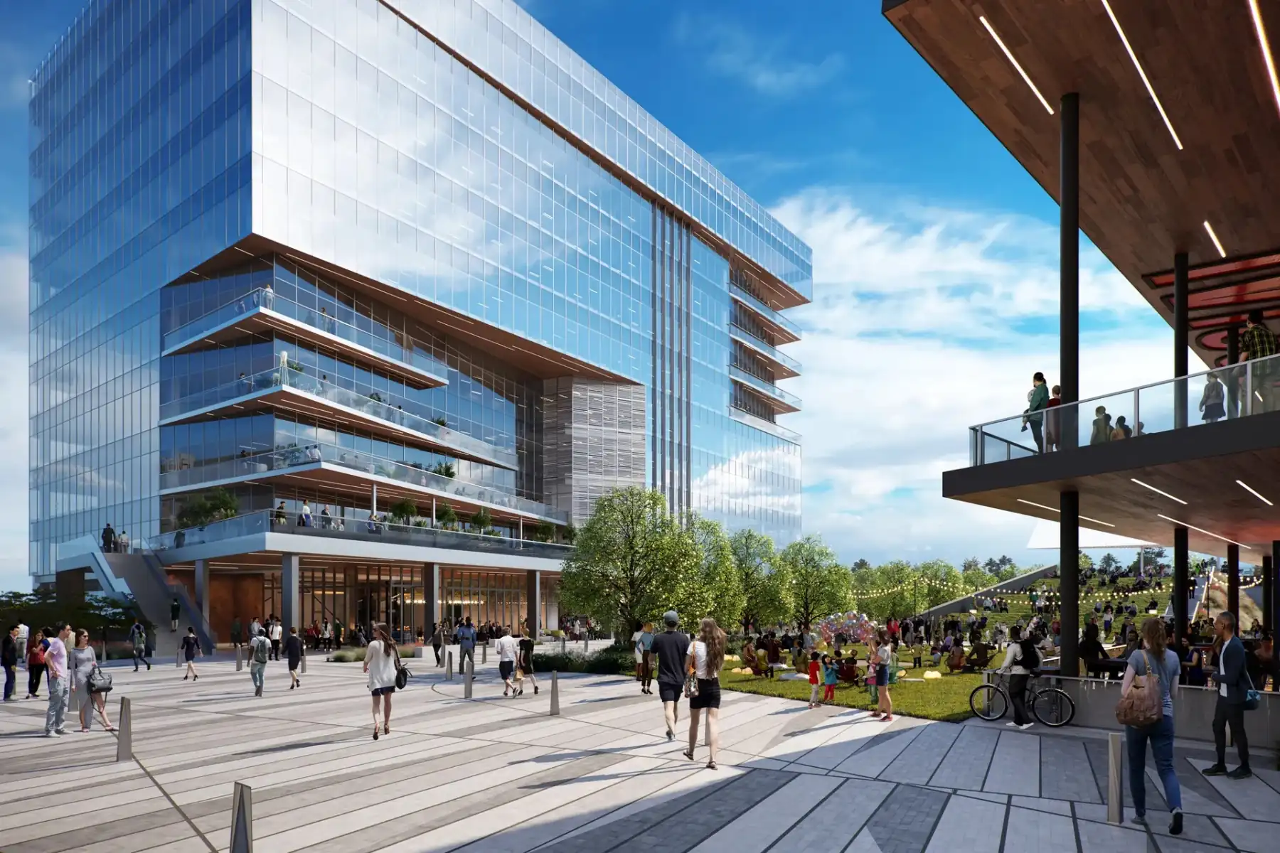 The complex, anchored by a specific hotel brand, features an office building with wood-clad, tiered balconies that echo the hotel’s design. Inspired by coworking culture, the inviting lobby fosters collaboration, moving beyond traditional office spaces.