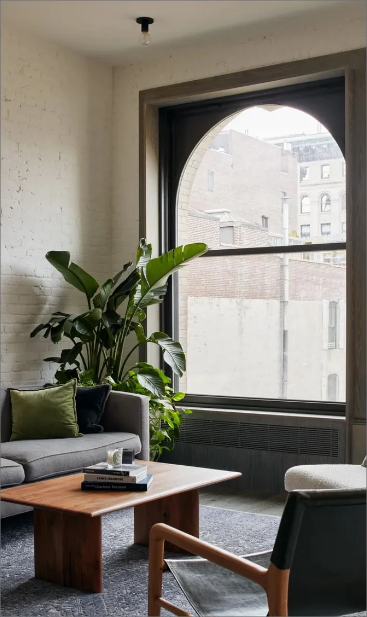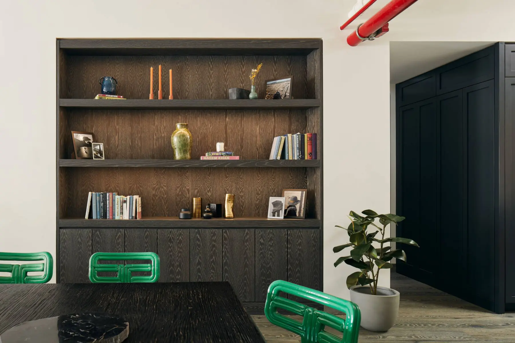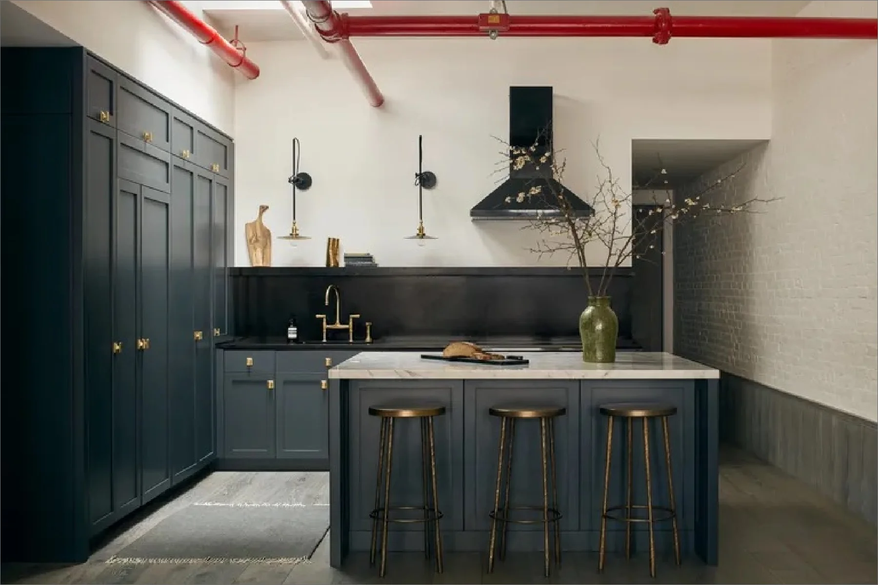 Transforming this high-ceilinged, exposed-pipe loft into an elegant apartment involved carefully selecting touches of domesticity and luxury. The kitchen walls showcase DF&A’s approach – industrial brick remains intact but is painted white, with the lower half adorned in wainscoting. Dominated by shades of gray, the kitchen serves as the focal point of the space, maintaining its industrial character with visible elements and a monochromatic palette. Subtle brass details add a touch of warmth, infusing the entire apartment with a sense of life.