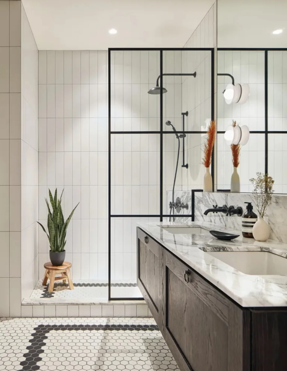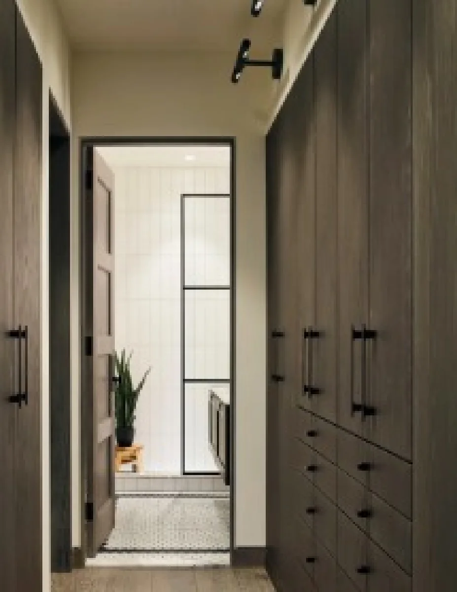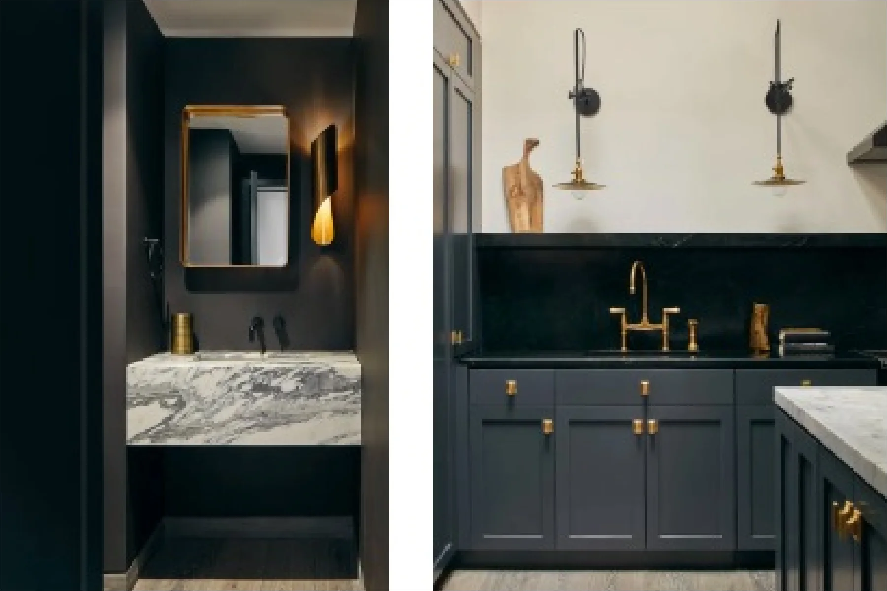 Transforming this high-ceilinged, exposed-pipe loft into an elegant apartment involved carefully selecting touches of domesticity and luxury. The kitchen walls showcase DF&A’s approach – industrial brick remains intact but is painted white, with the lower half adorned in wainscoting. Dominated by shades of gray, the kitchen serves as the focal point of the space, maintaining its industrial character with visible elements and a monochromatic palette. Subtle brass details add a touch of warmth, infusing the entire apartment with a sense of life.