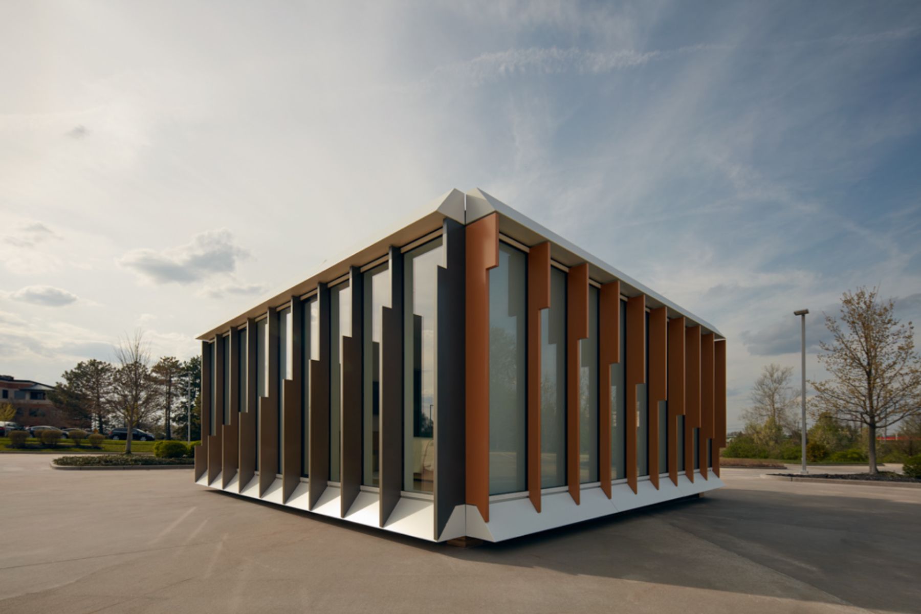 DF&A’s prototype hotel room for MiTek's modular initiative illustrates how modular technology can complement architectural design. This project proves that functionality and aesthetics can go hand in hand. The exterior showcases a sophisticated striped pattern of vertical fins that not only provide sunshade but also create visual depth, effectively concealing the connections between modules and reducing the bulky appearance typical of stacked designs.
