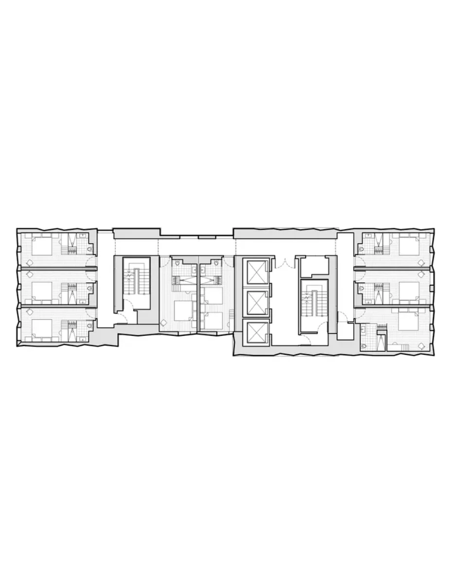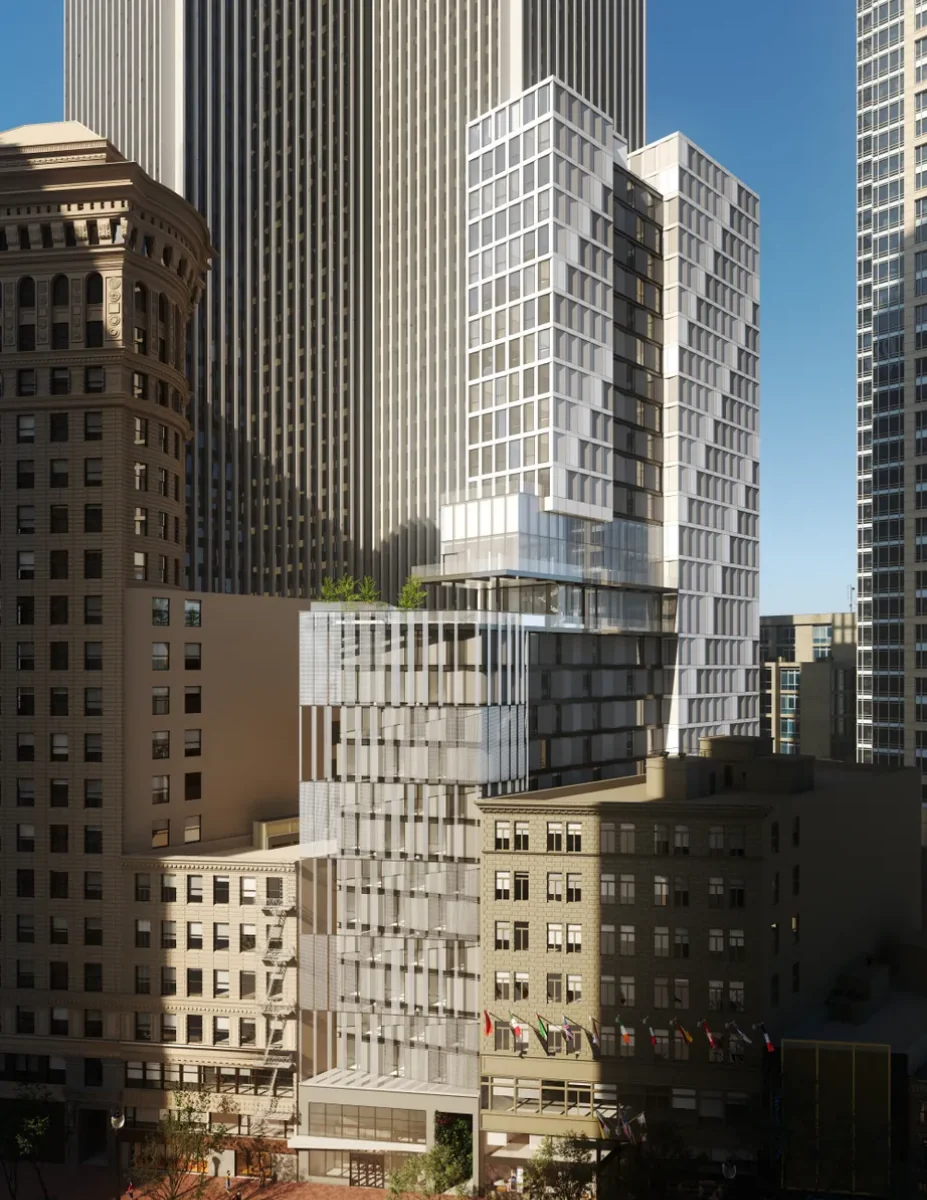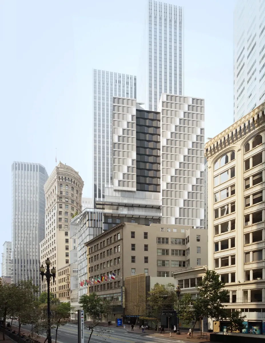 For the only high-rise modular tower in a high seismic zone in the US, DF&A’s primary focus is earthquake preparedness. However, the design goes beyond safety to create a distinctive yet harmonious presence. Situated between the historic Chancery and Finance Buildings, and near the Hobart Building by Willis Polk, DF&A aimed to blend in while standing out. To reduce its visual impact, DF&A divided the tower into four sections and crafted a façade that emphasises depth, shadow, and texture, mirroring the character of nearby structures with steel mesh in place of terra-cotta.