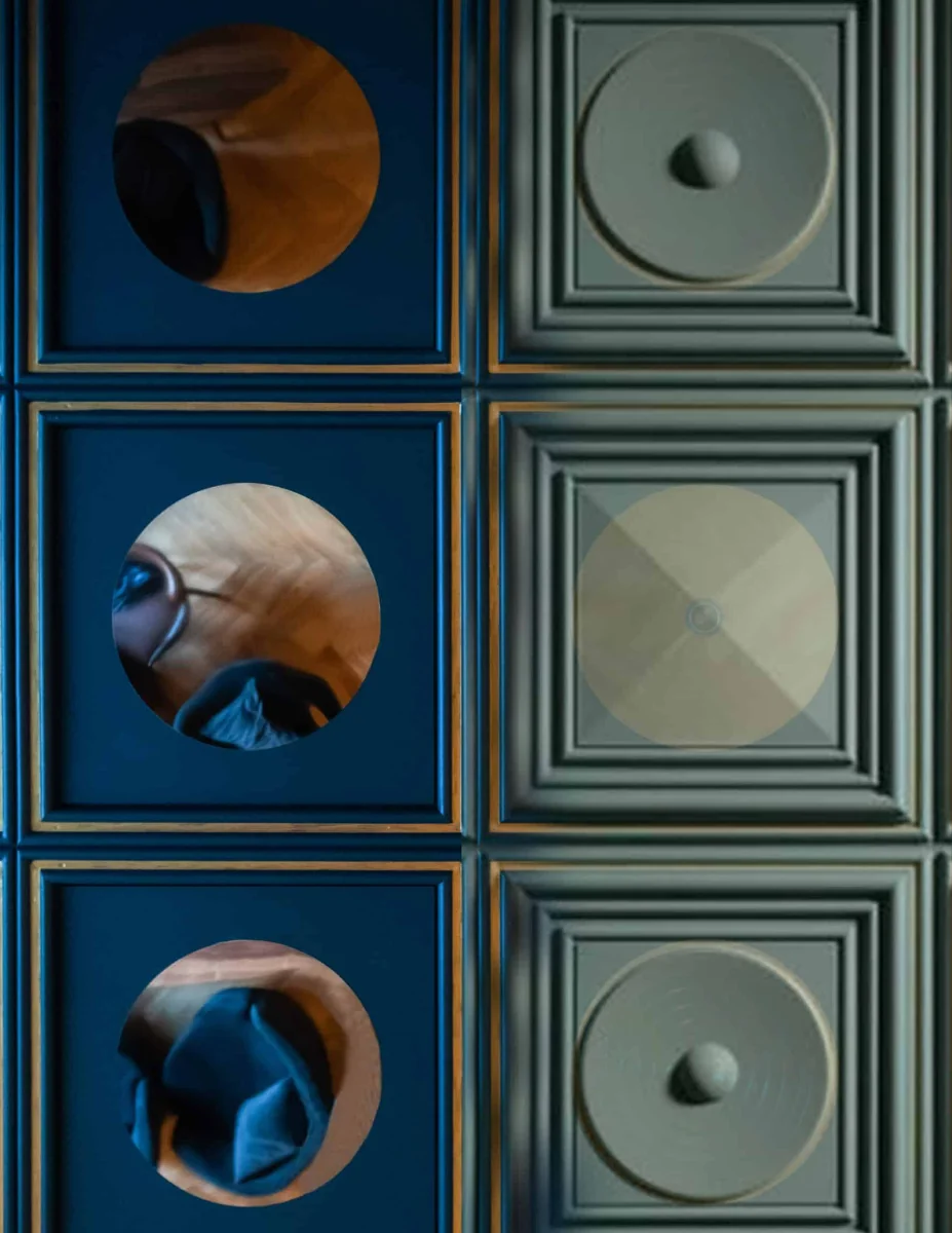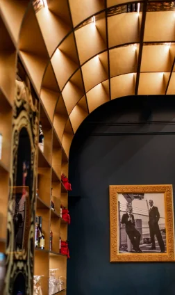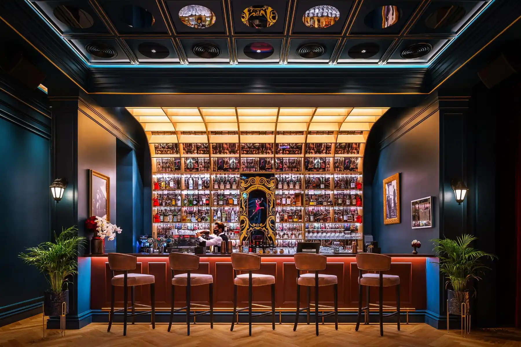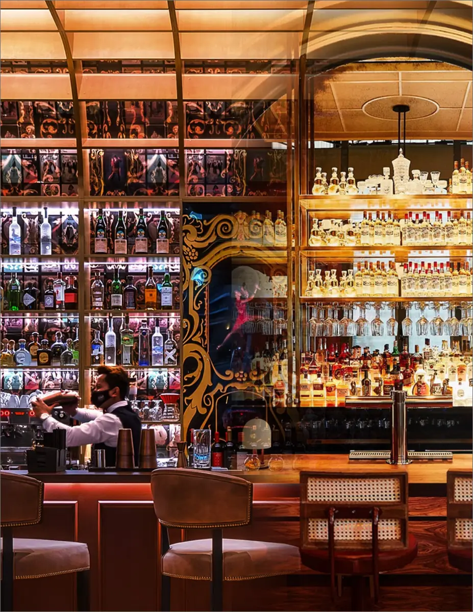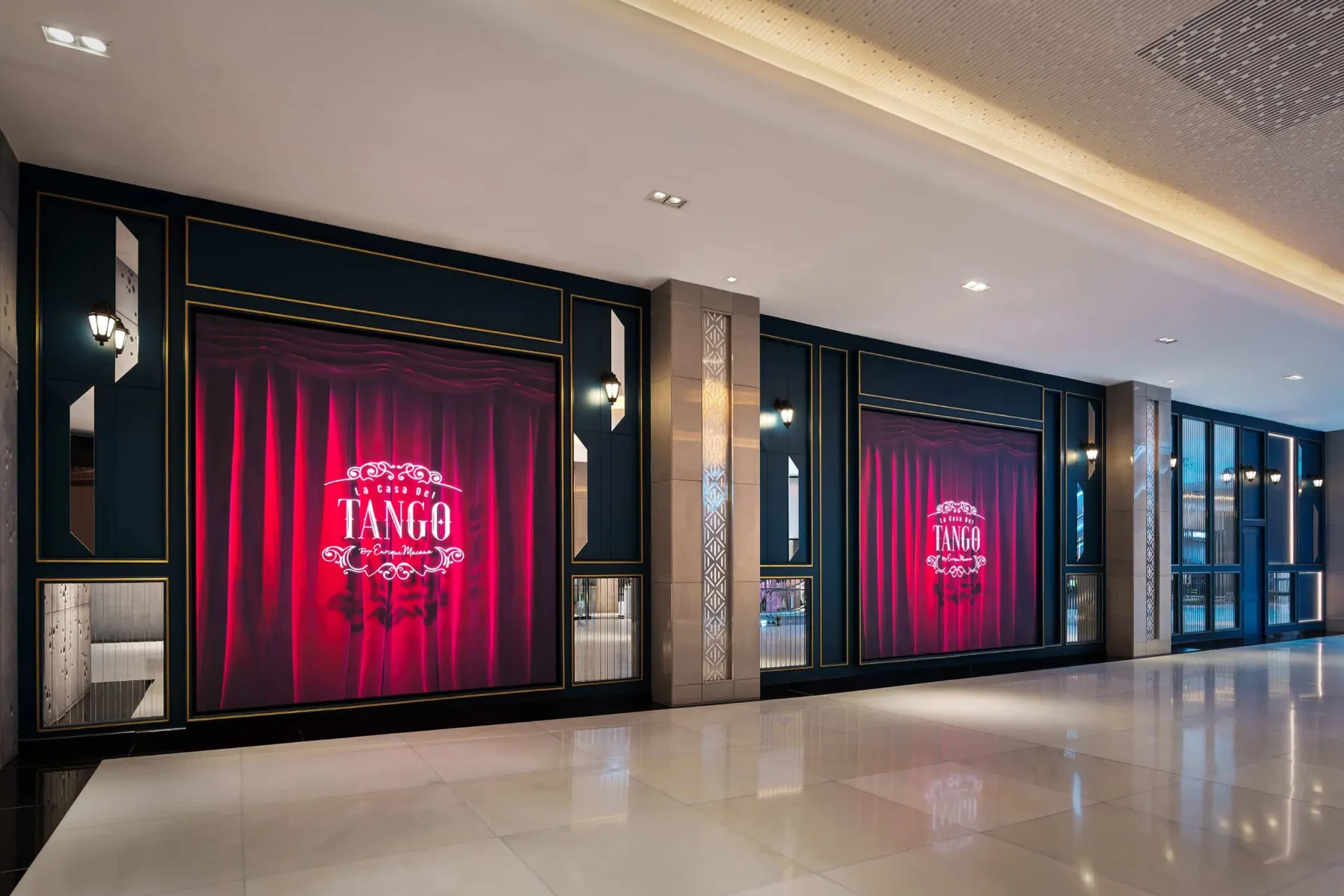 The bar, a central feature, boasts a brushed brass finish that wraps around the walls and ceiling in a striking waffle pattern. Various lighting elements, from street lanterns to chandeliers, create an intimate ambiance that enhances the mood of Tango while allowing flexibility for dining and performances. Additionally, embossed wallpaper on sliding panels serves as a flexible divider between the stage and dining area, enabling private classes without disrupting the restaurant's flow. Two large interactive screens on the mall's side invite pedestrians to engage with tango dance patterns, adding an inviting touch to the façade.