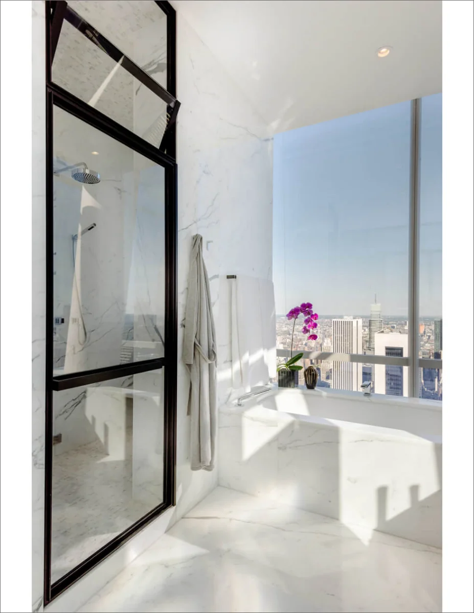 The Grand Salon includes a custom wet bar for large-scale entertaining. Adjacent is a windowed eat-in kitchen with Smallbone custom cabinets and state-of-the-art Miele appliances, offering views of the river and skyline. The corner master suite features stunning views, abundant sunlight, and a lavish windowed dressing room. Its en-suite bathroom includes radiant heated floors, a walk-in shower, a deep soaking tub, and marble slab finishes. Two additional bedroom suites also boast breathtaking views and en-suite bathrooms.