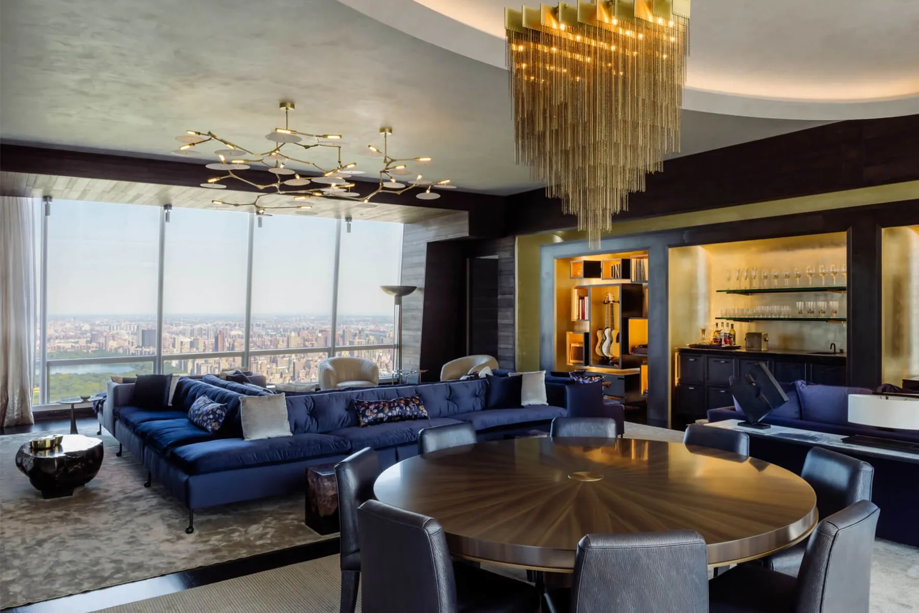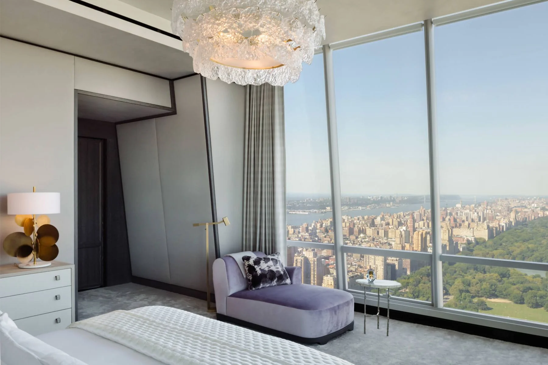 Located in the prestigious condominium on Billionaire's Row, this stylish contemporary home has been exquisitely upgraded, offering breathtaking views of Central Park, the Hudson River, and the Manhattan skyline. Featuring three bedrooms and three and a half bathrooms, it boasts soaring ceilings complemented by panoramic floor-to-ceiling windows. Upon entering, a picturesque windowed gallery with custom marble slab flooring welcomes you. The expansive Grand Salon, spanning over 42 feet, serves as the centerpiece for entertaining, showcasing captivating views and finished in Venetian plaster, ebonised solid white oak, and custom bronze paneling. A sculpted ceiling vault and hand-painted white gold leaf enhance its elegance.