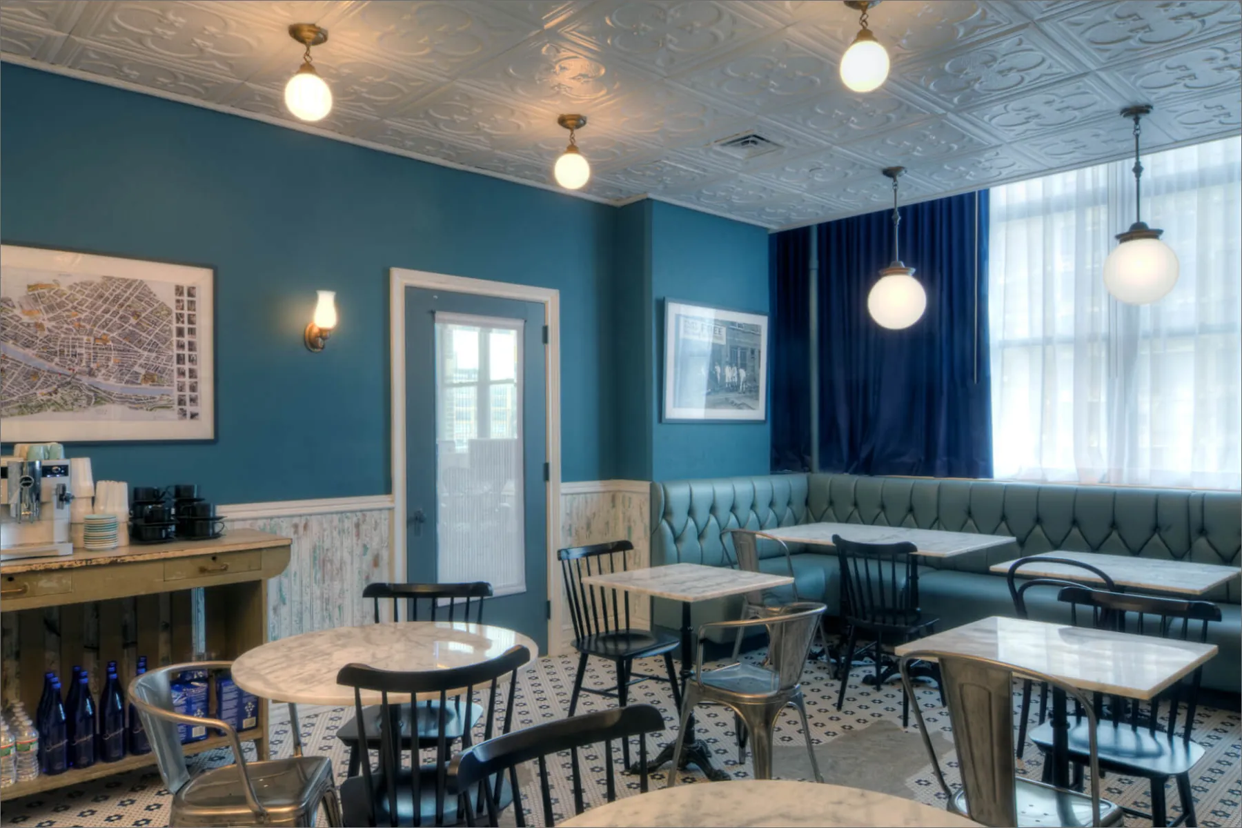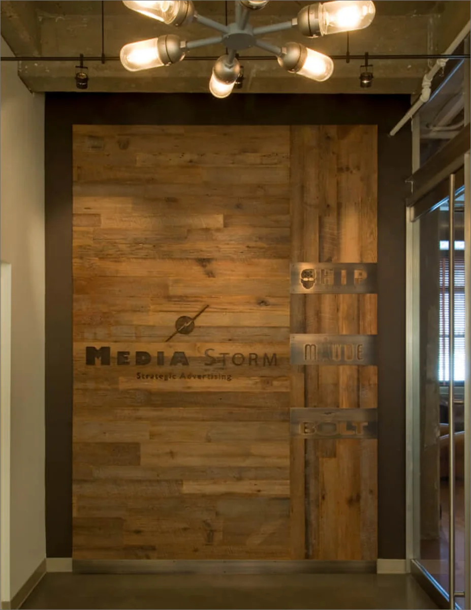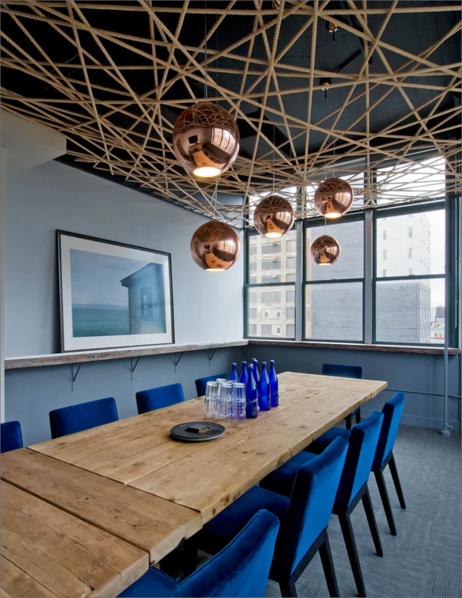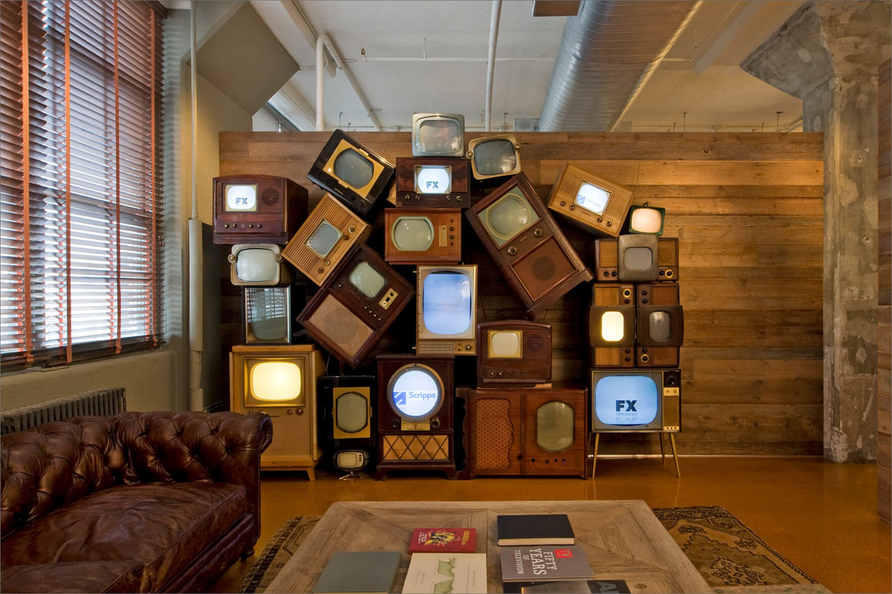 The space includes only one formal conference room, featuring an artist-installed rope ceiling. Emphasizing sustainability, the design incorporates vintage theater seats, a wall of salvaged TV sets, reclaimed barn wood, retained MEP systems, and eco-friendly finishes and furniture.
