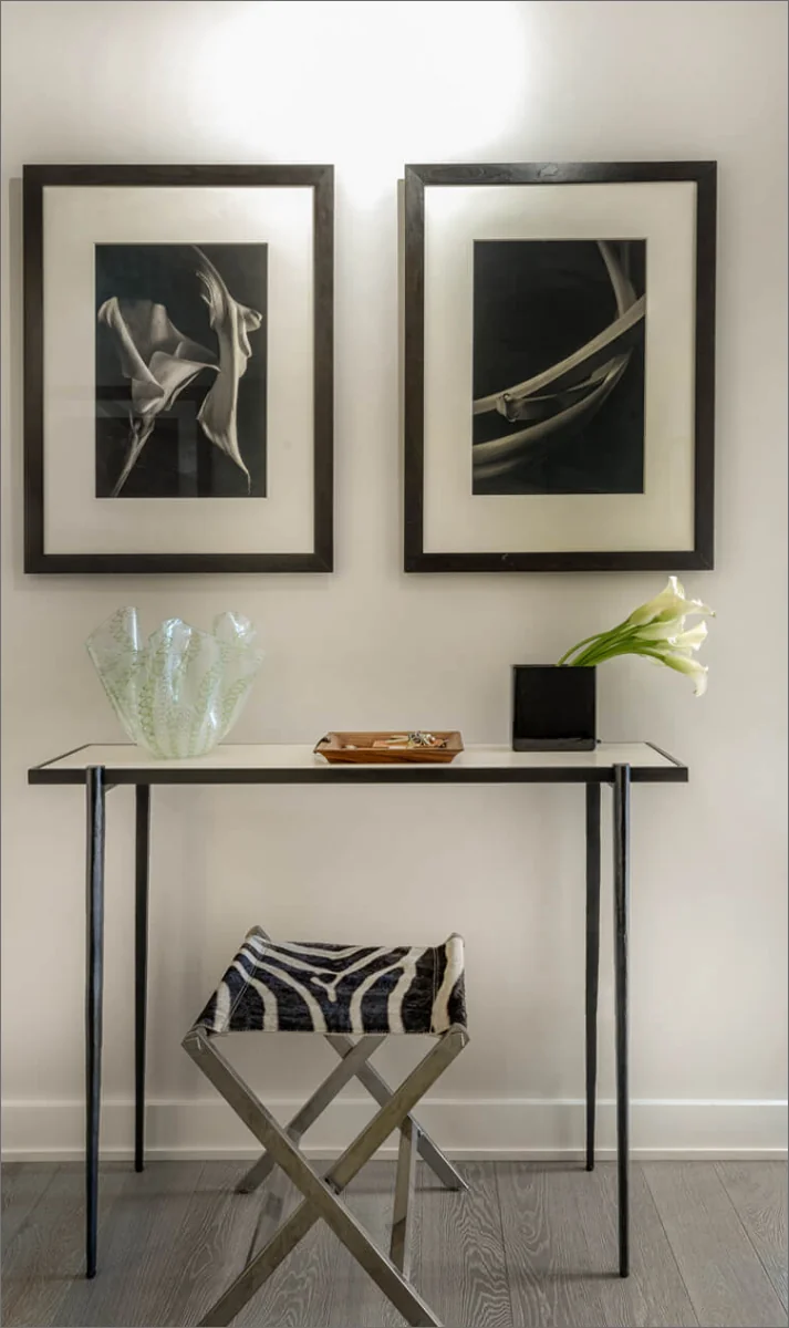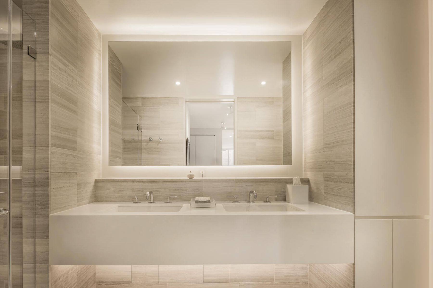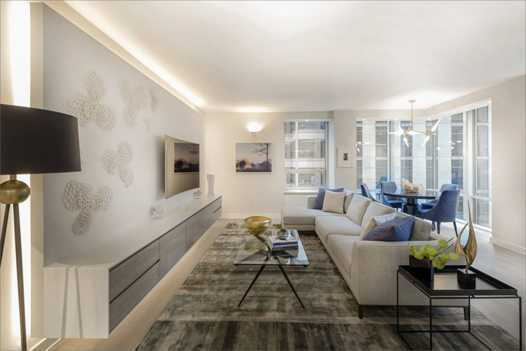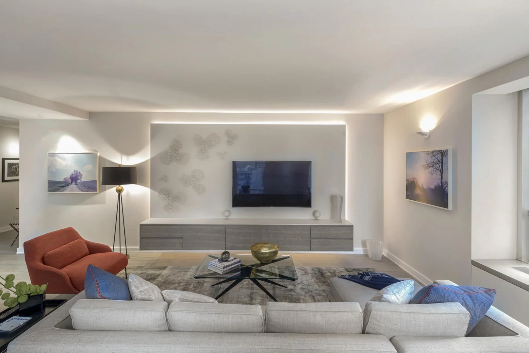 Minimalist custom millwork and architectural lighting enhance the view, while the sleek, sophisticated lines complement the streamlined decor. A classic neutral palette paired with bold modern furniture and chic accessories creates an ideal backdrop for the clients’ curated art collection.