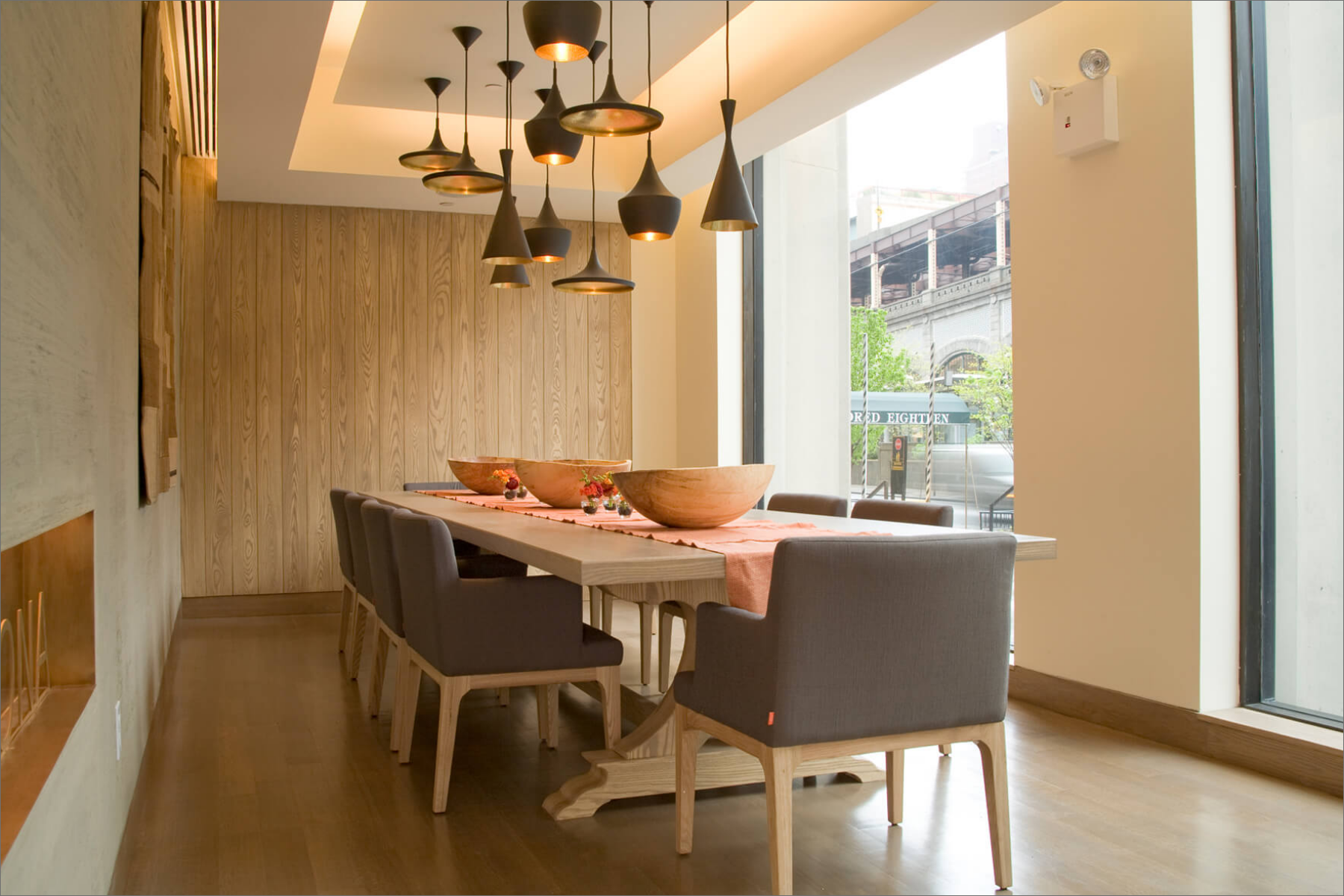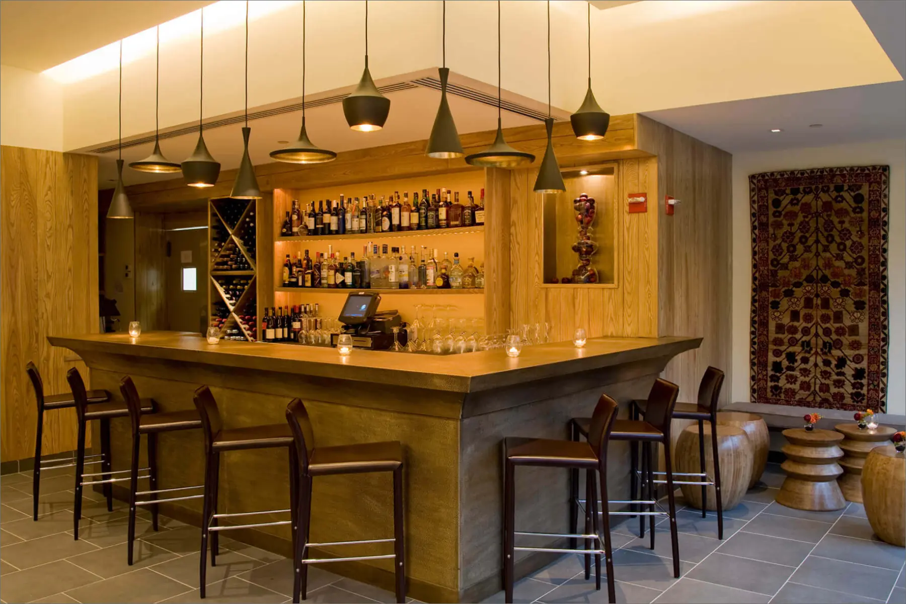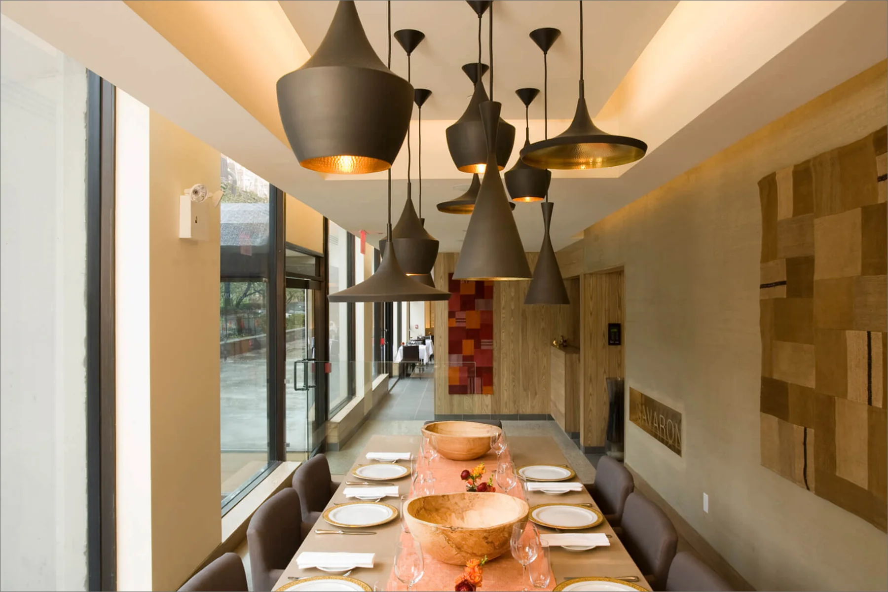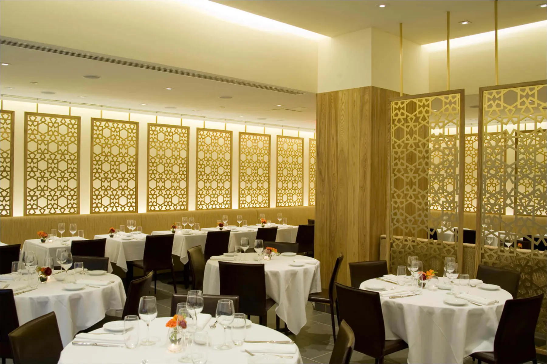Savarona Restaurant on the Upper East Side embodies a clean, modern aesthetic infused with elements of Turkish culture and cuisine. The design features laser-cut screens and hammered copper surfaces, all set against a restrained palette of materials and colours. This combination of intricate textures on a subtle background achieves a harmonious balance between contemporary style and traditional influences.