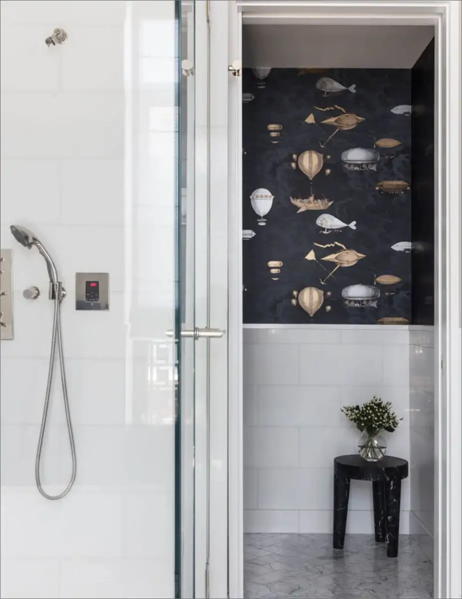 The master bathroom’s water closet is a standout, adorned with whimsical Fornasetti wallpaper and a black marble stool. Despite the masculine color scheme, the soft materials, silk rugs, and window treatments create a warm and welcoming atmosphere throughout the apartment.