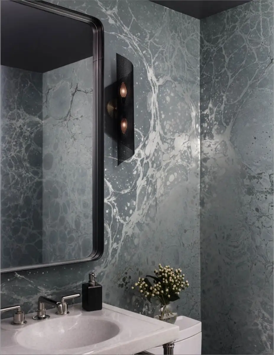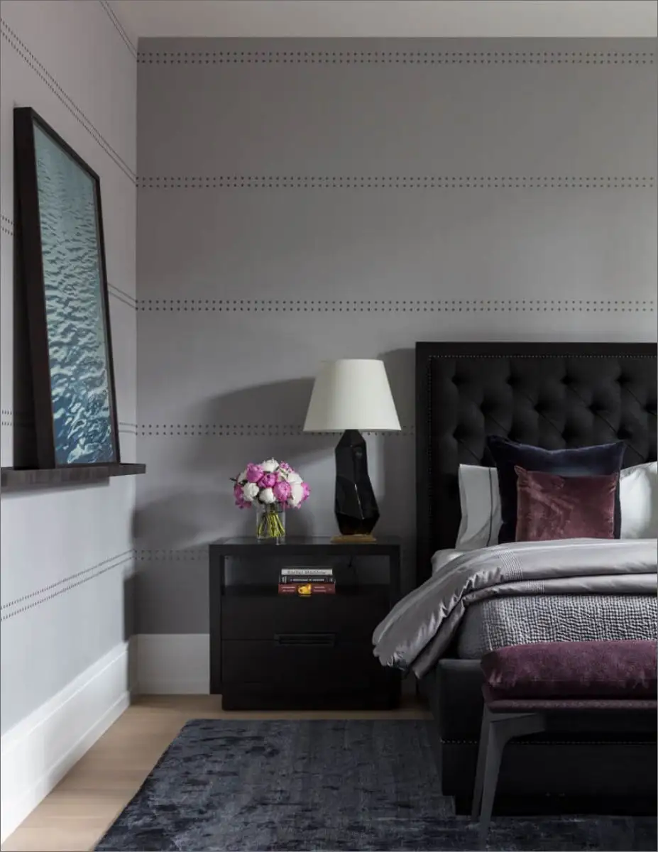 The powder bathroom features expressive wallpaper and a black leather studded mirror for an unexpected touch. In the master bedroom, deep blues and purples are complemented by custom silver-grey textured wallpaper.