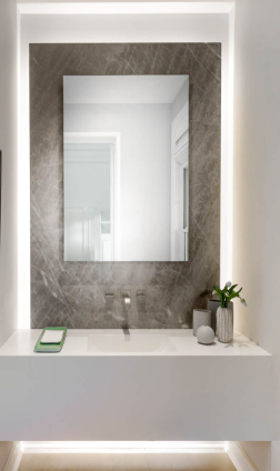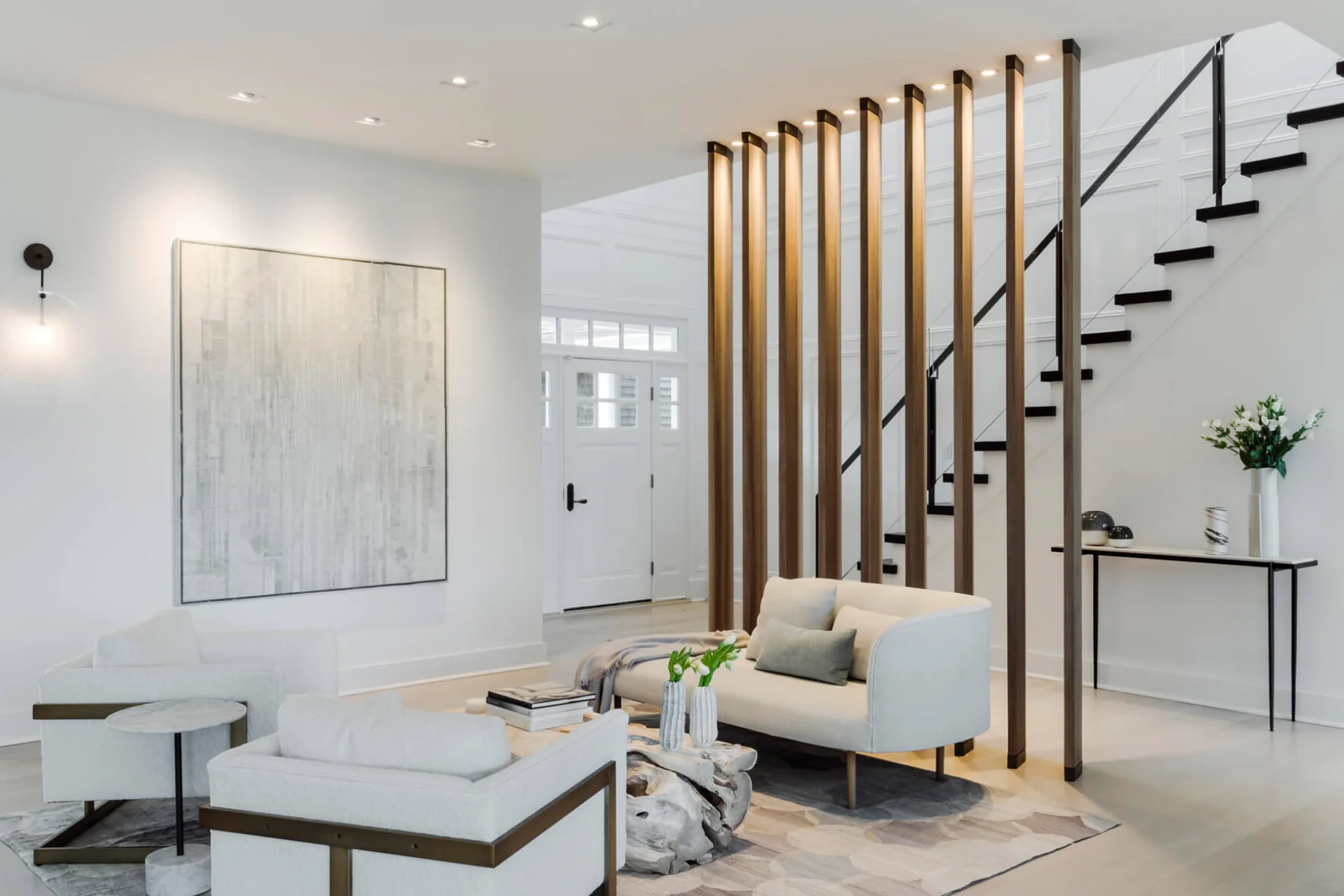 A full-height sliding glass window system enhances the connection to the outdoor decks and pool, offering unobstructed views and blurring the lines between indoor and outdoor spaces. A new sitting area was added between the dining room and stairs, separated by a screen of vertical fins that provide comfort while maintaining openness. The redesigned staircase features elegant new treads and a metal and glass handrail, reducing visual noise and reflecting light, perfectly complementing the home's sophisticated aesthetic.