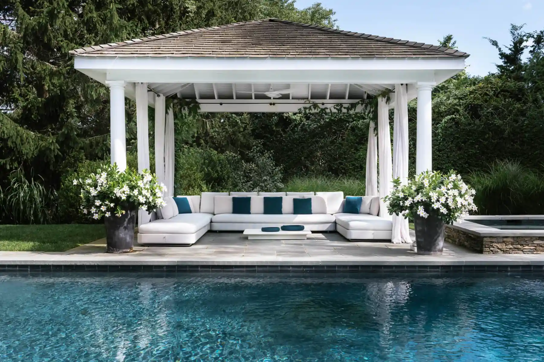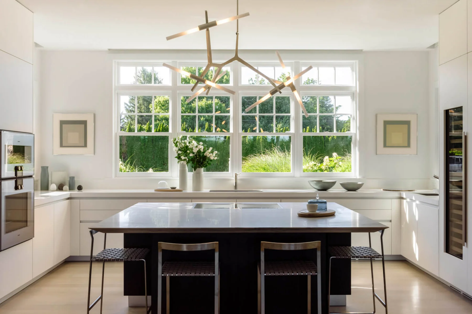 The Watermill House exemplifies classic Hamptons wood shingle style, maintaining its exterior character while transforming the interiors into an open, airy retreat for a busy family. Nestled on a one-acre lot surrounded by tall hedges, mature trees, and hydrangeas, the home's design was influenced by its landscape. To enhance flow and views, walls were removed and the kitchen was relocated to the front, creating an open-plan layout. The practical yet beautiful U-shaped kitchen features modern appliances, white cabinetry, Corian countertops, and a striking island with a marble top.