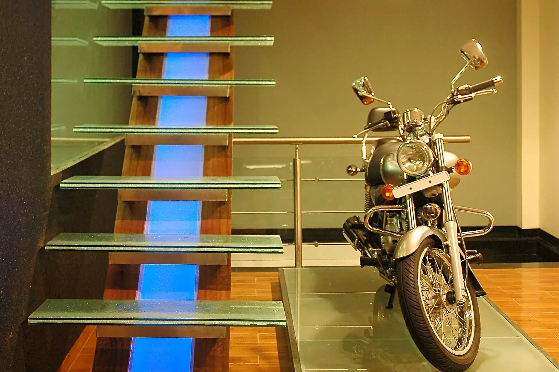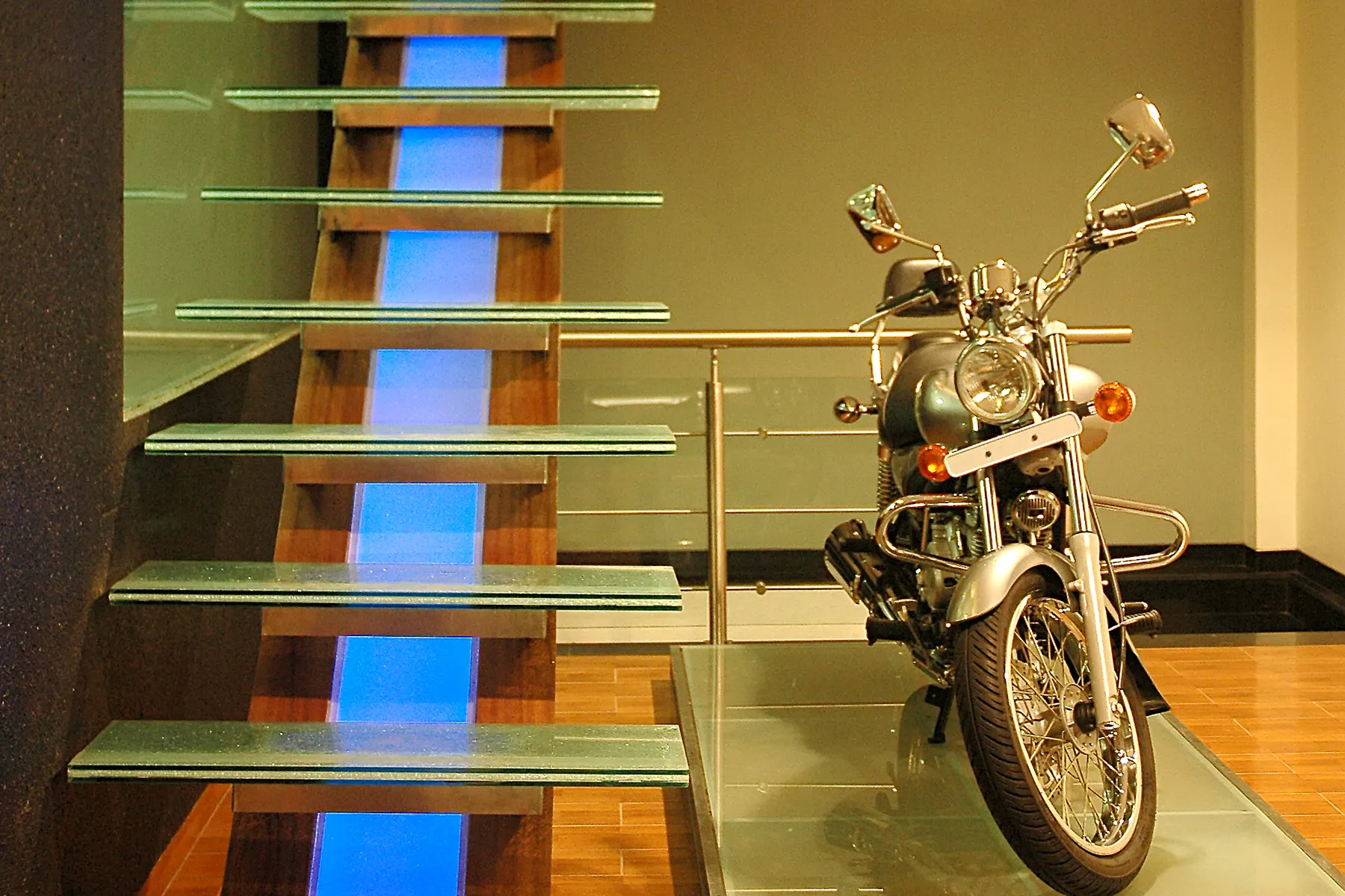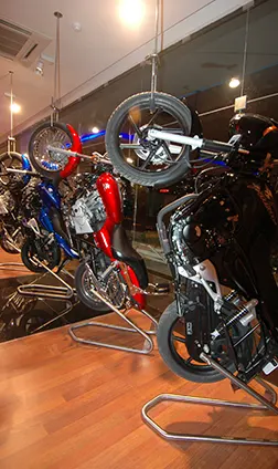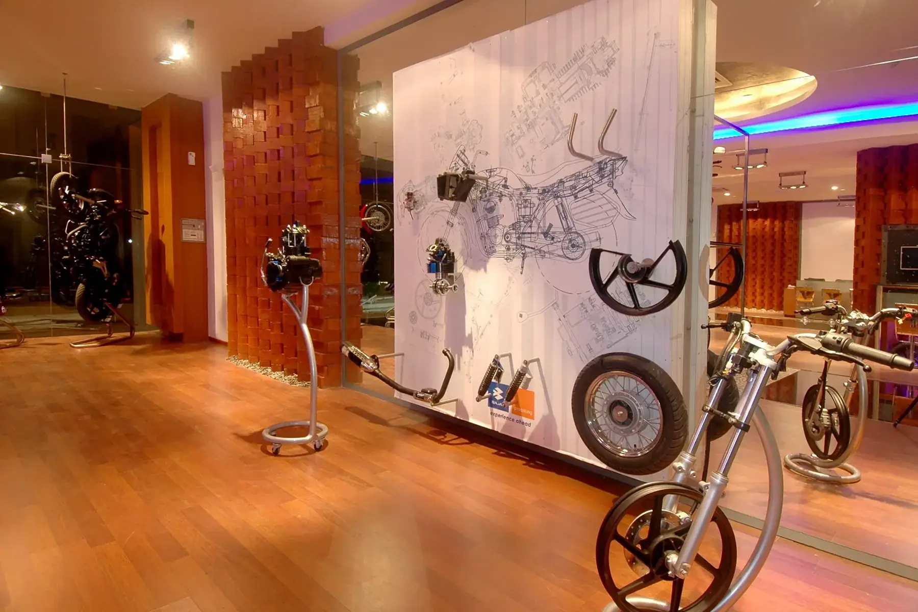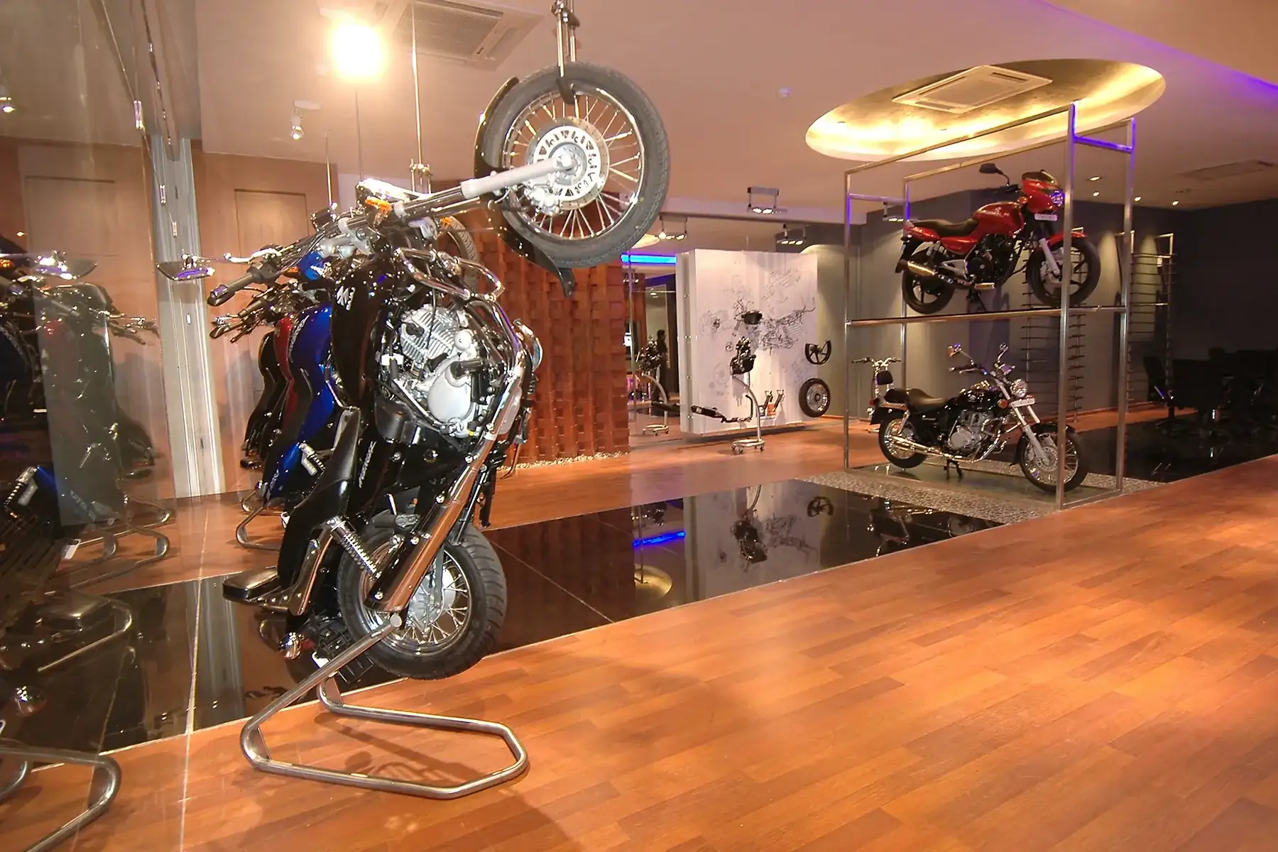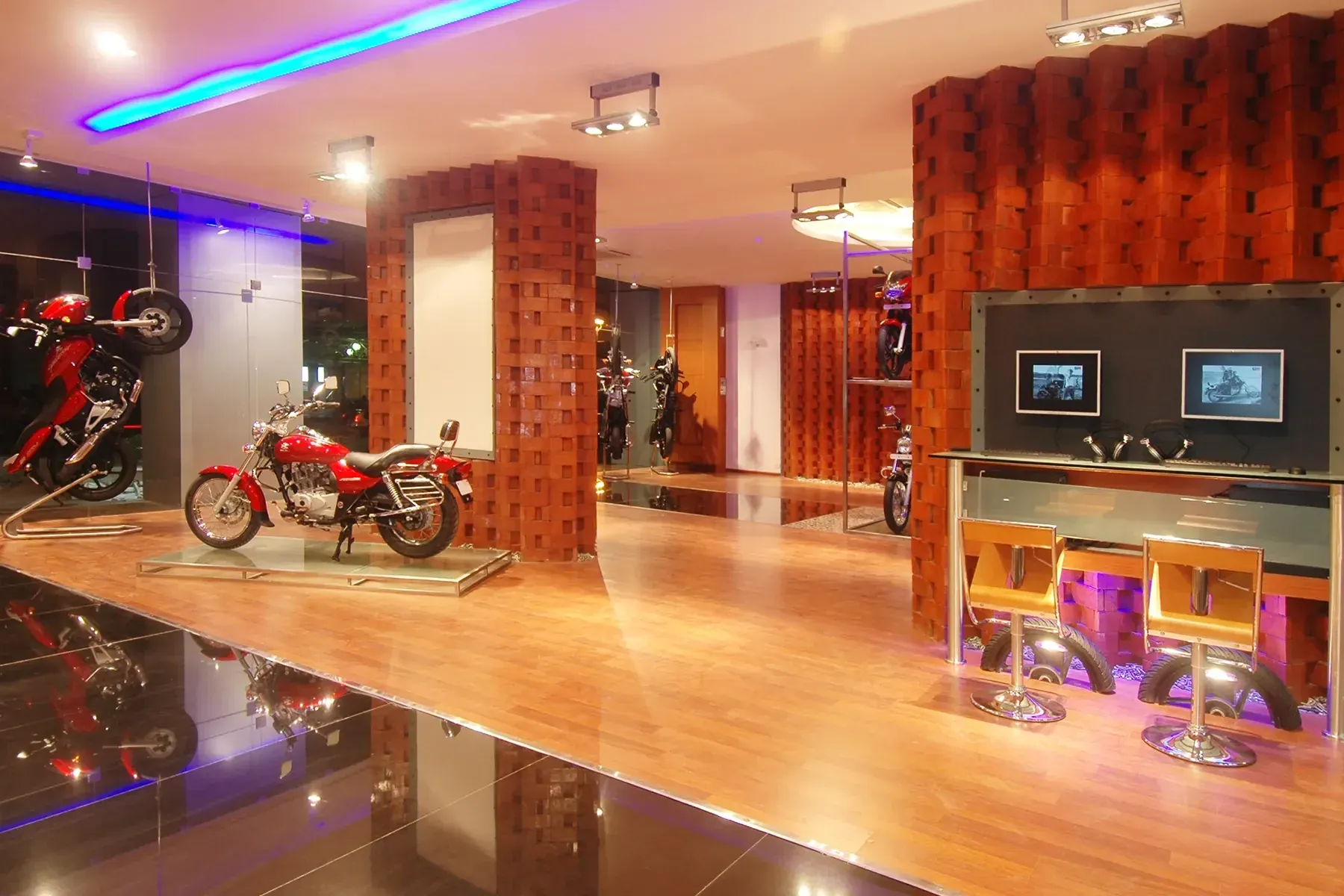 The retail outlets were conceptualised using space as a medium to communicate the brand and turn the retail environment into a manifestation of the strength that is Brand Bajaj. Jimmy Mistry used choreographed resonant experiences of the brand such as tires, silencers, and such for the customer to get completely immersed in the dynamic displays and interactive environment available on offer.