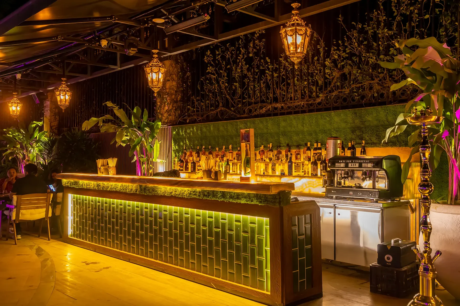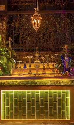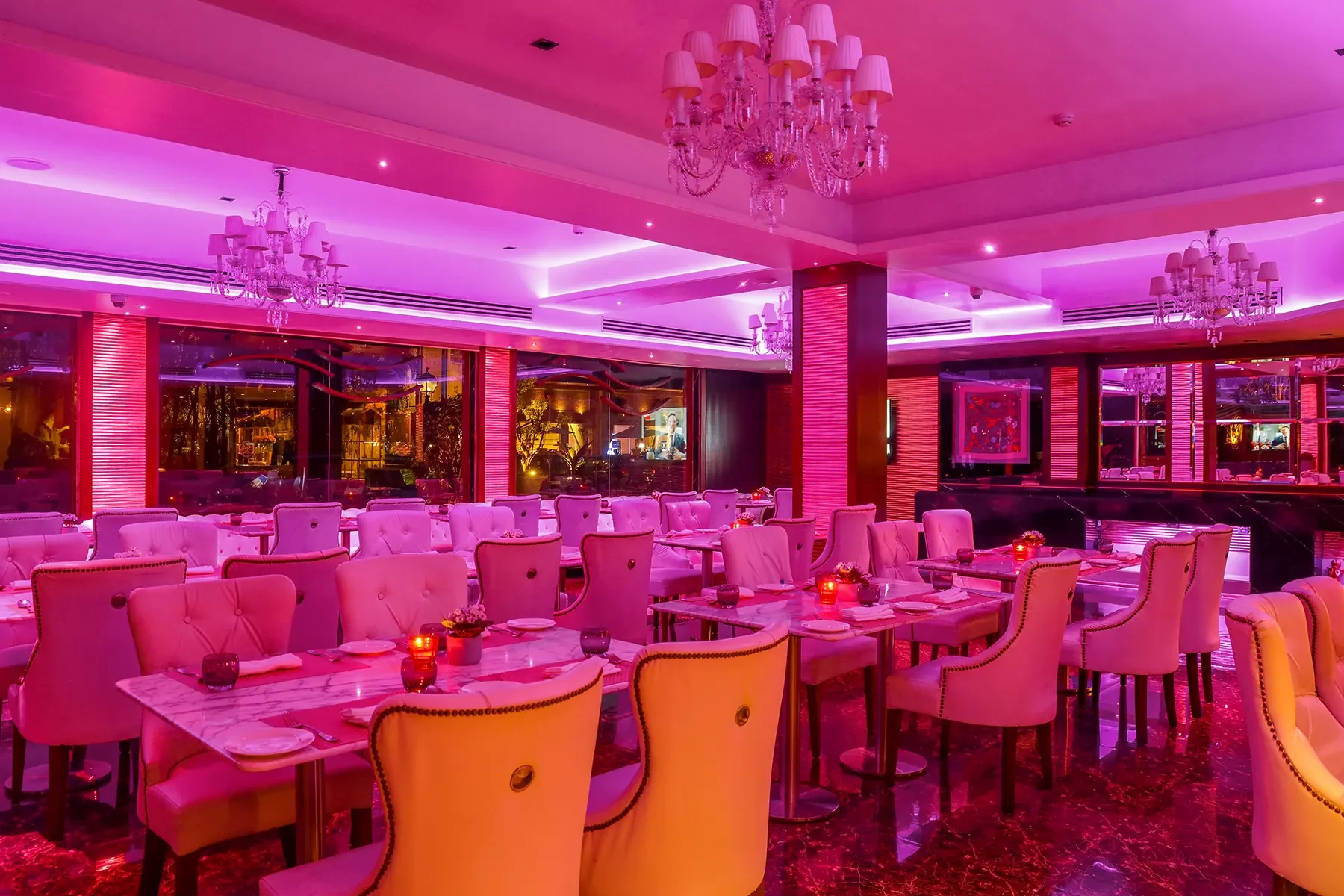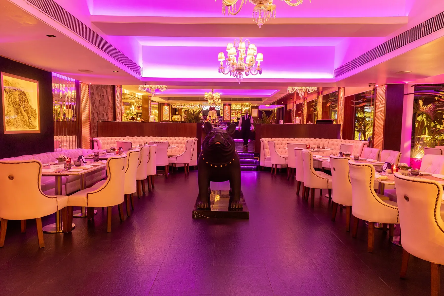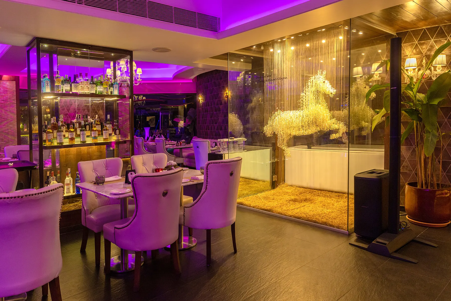 The restaurant overlooks the cooling crystal blue waters of the swimming pool bringing with it a calming and eclectic vibe to your meals. The décor is further accentuated by a Swarovski bejeweled crystal horse that takes centre stage along with muted lighting, from recessed ceiling alcoves and chandeliers.