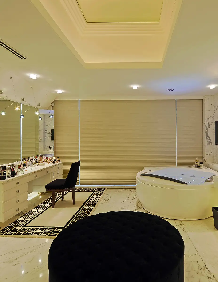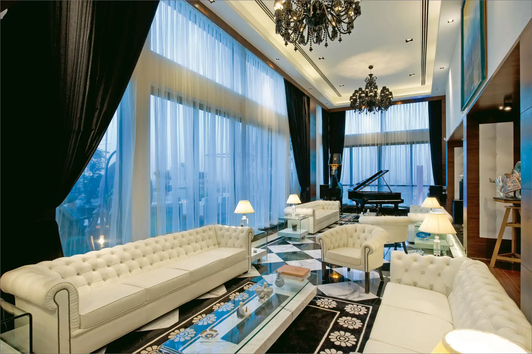 Iranian marble, glazed mosaic, colours that highlight Persian architectural motifs, and plush luxury panels all come together to anoint this gorgeous Villa in the Sky across 5 unique storeys. The private residence is dotted with beautiful furniture, the finest artifacts, and quality furnishings from across the globe.