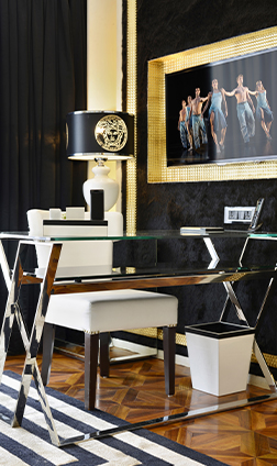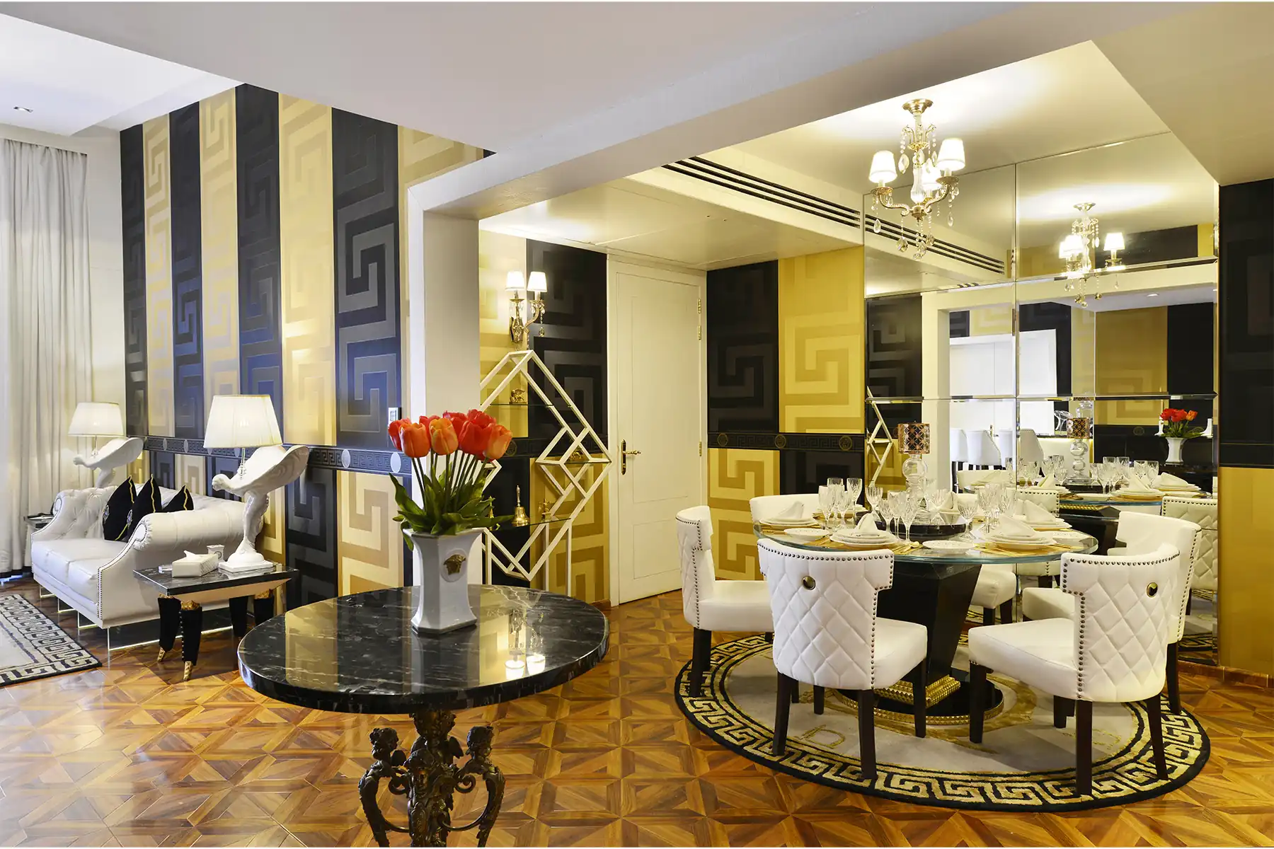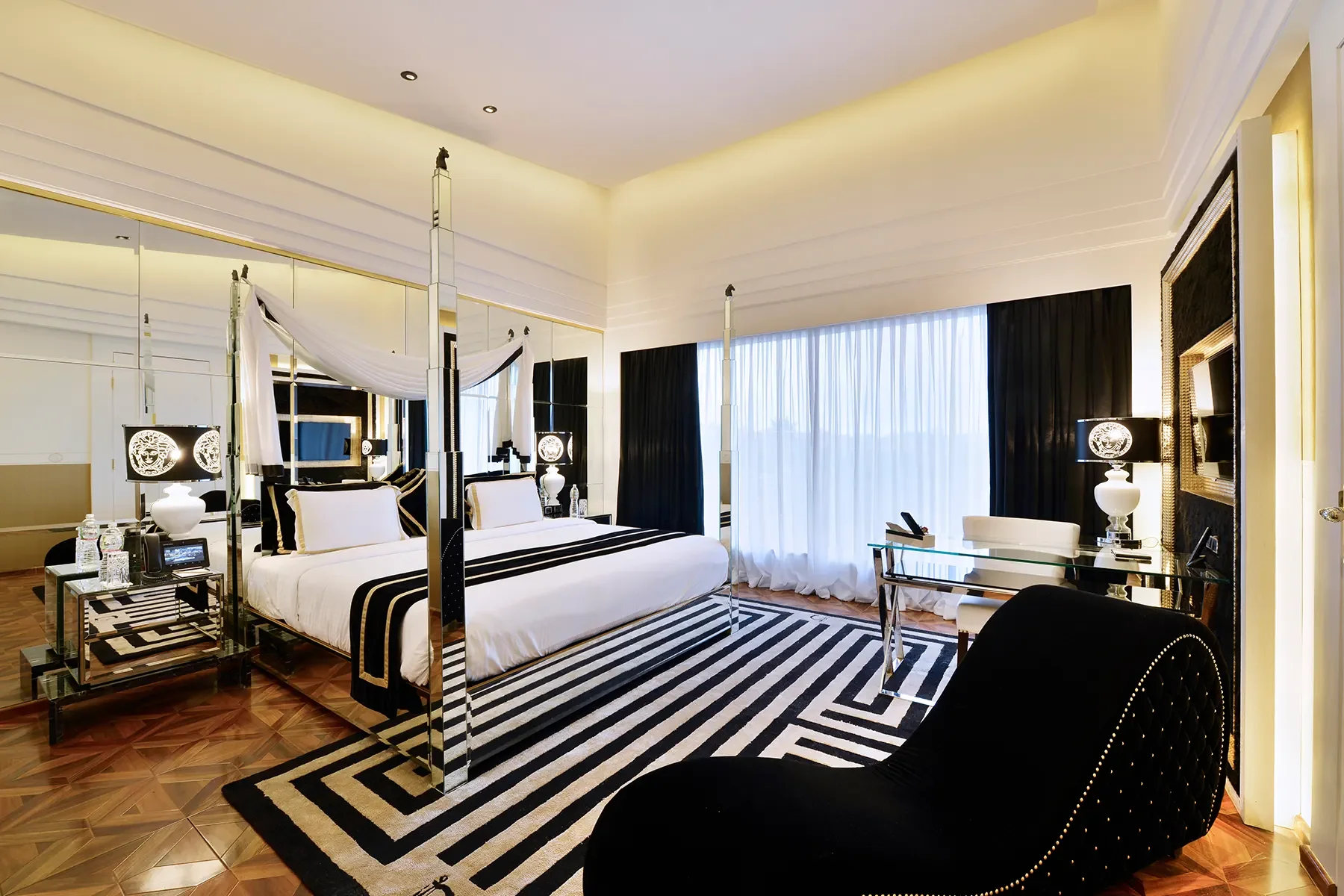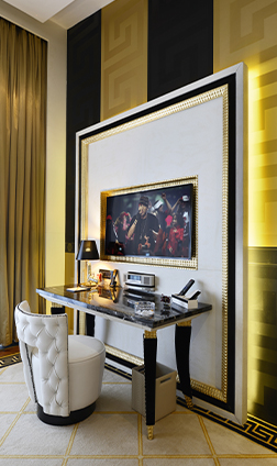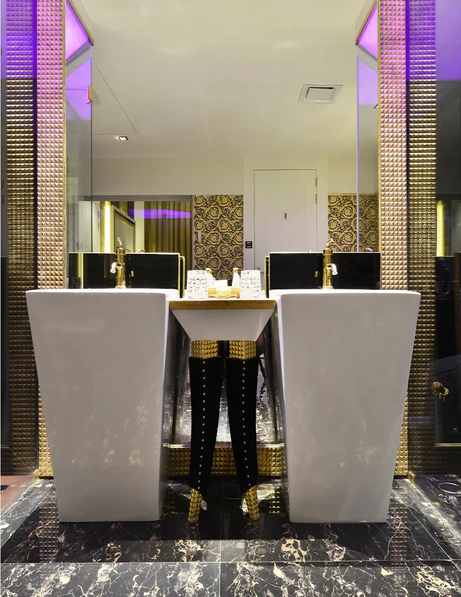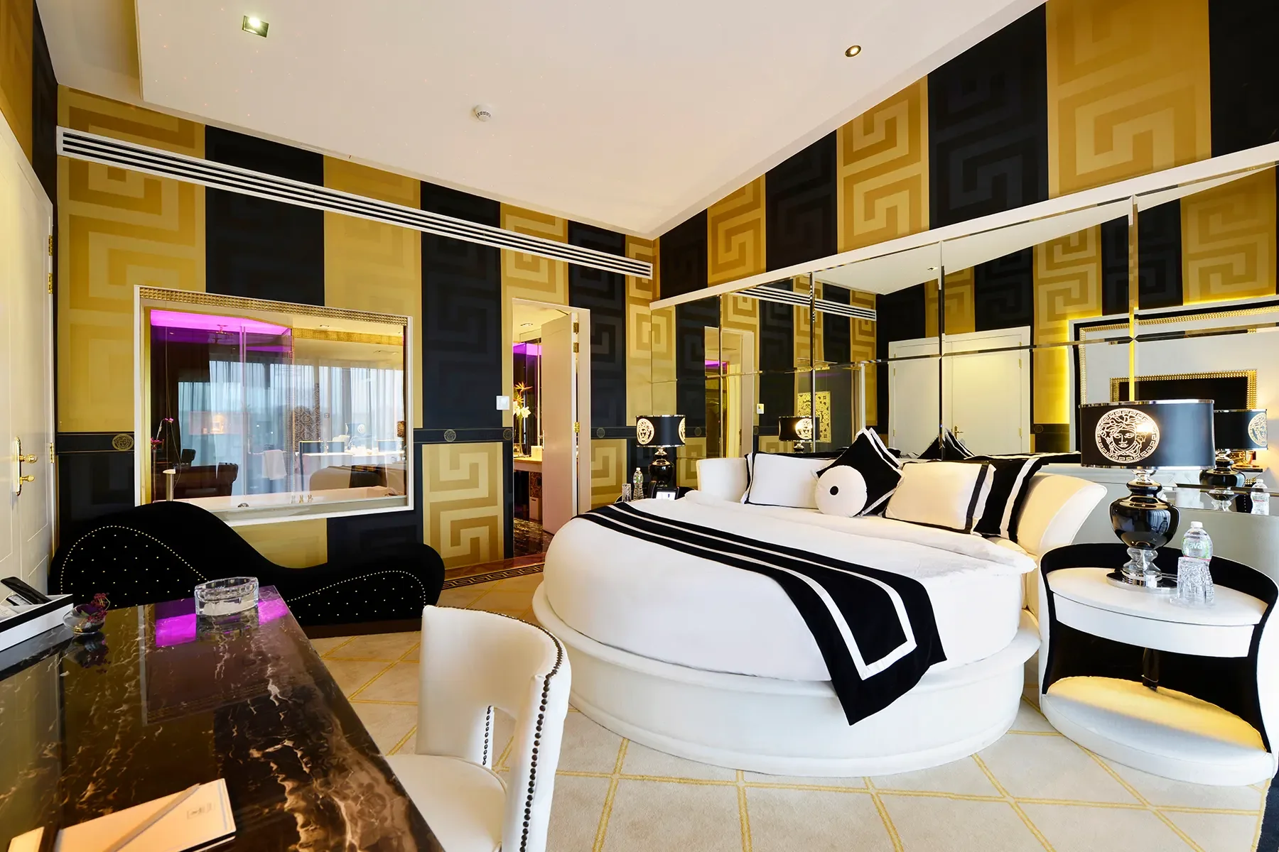 As soon as you enter the spacious 2400 sq. feet Jimmy Mistry - designed Presidential Suite, you are faced with a lavish foyer opening to a living room featuring an electric fireplace, a sunken full-service bar adjoined by Chef's table that seats six guests, where you can relish the finest culinary experiences. The design features decadent, indulgent touches such as the round, king-size water bed in one bedroom, and the mirrored, four-poster bed in the second bedroom, complete with original Versace and Lladro adornments.