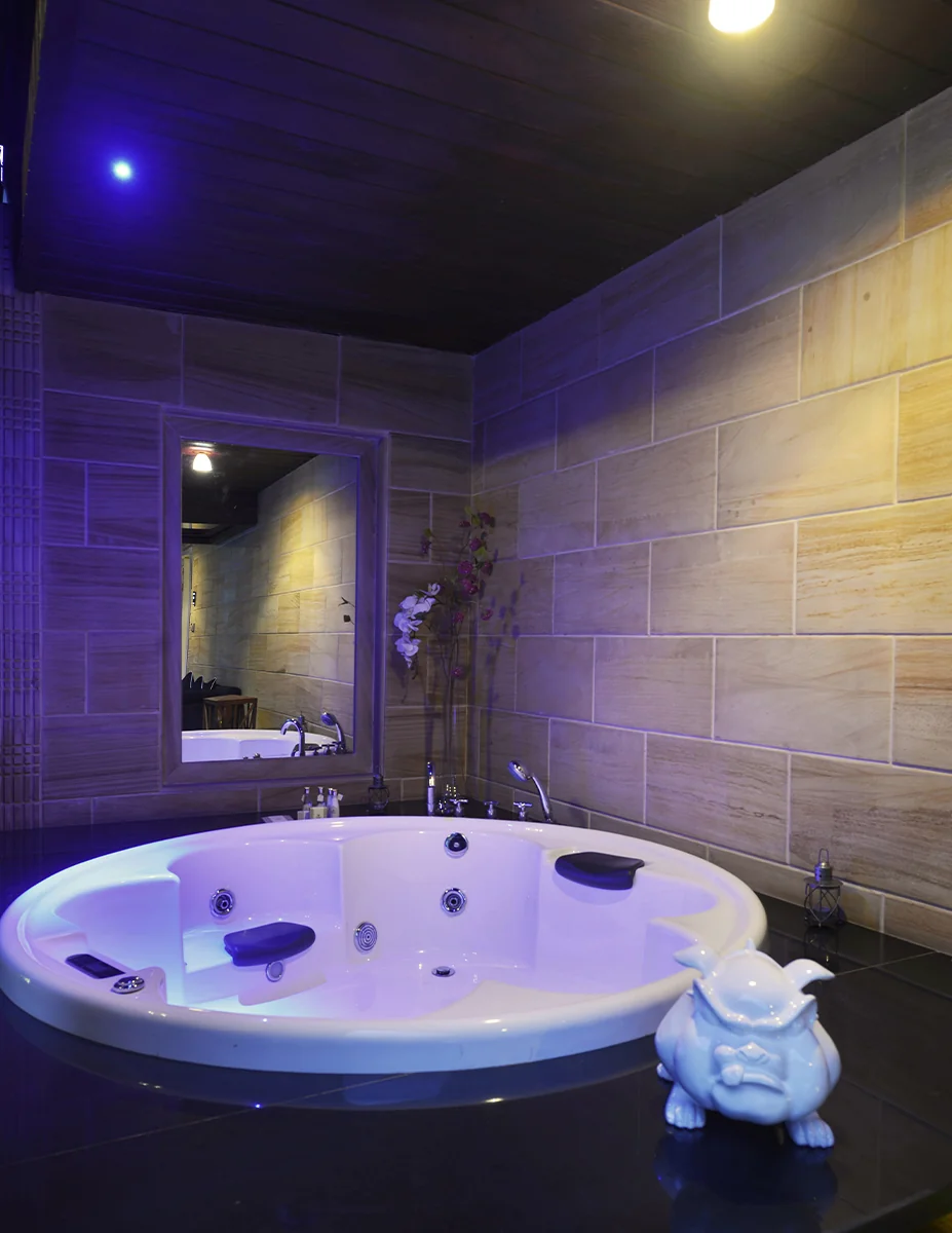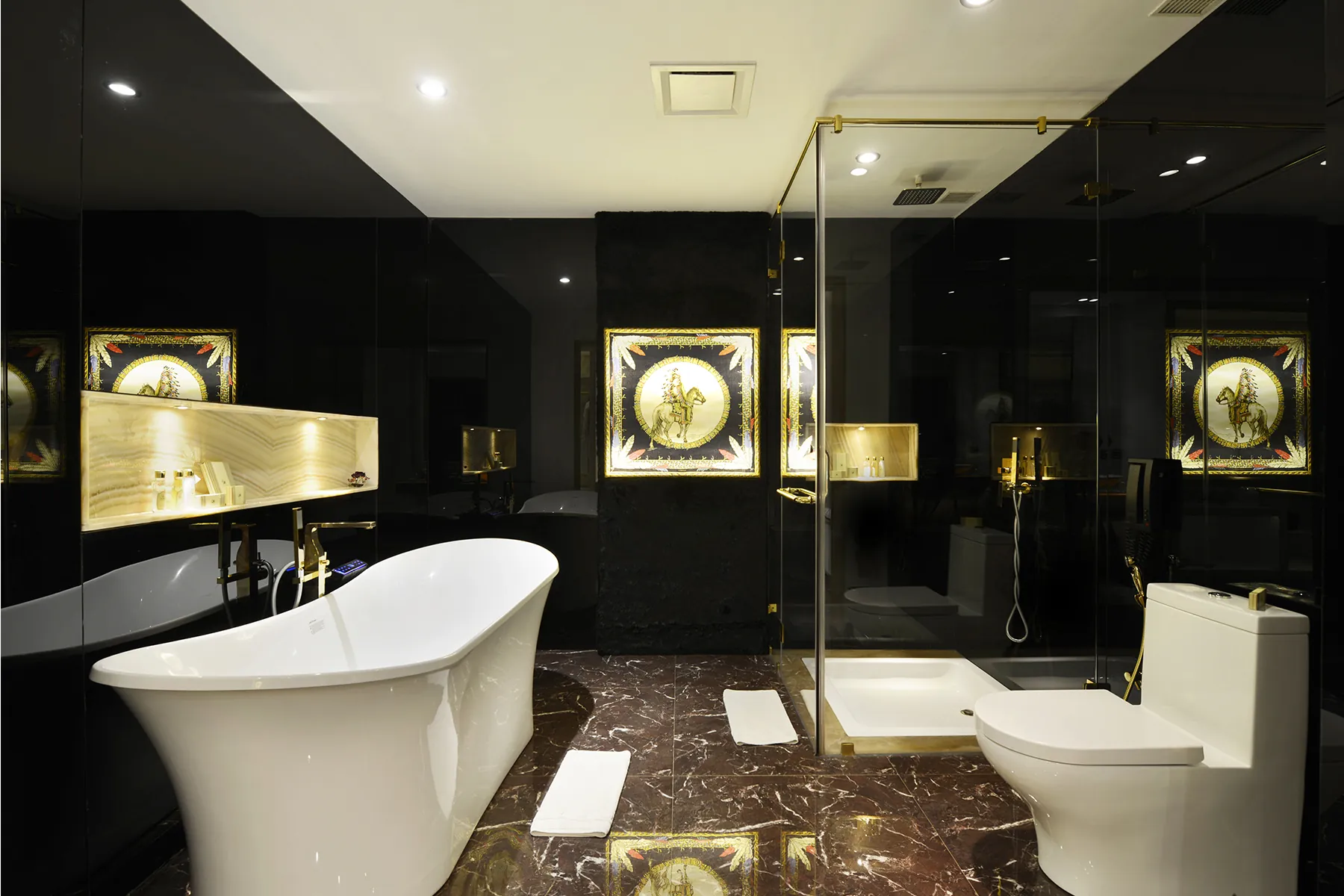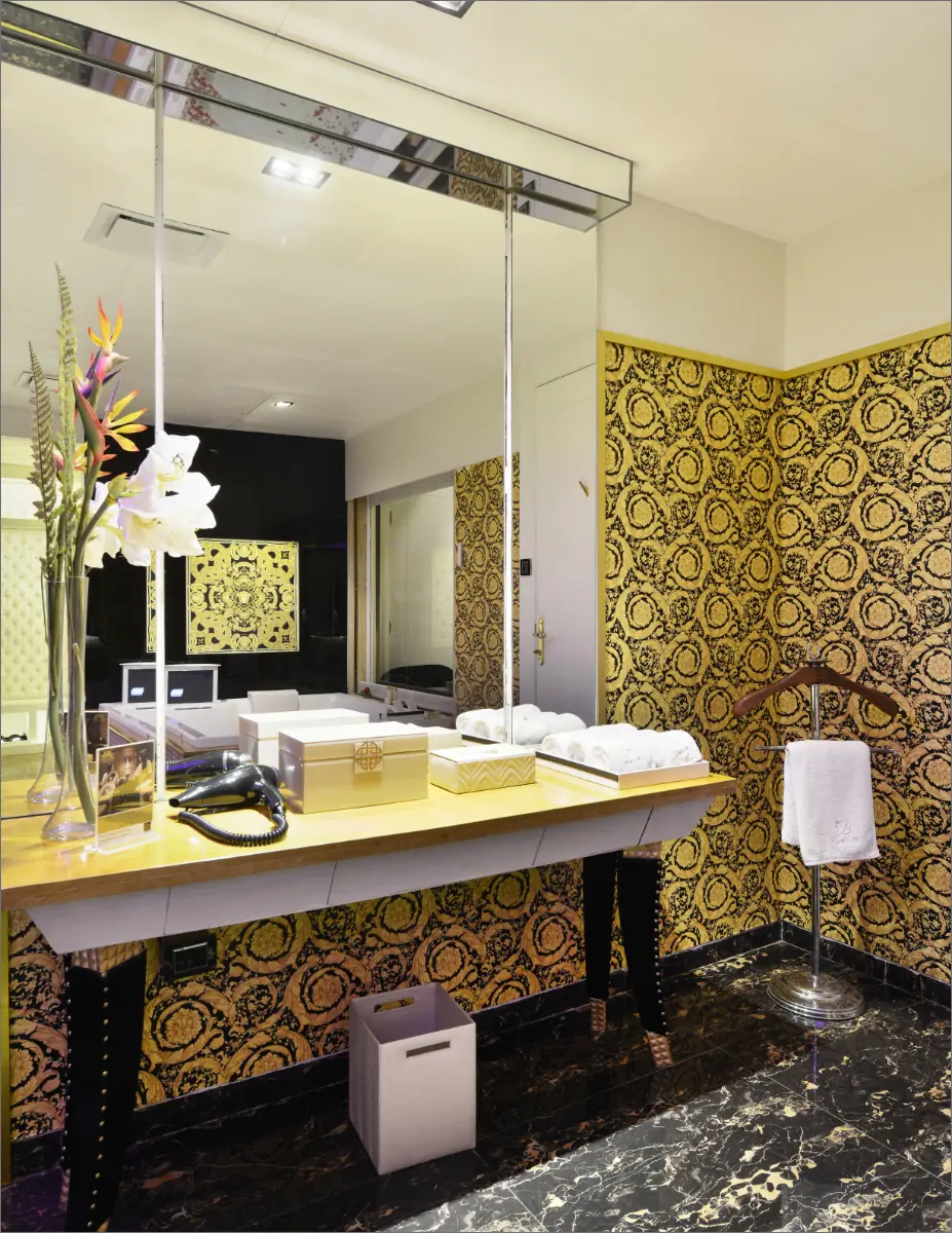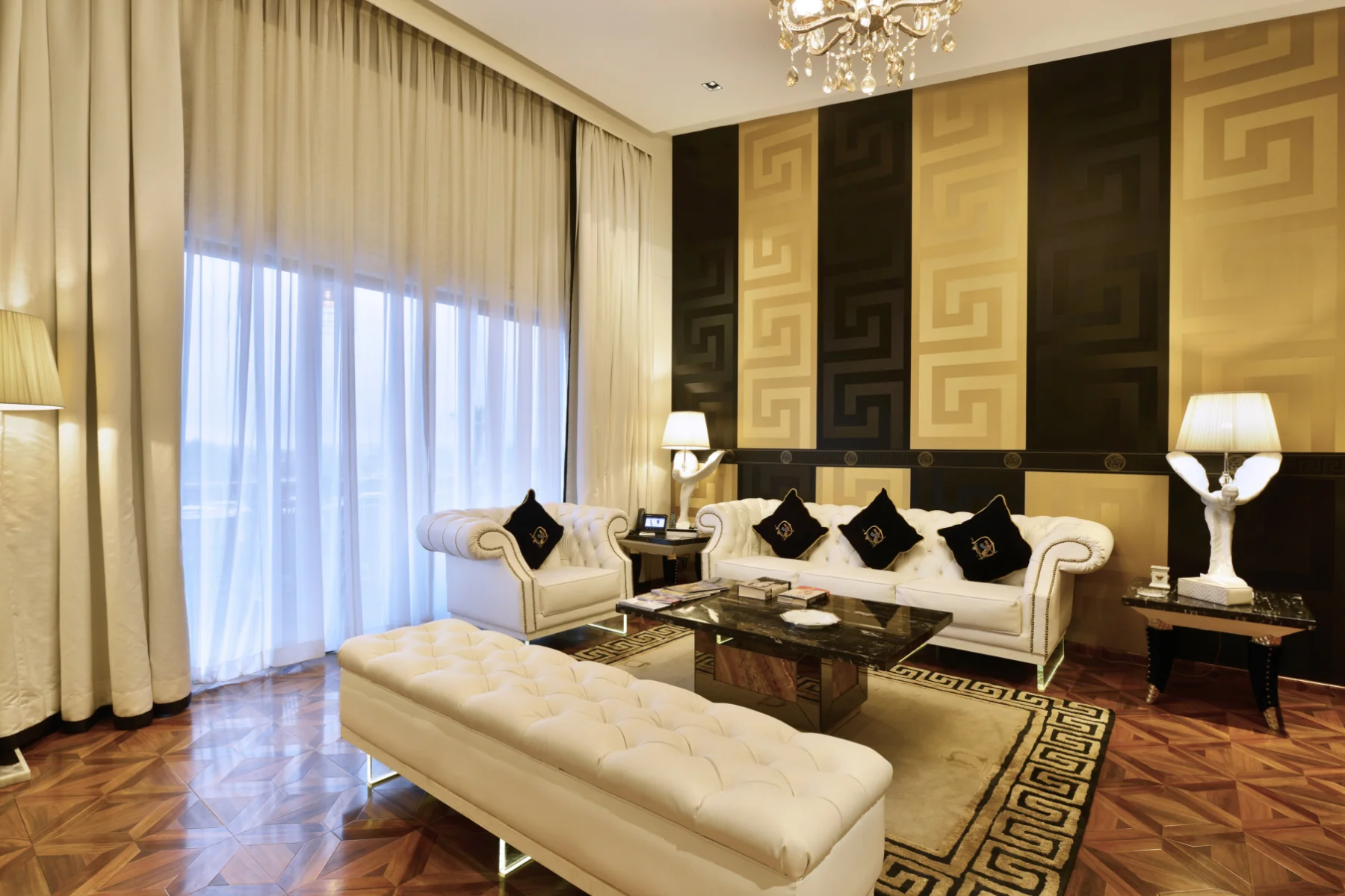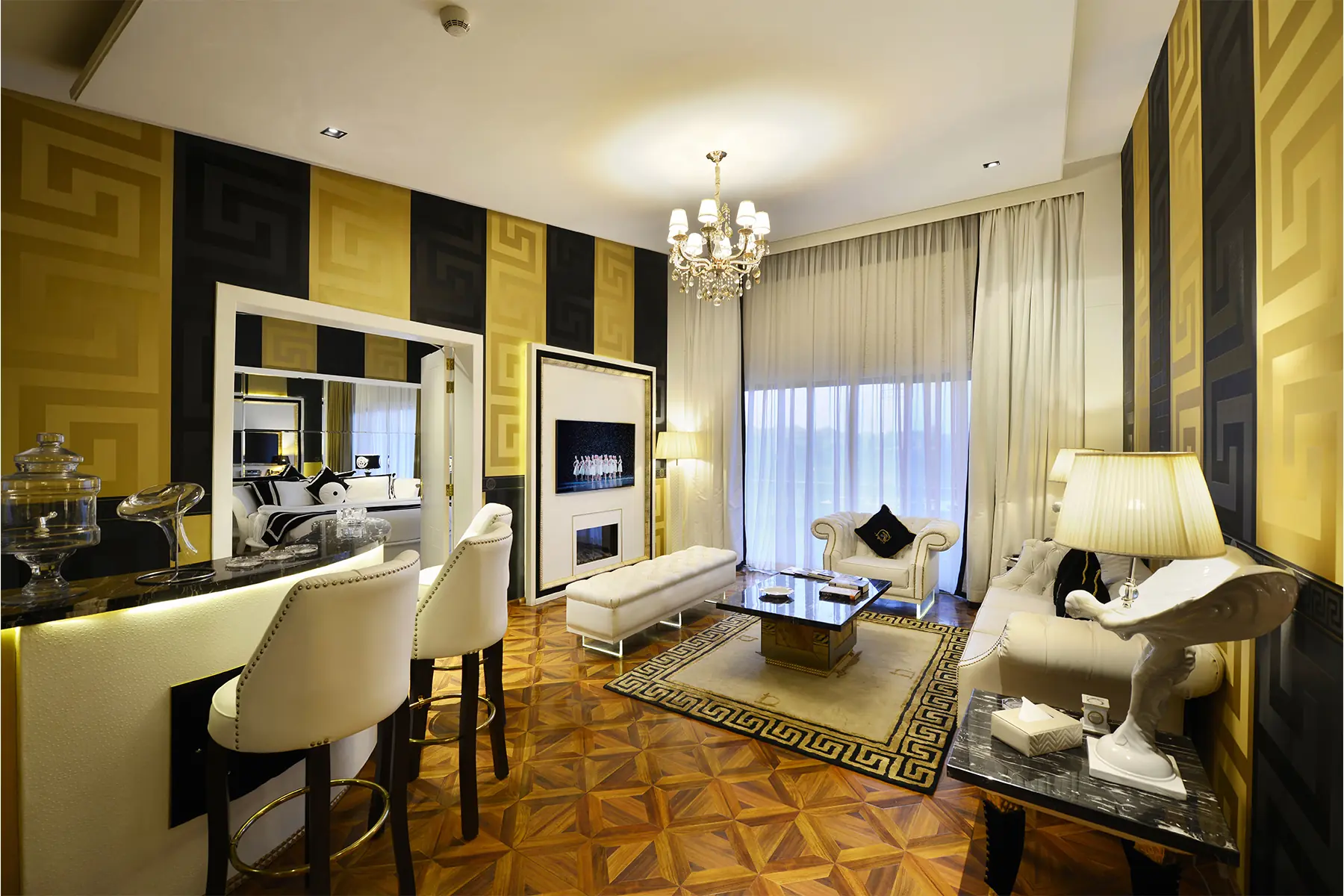 As soon as you enter the spacious 2400 sq. feet Jimmy Mistry - designed Presidential Suite, you are faced with a lavish foyer opening to a living room featuring an electric fireplace, a sunken full-service bar adjoined by Chef's table that seats six guests, where you can relish the finest culinary experiences. The design features decadent, indulgent touches such as the round, king-size water bed in one bedroom, and the mirrored, four-poster bed in the second bedroom, complete with original Versace and Lladro adornments.