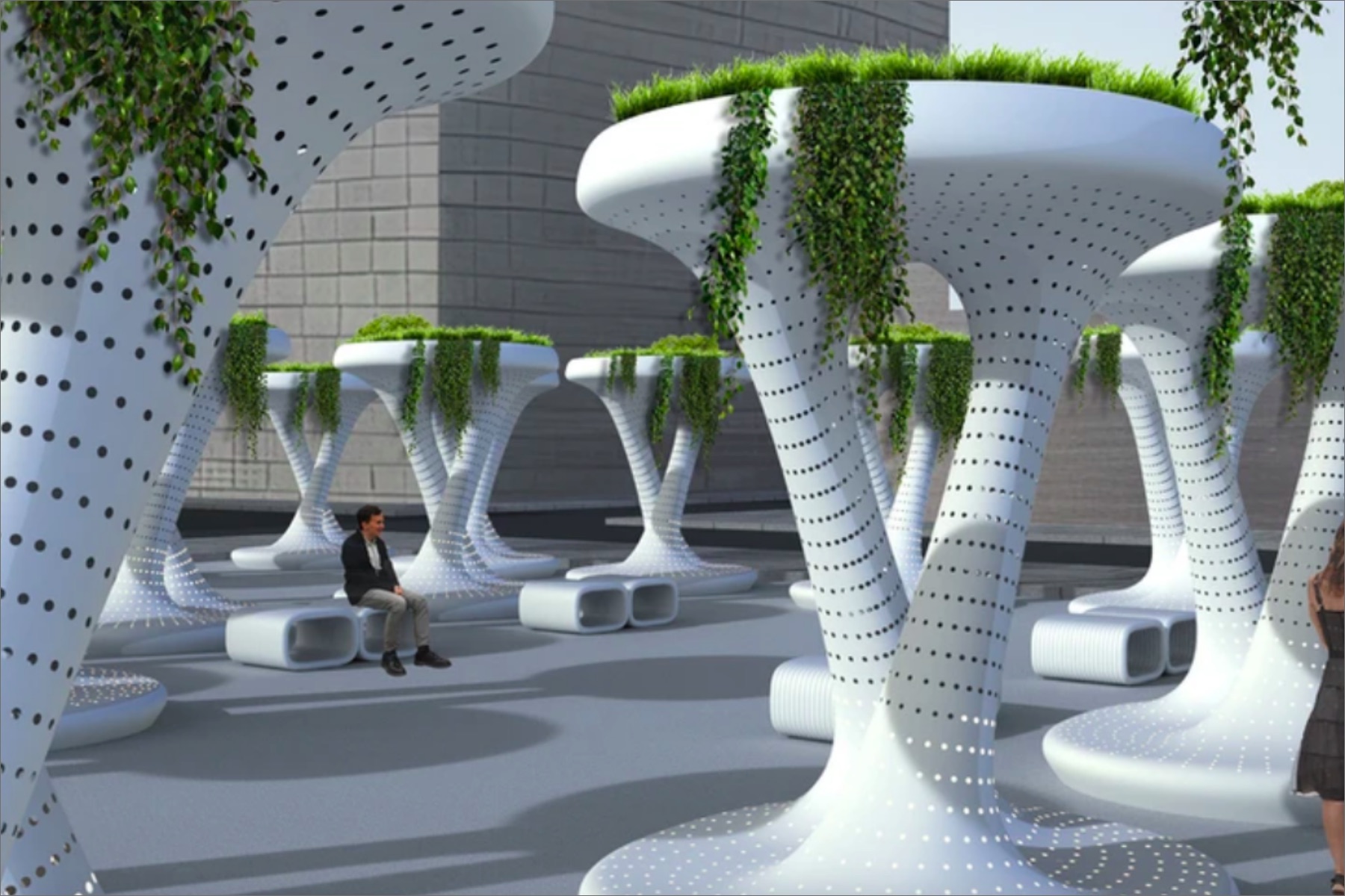 Ross Lovegrove and Ila Colombo have designed a series of functional urban canopies that incorporate greenery and sculptural-structural forms. These canopies provide shade and enhance public spaces within urban environments.
