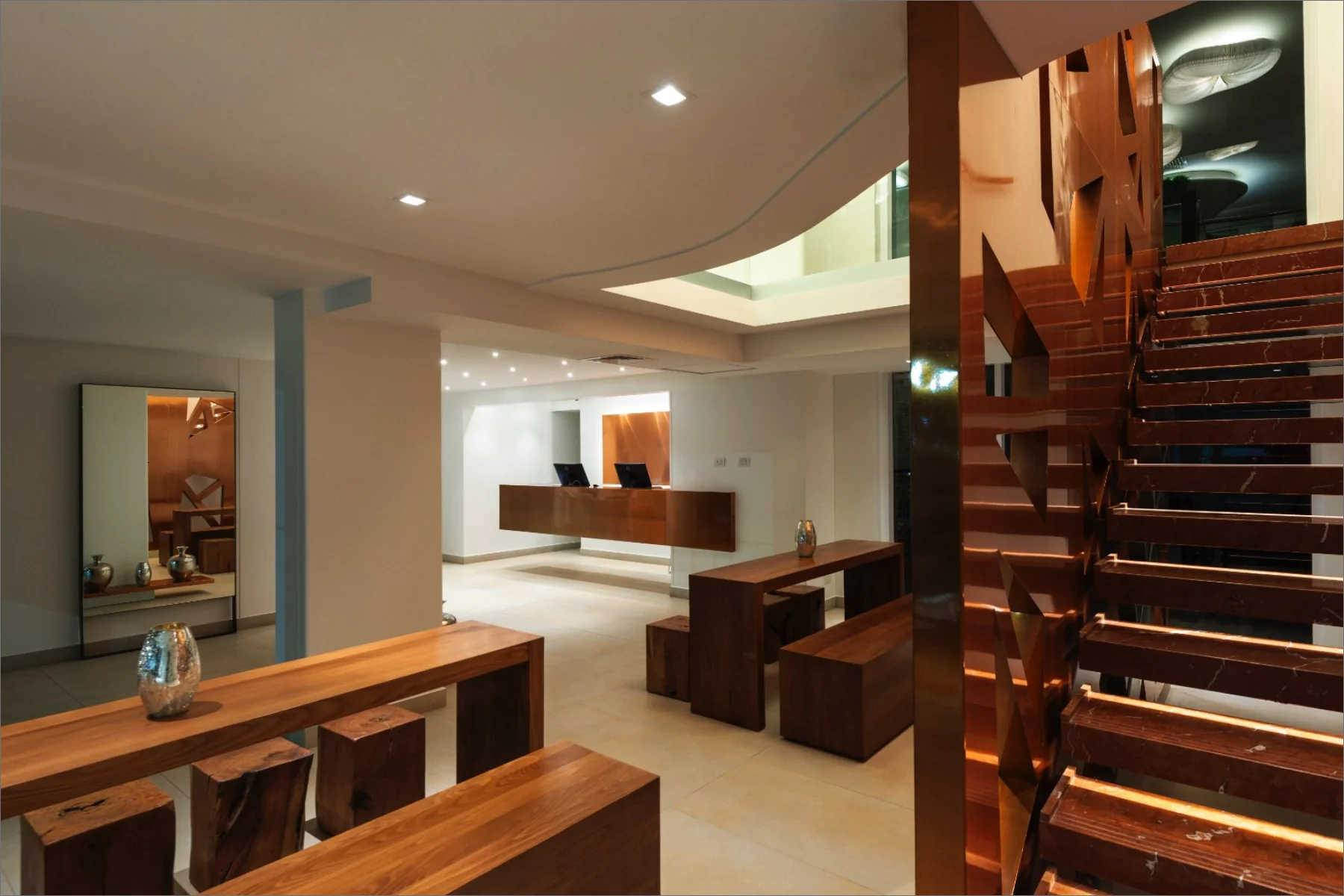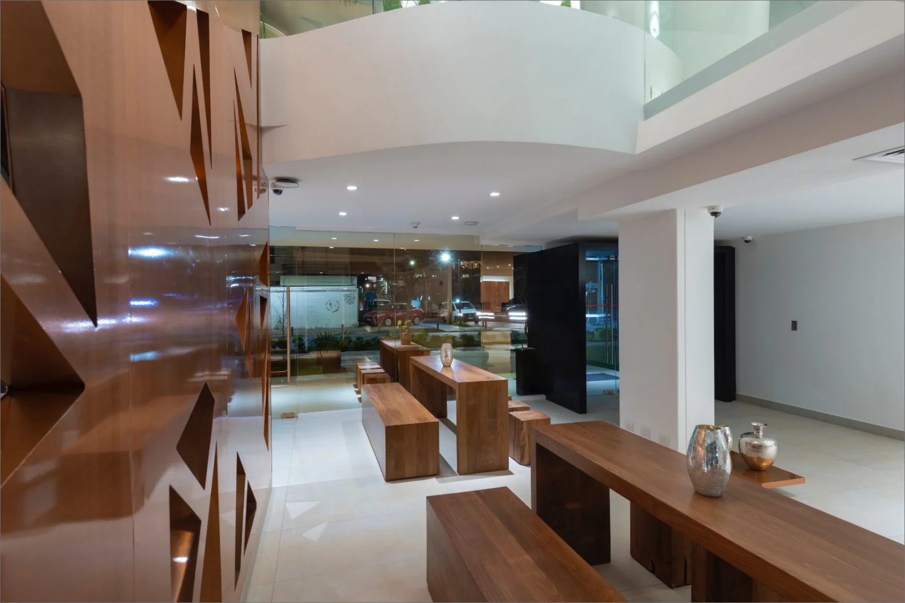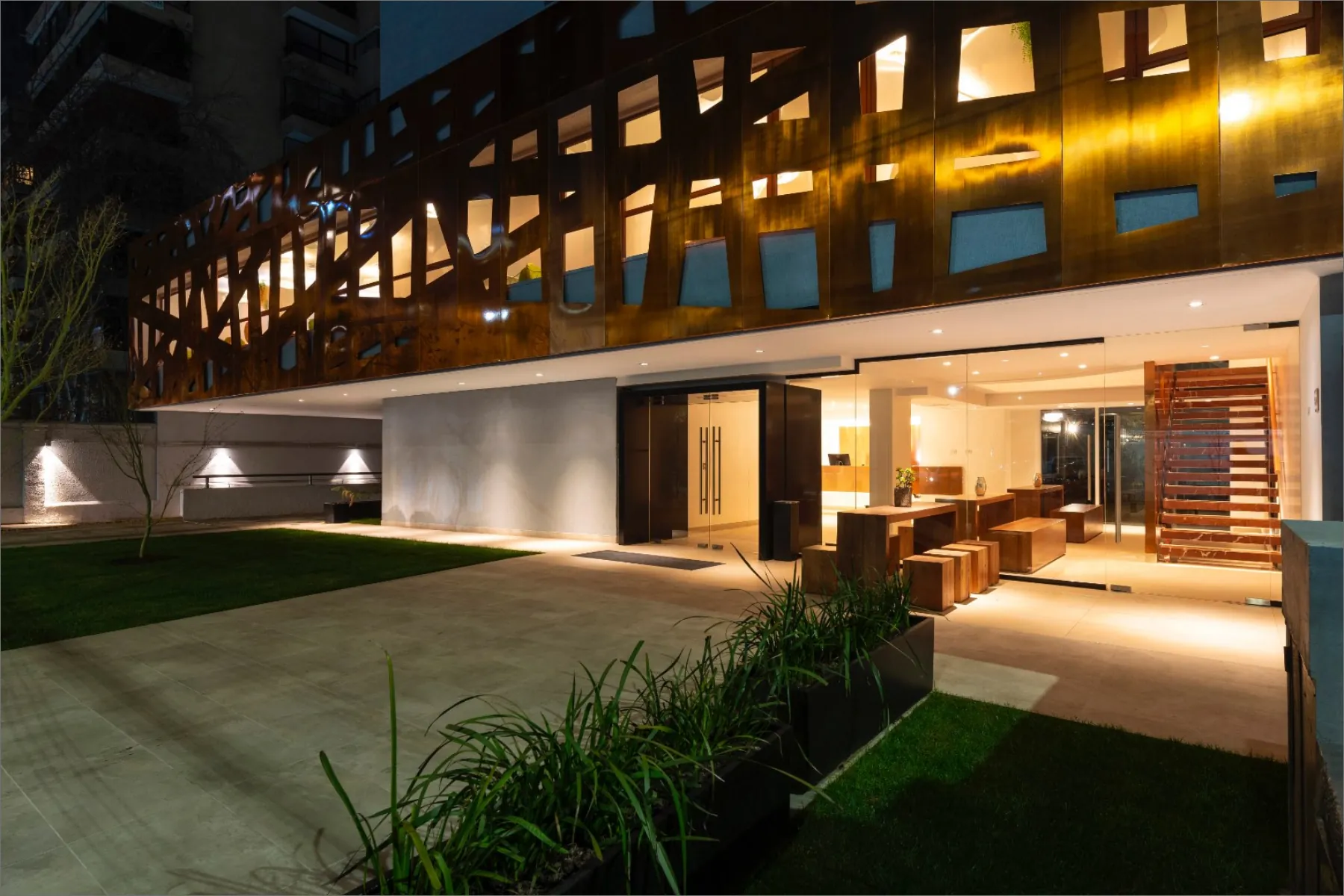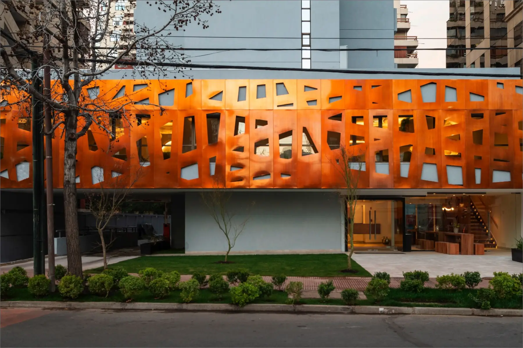 The El Director Boutique Hotel is situated in the lively urban heart of Santiago, Chile. Its design celebrates the local resources, prominently incorporating copper to create a sophisticated interplay of warmth and reflection. The airy interiors, accented with neutral-toned porcelain tiles, allow light to bounce off the copper surfaces, generating a radiant glow that contributes to an opulent and inviting ambiance. This seamless blend of elements establishes a sense of exclusivity and modernity, making it a distinctive destination for discerning travellers.