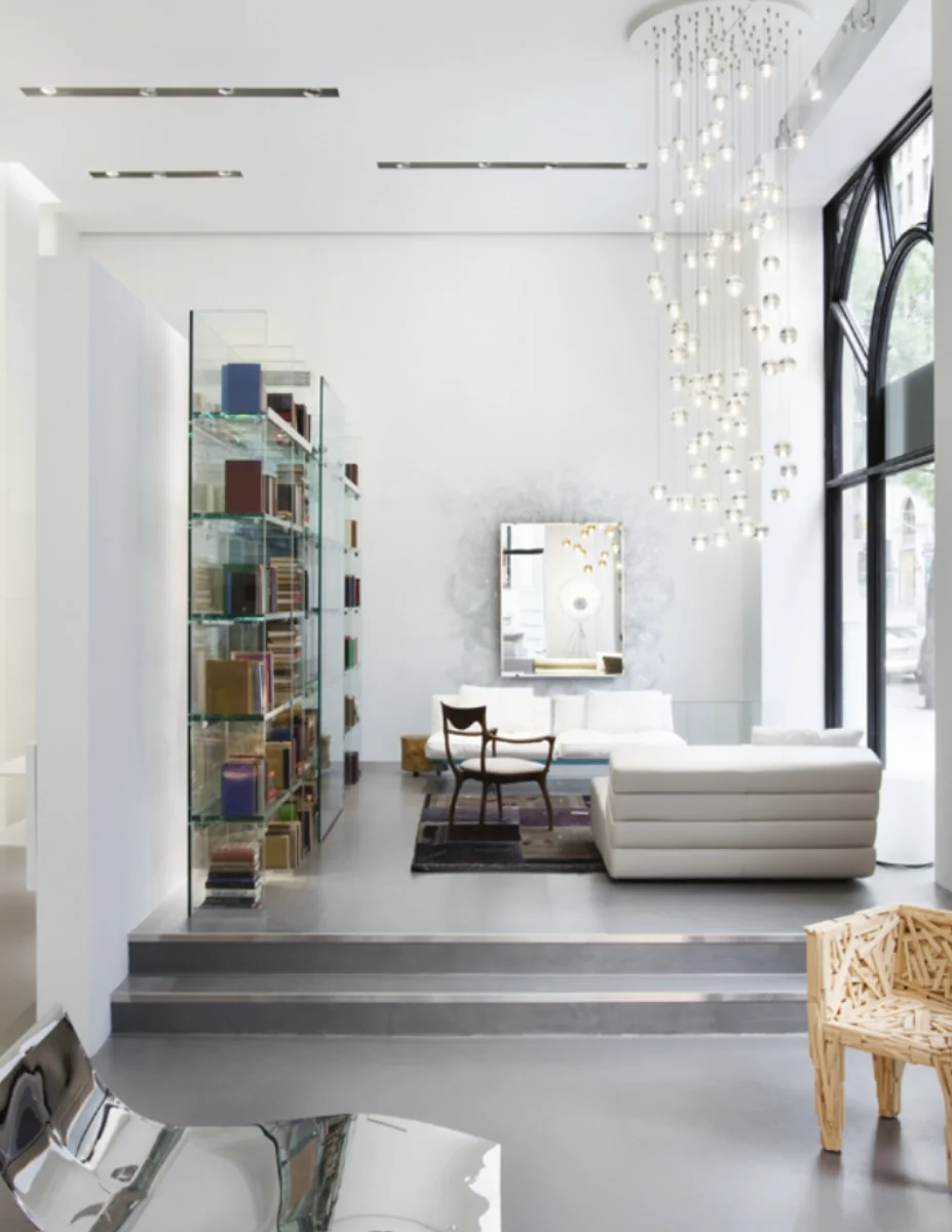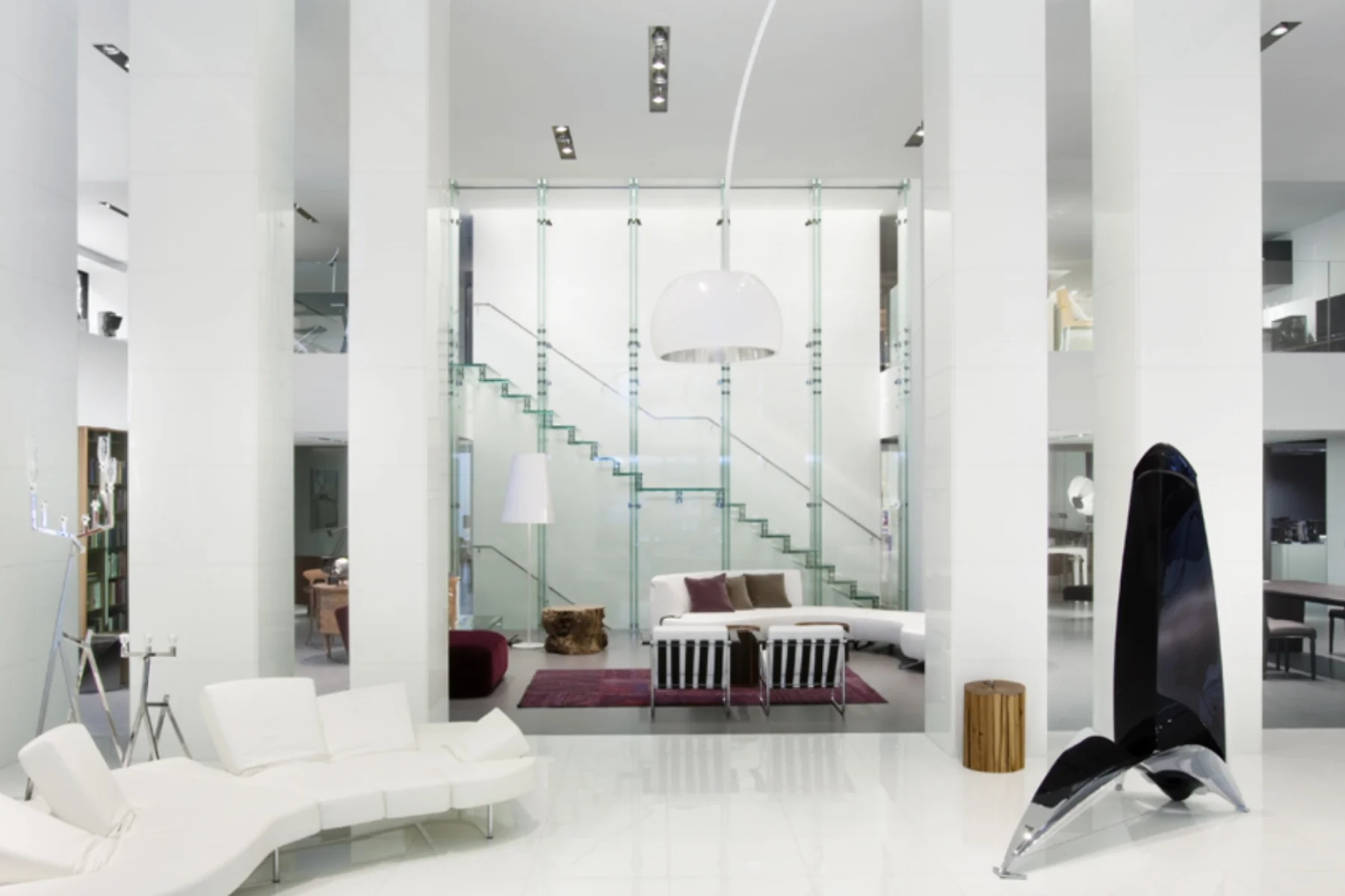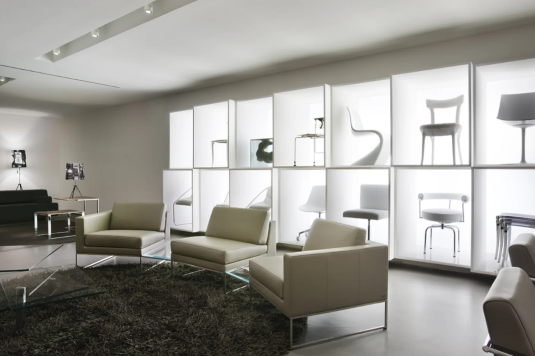This iconic modern furniture showroom in New York City showcases the world's top brands in a design setting that enhances each sculptural piece. The balanced and delicate design serves as a backdrop, promoting the furniture without overwhelming its presentation.