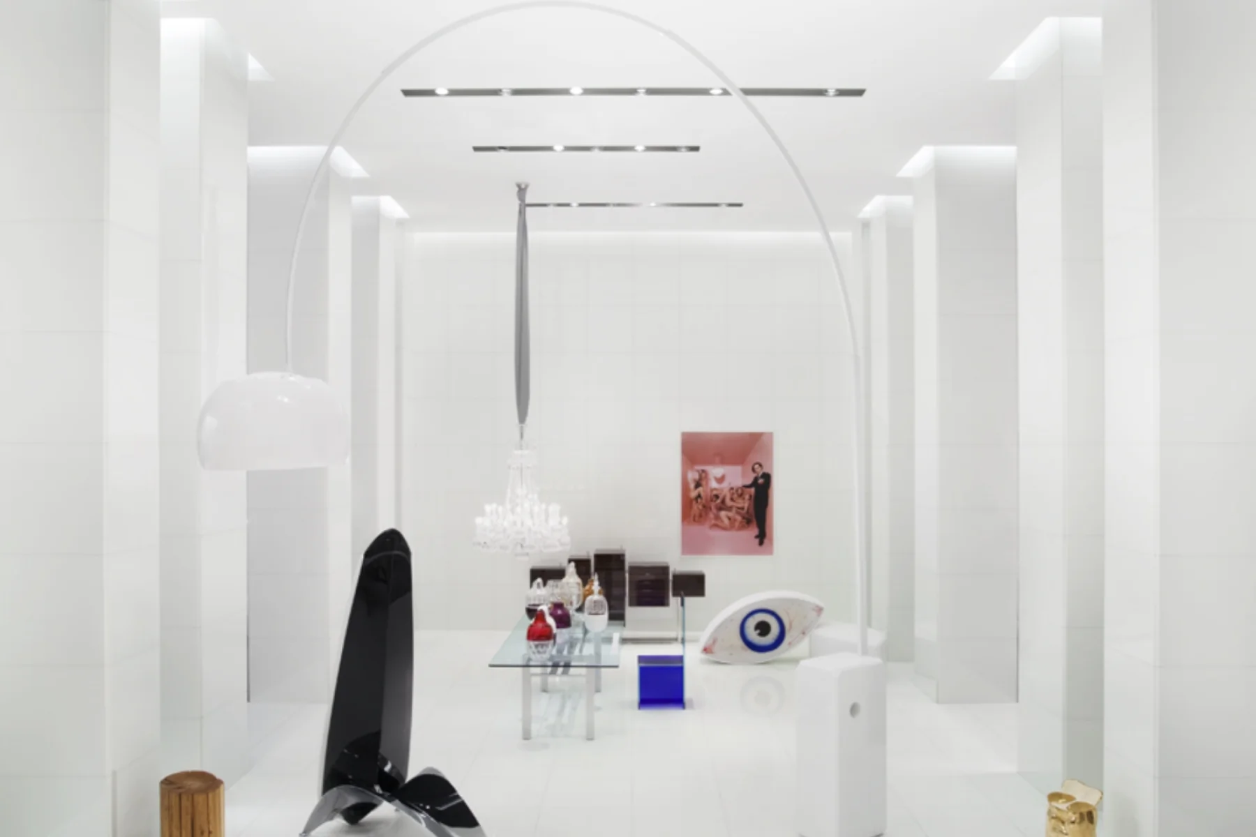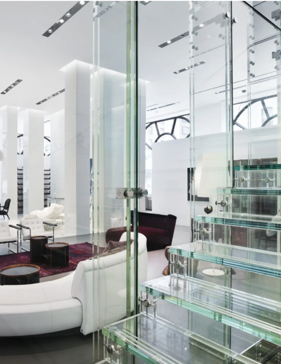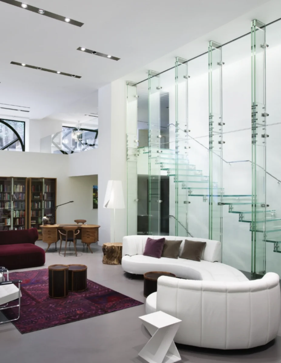 This iconic modern furniture showroom in New York City showcases the world's top brands in a design setting that enhances each sculptural piece. The balanced and delicate design serves as a backdrop, promoting the furniture without overwhelming its presentation.