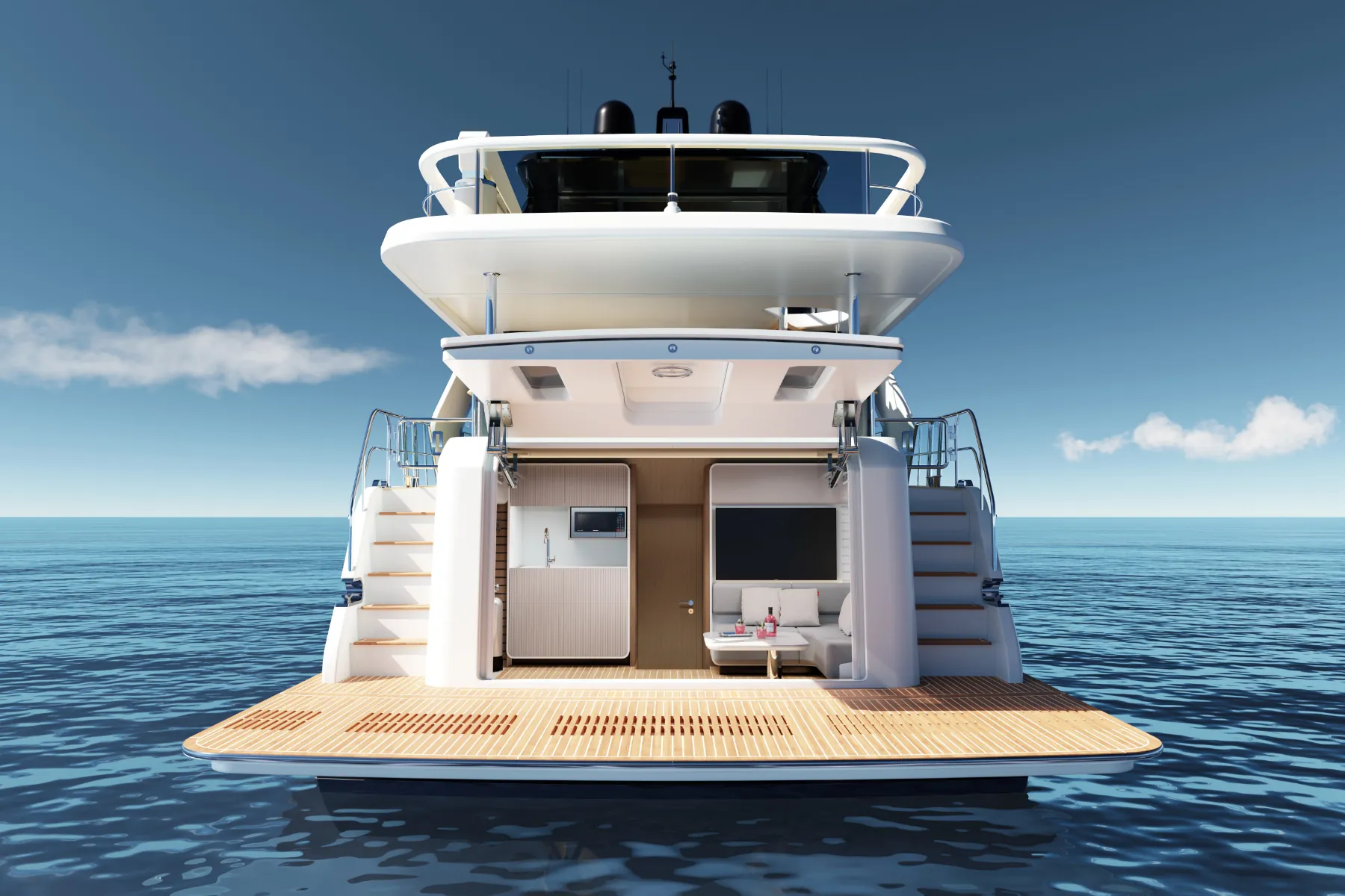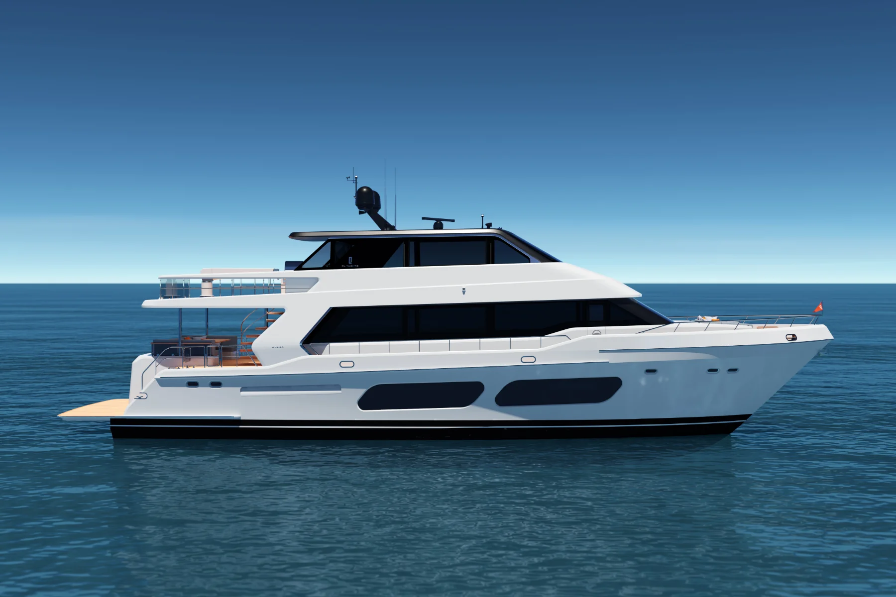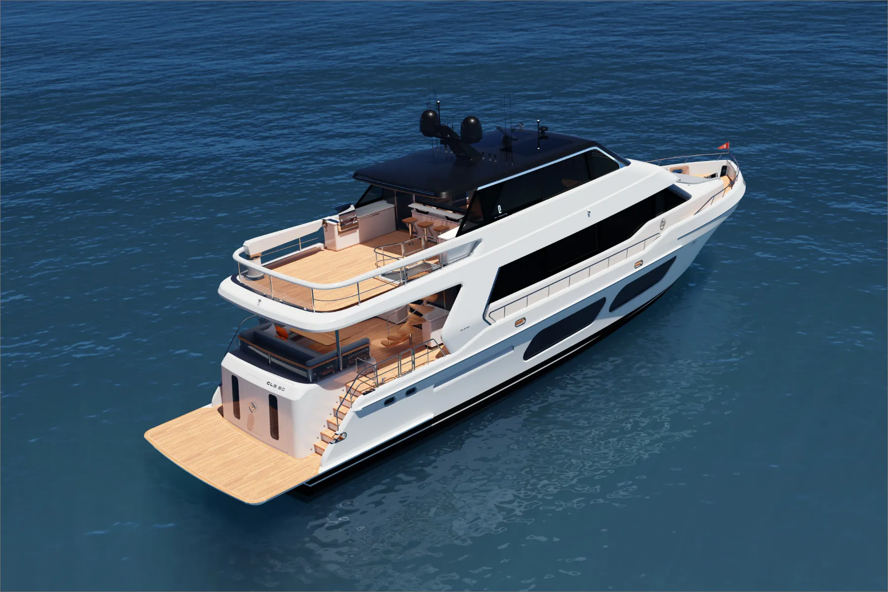 CLB80 represents the third serial-production collaboration between CL Yachts and forakis … design, prioritizing onboard comfort over raw performance. The exterior evolves B-Series DNA from flagship CLB88, incorporating streamlined, sporty aesthetics with signature stepped side windows enhanced for greater visibility and natural light, plus sleek 'boomerang' fashion plates creating an aerodynamic profile. The interior embodies accessible luxury through elegant, harmoniously proportioned spaces filled with natural daylight and premium materials. All staterooms feature innovative FRP 'pods' defining living zones while seamlessly integrating functions. Thoughtfully planned layout options include main deck galley positioning, open flybridge versus enclosed sky lounge, and single or double helm station configurations.