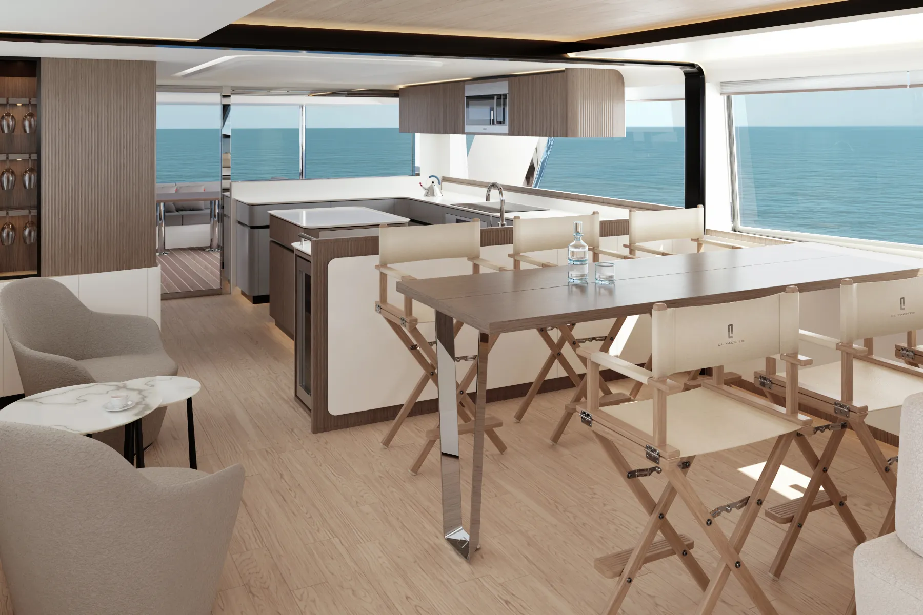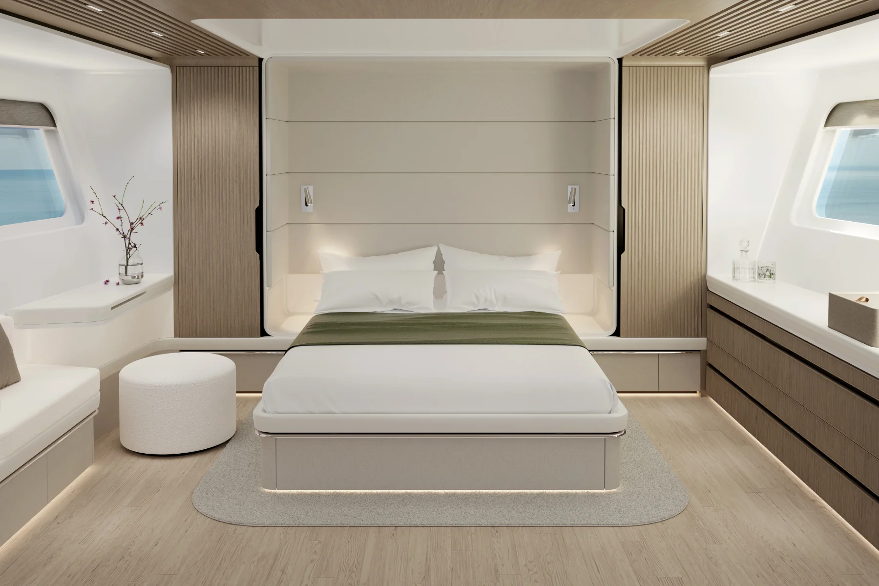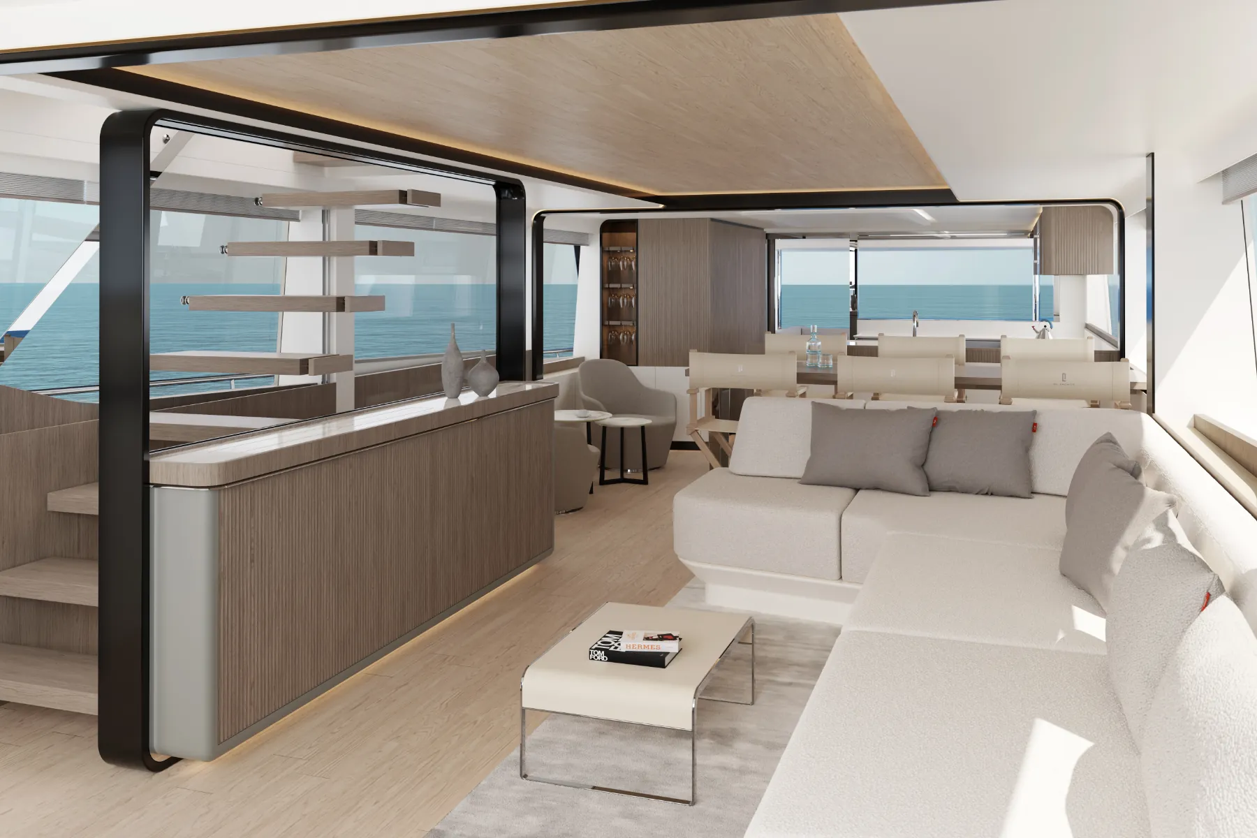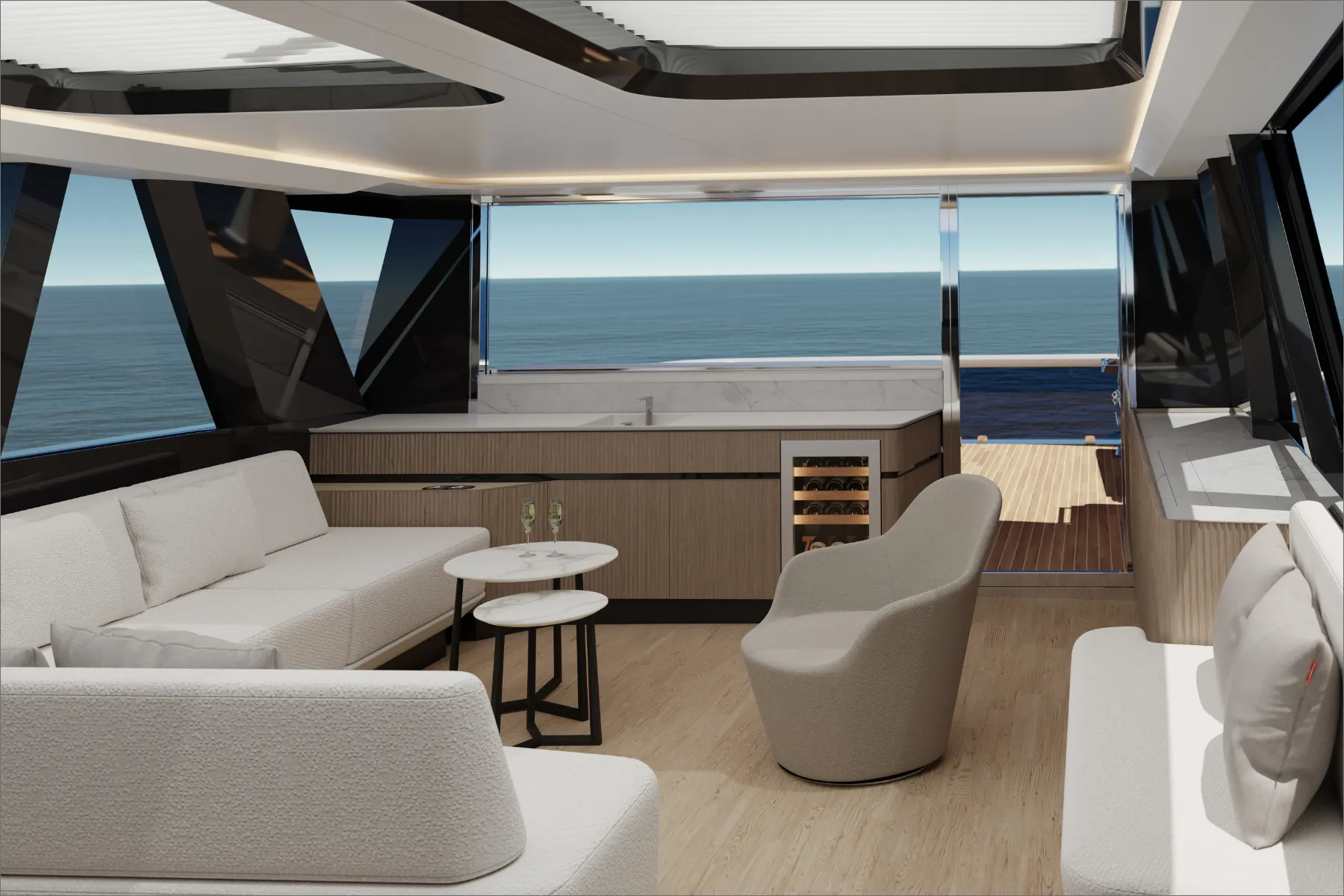 CLB80 represents the third serial-production collaboration between CL Yachts and forakis … design, prioritizing onboard comfort over raw performance. The exterior evolves B-Series DNA from flagship CLB88, incorporating streamlined, sporty aesthetics with signature stepped side windows enhanced for greater visibility and natural light, plus sleek 'boomerang' fashion plates creating an aerodynamic profile. The interior embodies accessible luxury through elegant, harmoniously proportioned spaces filled with natural daylight and premium materials. All staterooms feature innovative FRP 'pods' defining living zones while seamlessly integrating functions. Thoughtfully planned layout options include main deck galley positioning, open flybridge versus enclosed sky lounge, and single or double helm station configurations.