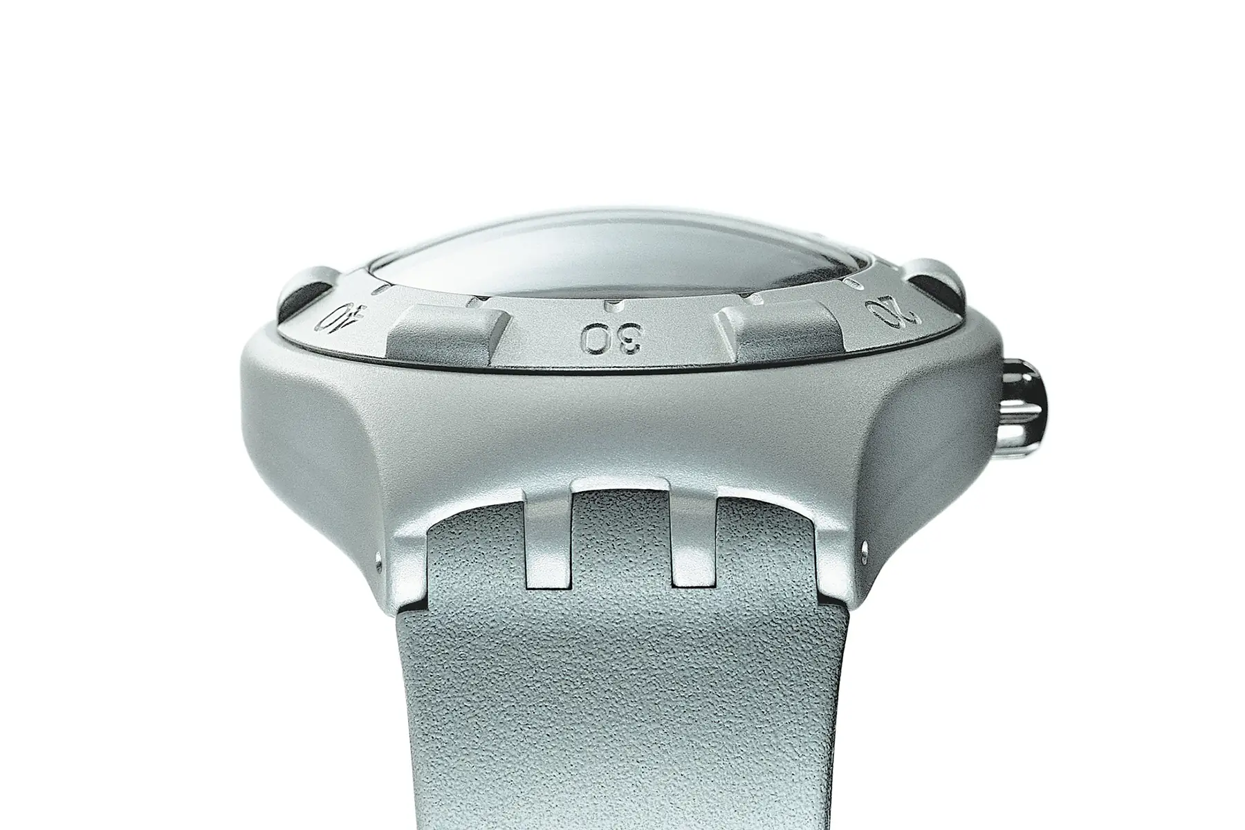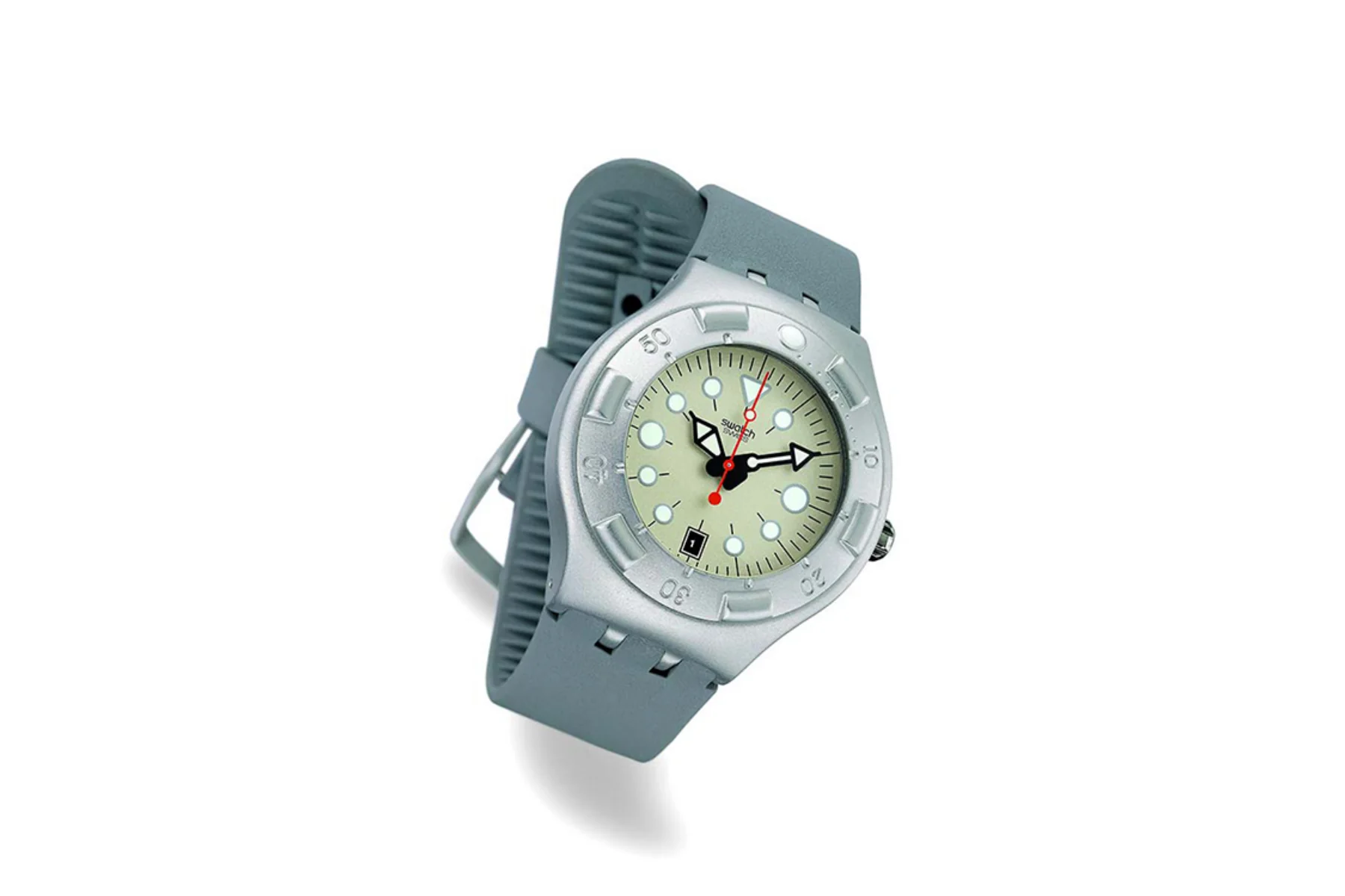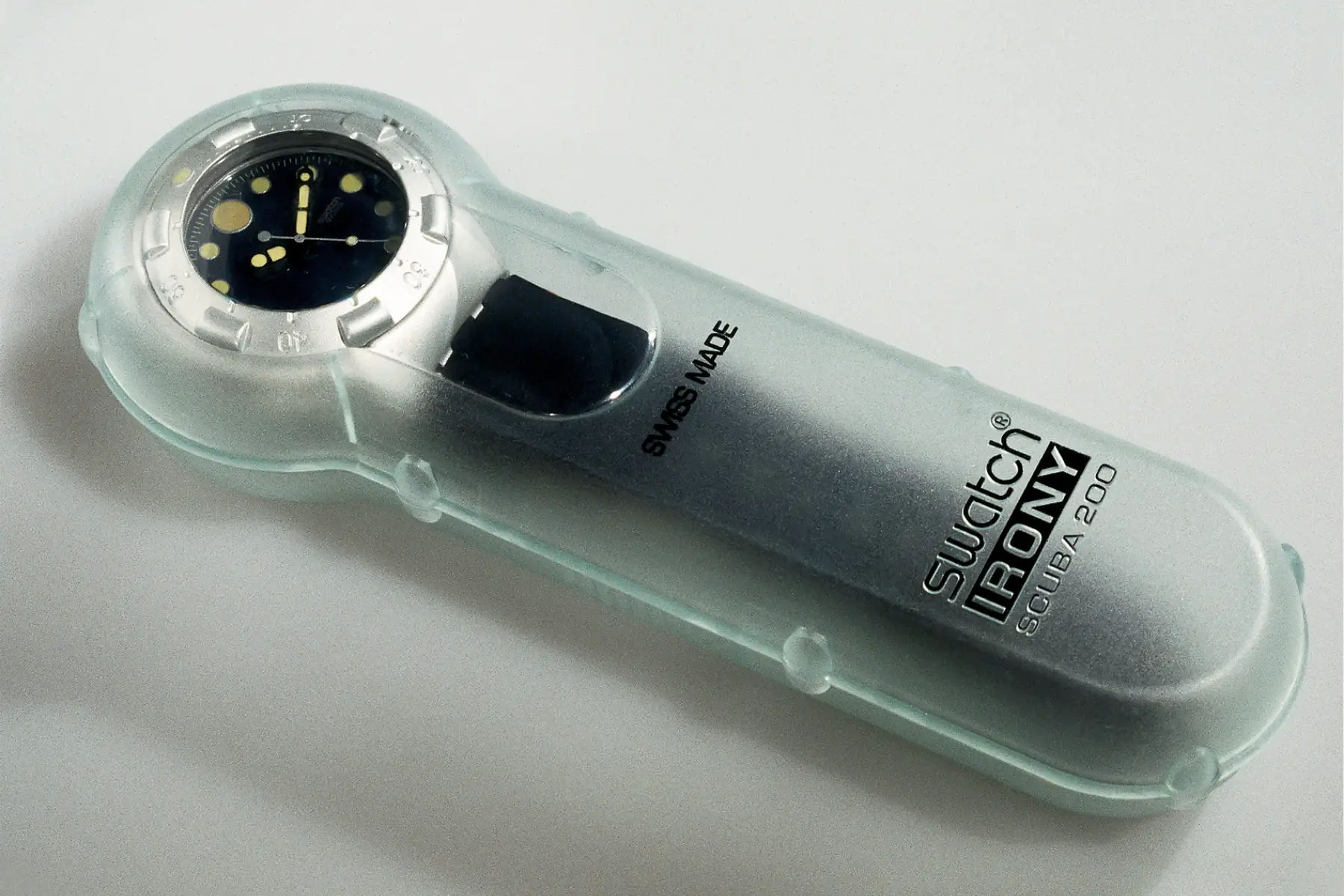 Swatch commissioned a 200-meter-rated diver’s watch, prompting Jozeph Forakis to resolve the paradox of “serious” and “Swatch” through design. The Irony Scuba 200 introduced a three-dimensional language, shifting from graphic plastic to sculpted metal. Its form—a sporty reinterpretation of the classic Swatch—was crafted from a perfect sphere, featuring a seamless rotating bezel and a curved underside for added comfort. Even the packaging echoed this design purity, envisioned as a futuristic deep-sea time capsule honouring the watch within.