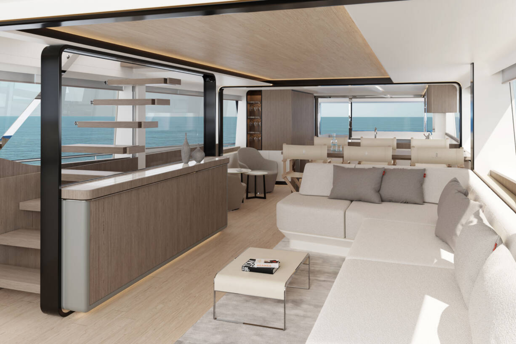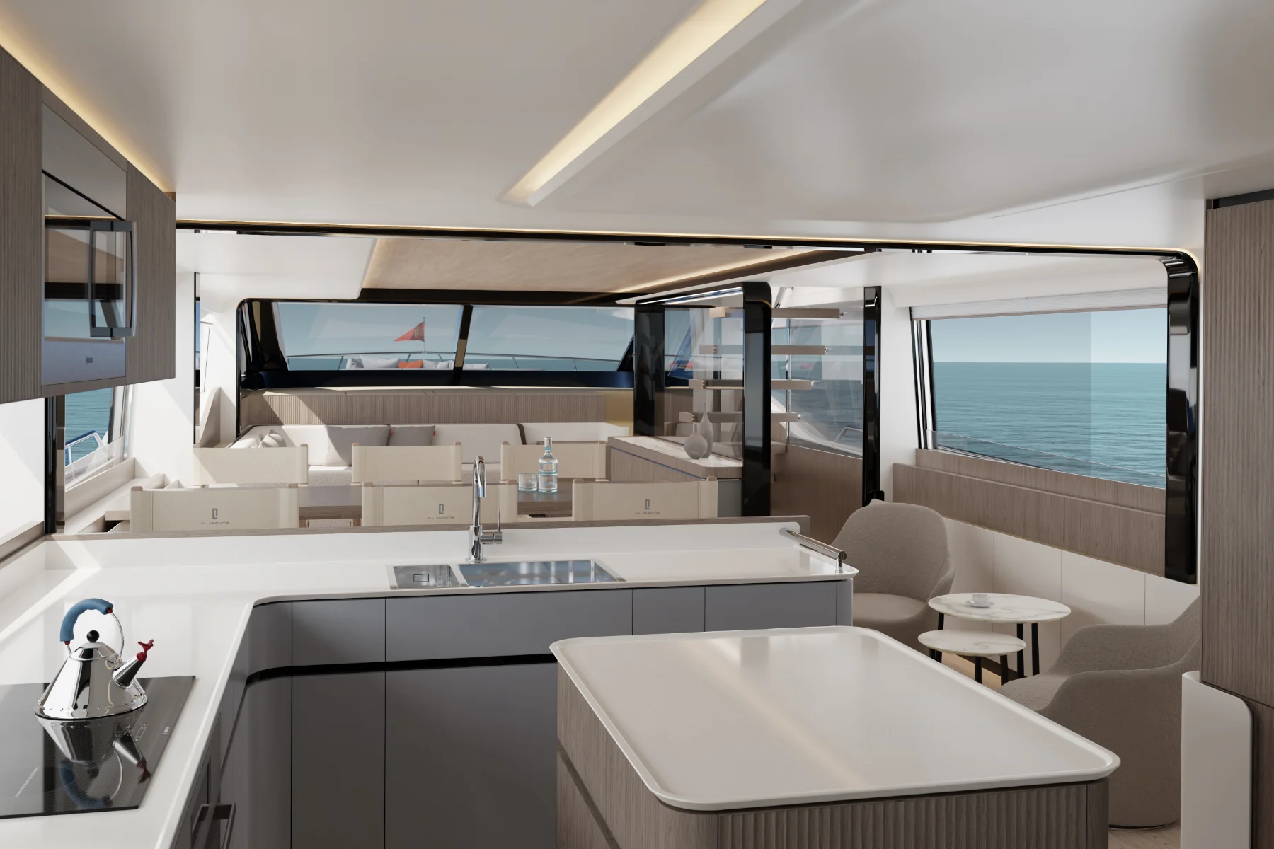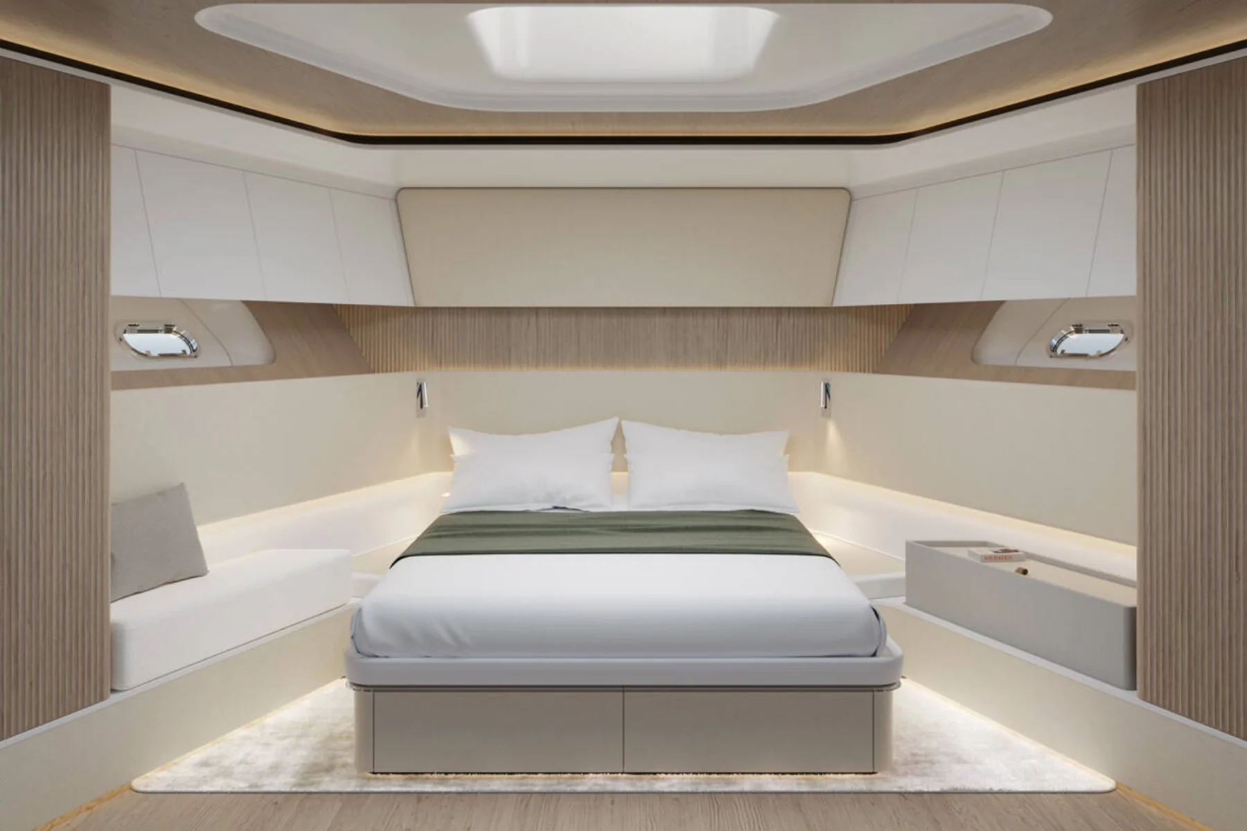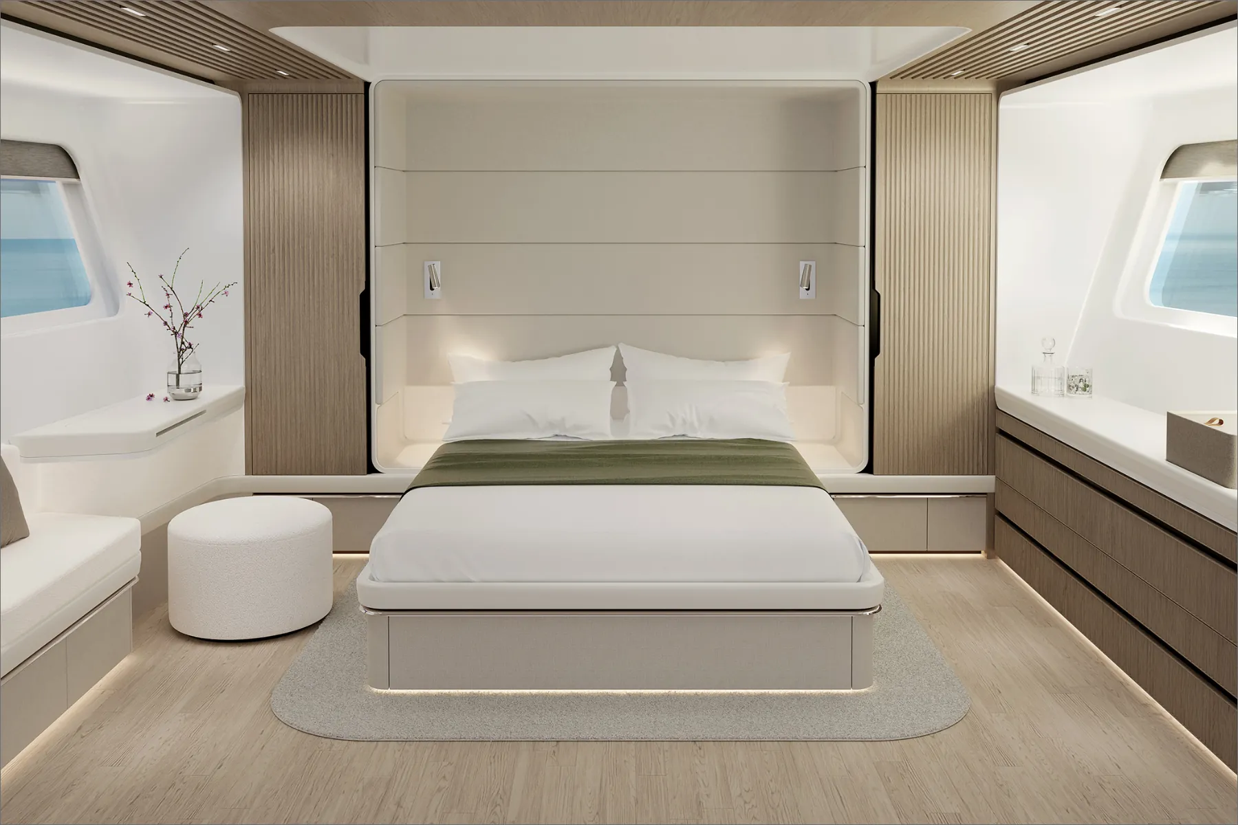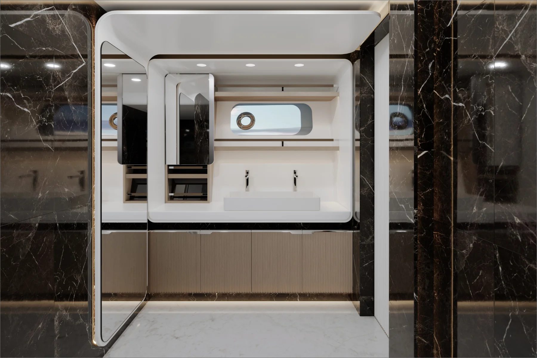 The interior design embodies a vision of accessible luxury, with elegantly proportioned spaces bathed in natural light and finished in premium materials. Every element reflects Forakis’ signature precision and care. In the staterooms, innovative FRP pods subtly define distinct living zones while seamlessly integrating functional elements into the overall flow.
