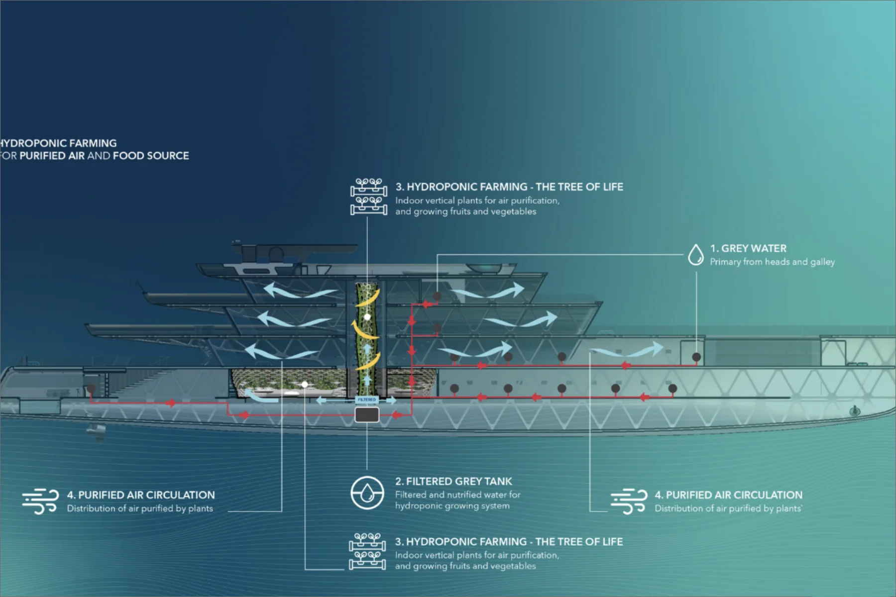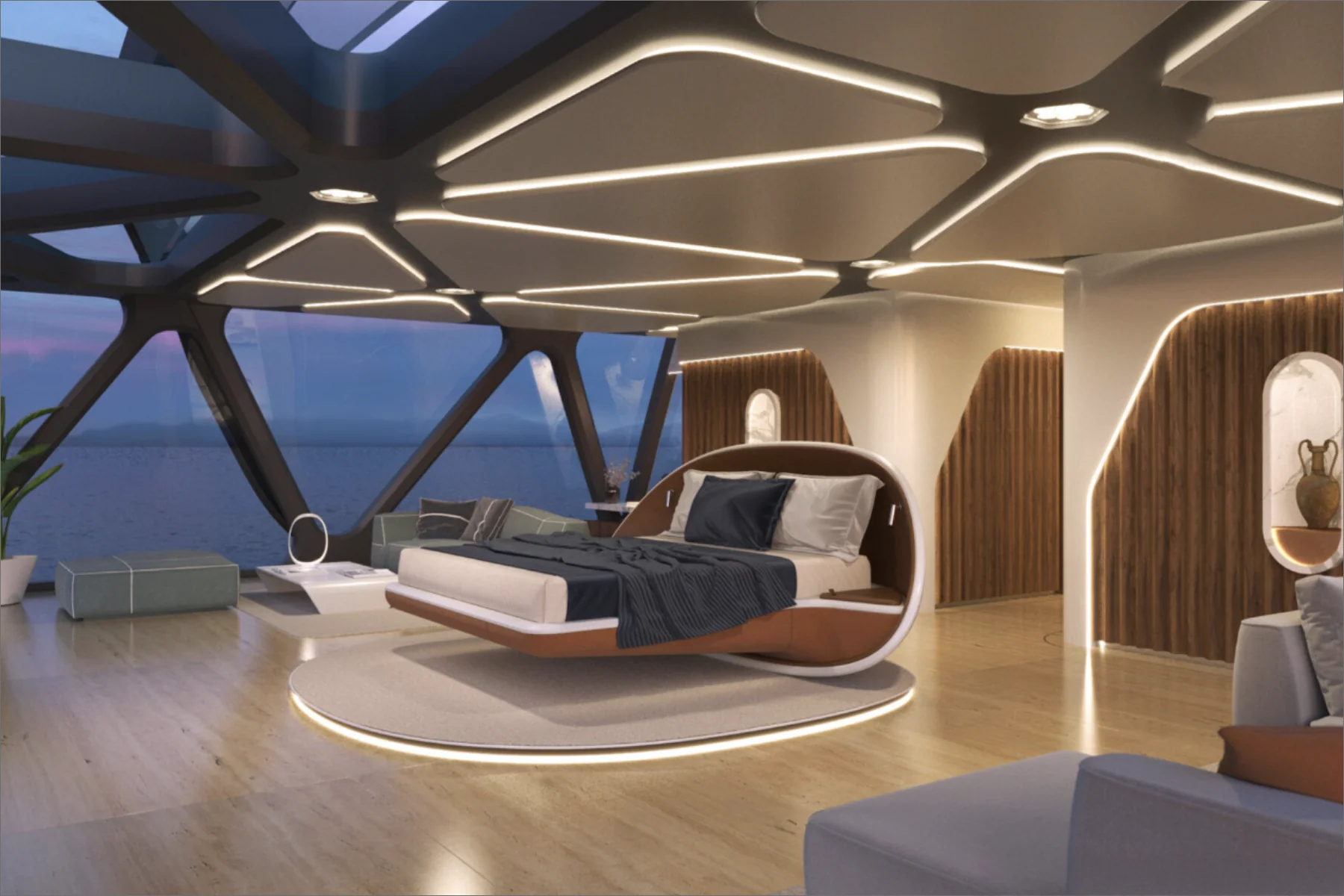 Conceived on a Greek beach, the PEGASUS 88m represents the world's first 3D printed solar-electric/hydrogen superyacht, achieving complete zero emissions. This visionary 88m vessel by Jozeph Forakis pursues "invisibility" through both its aesthetic design and environmental footprint. Revolutionary robotic 3D printing technology creates an integrated mesh framework, delivering exceptional strength while remaining remarkably lightweight—all achieved with significantly reduced material waste and construction time. The exterior showcases a sleek, silvery hull that seamlessly blends with surrounding waters, crowned by ethereal, multi-tiered glass wings that mirror the sky and clouds above. At the heart of the interior lies a magnificent four-level "Tree of Life"—a living hydroponic garden that supplies fresh produce while purifying the onboard air. Powered entirely by renewable energy, solar panels continuously convert seawater into hydrogen for extended storage, while advanced fuel cells transform this hydrogen into electricity held in lithium-ion batteries. This groundbreaking design harmoniously merges cutting-edge sustainability with uncompromising luxury.