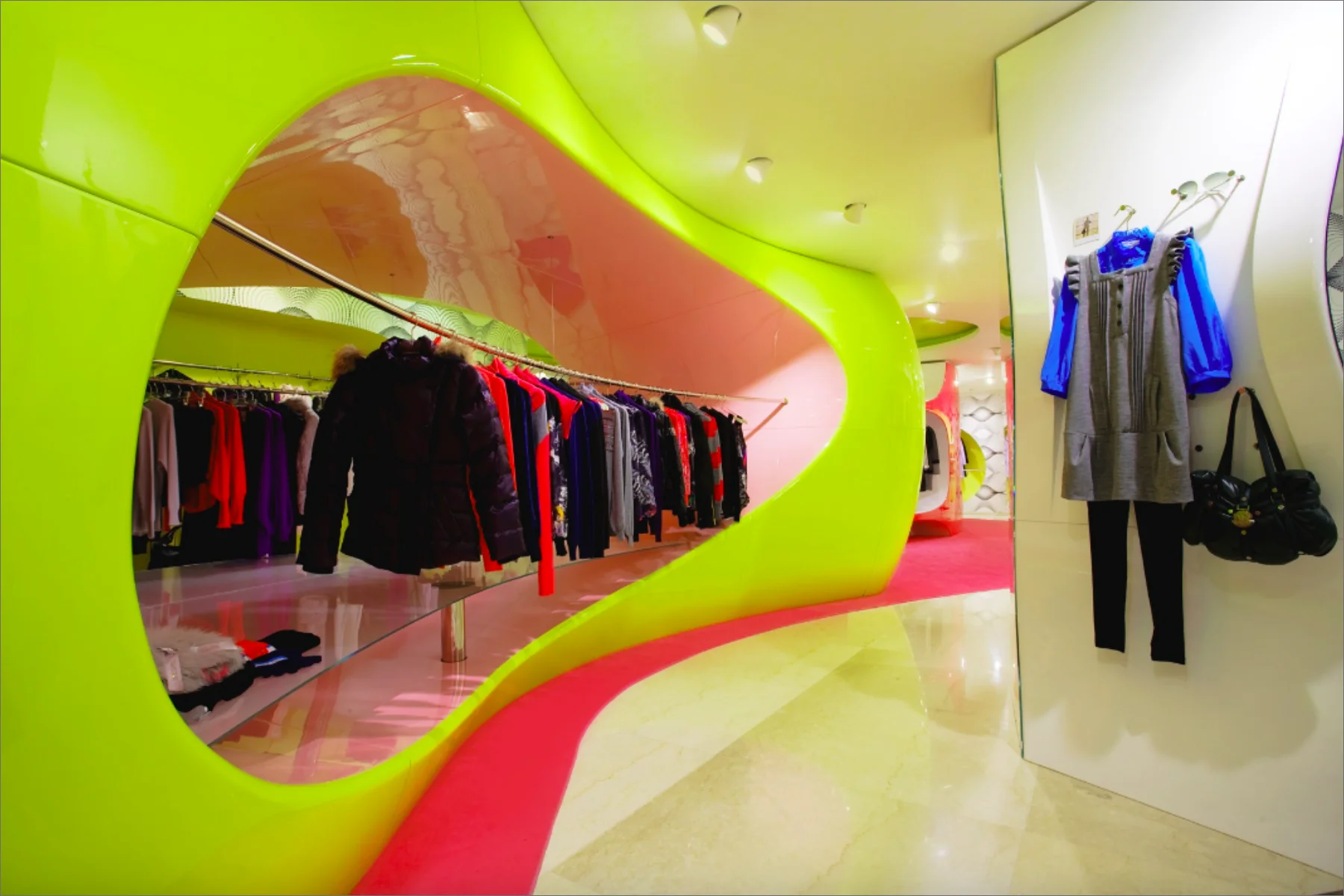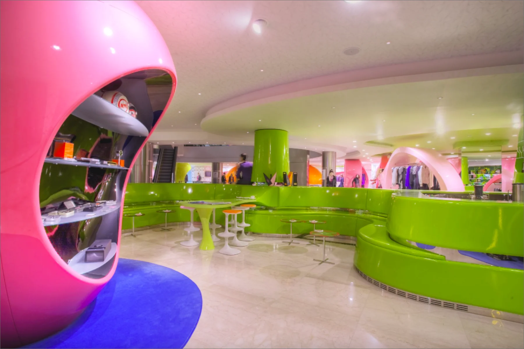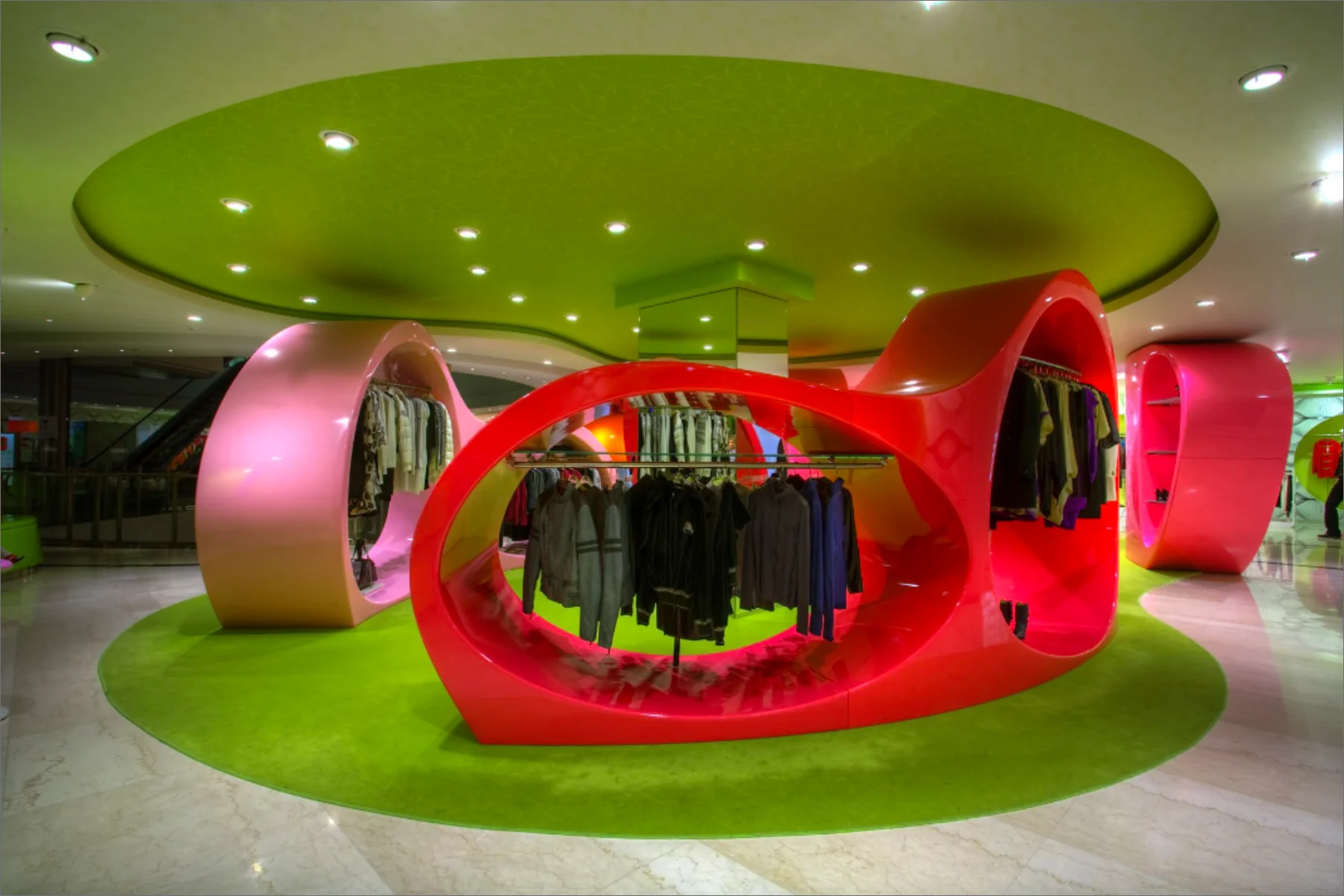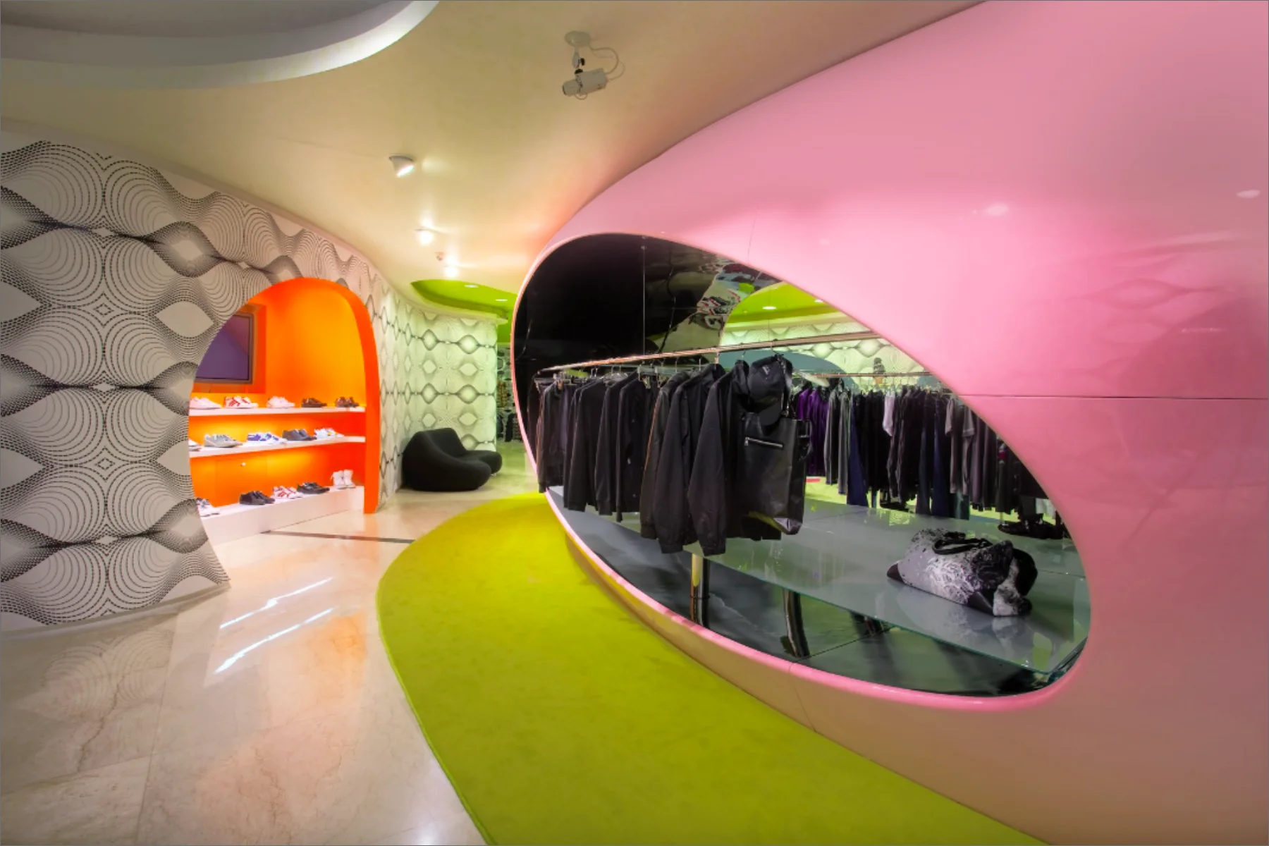 Karim renovated the basement level of a mall for Bosco Pi, creating a technorganic, fluid space that encourages both shopping and socializing. Designed to draw consumers in, the layout features a labyrinth of dynamic, visually stimulating elements that engage visitors. Shaped display units are arranged around a grid of columns, each offering a unique shopping experience. The café is a continuous strip of benches, arranged to allow socializing, with seats facing inward or outward, creating an inviting urban hangout for the youth.