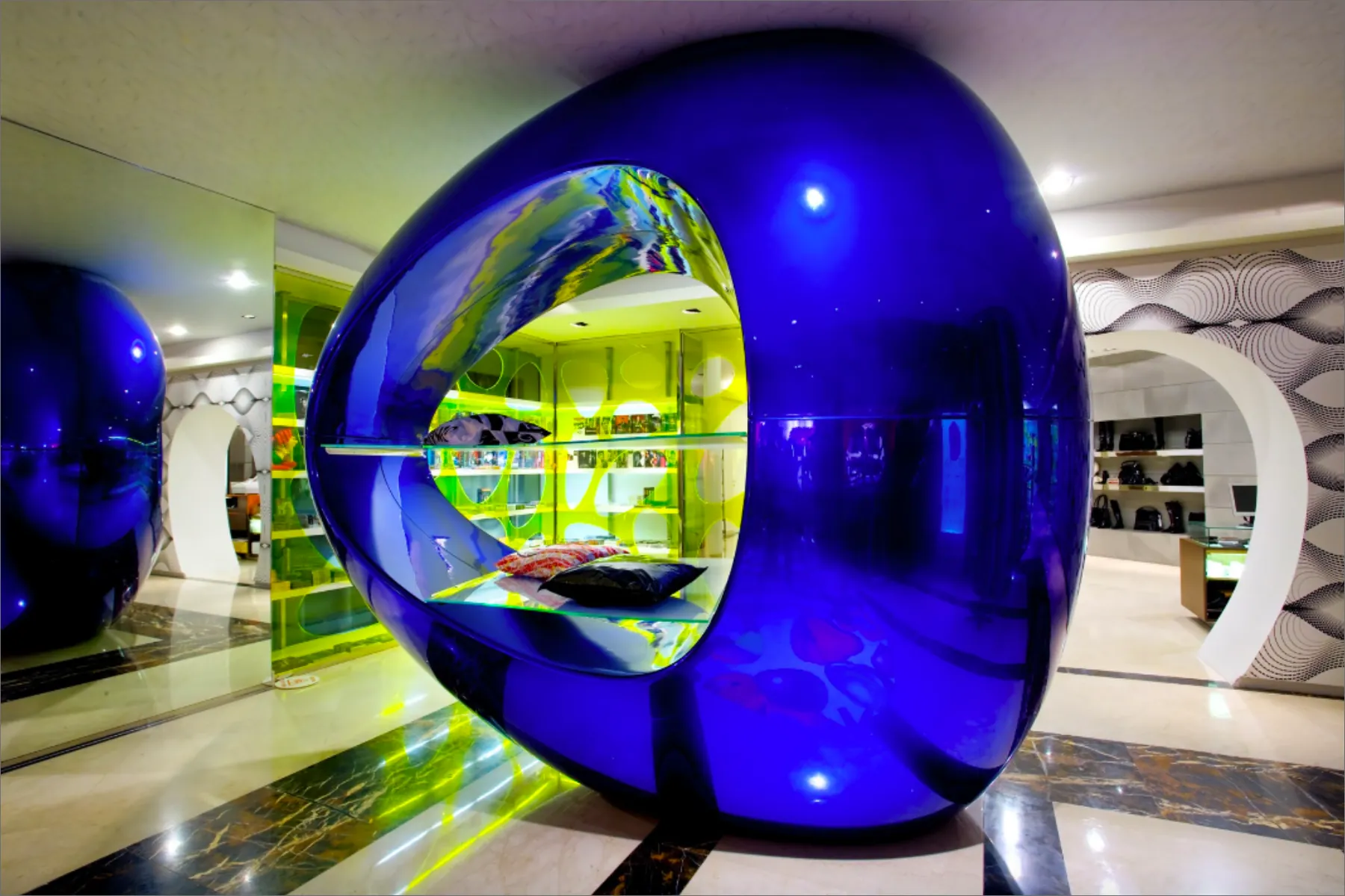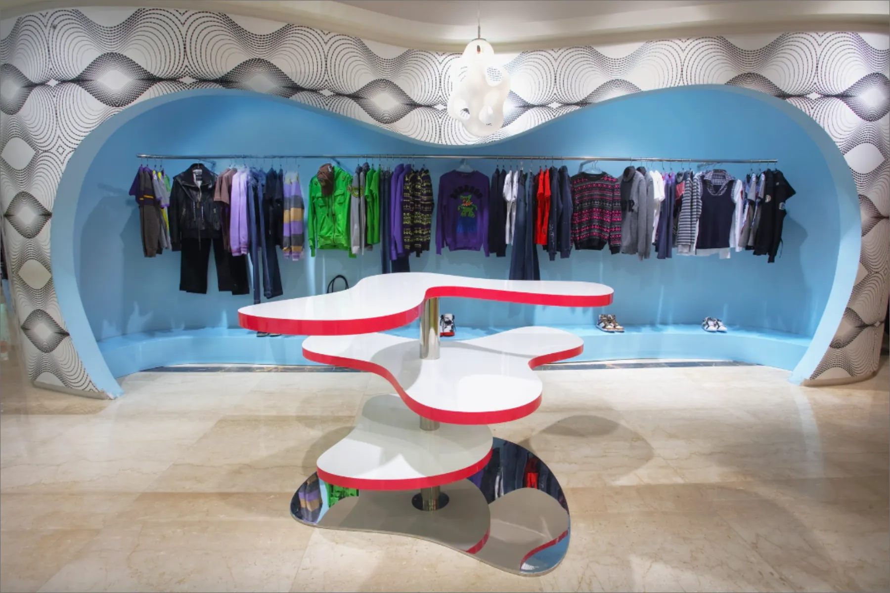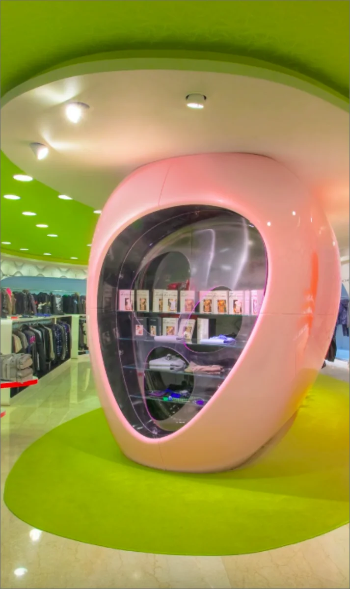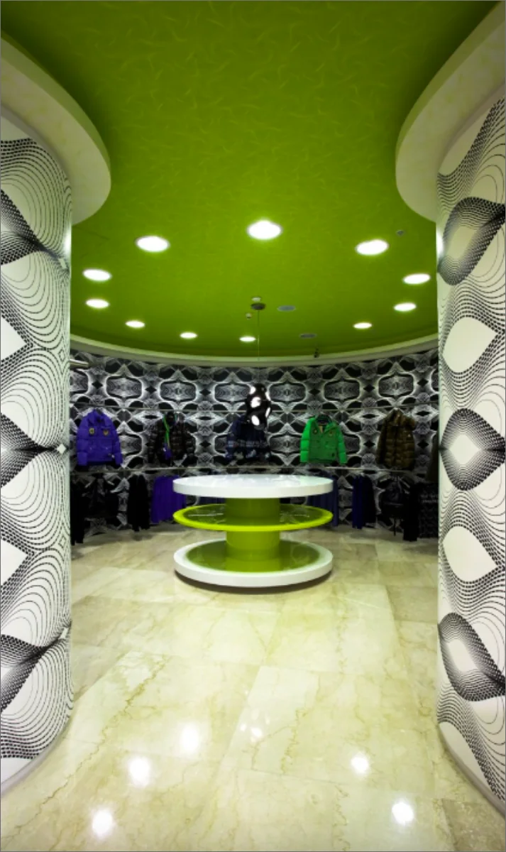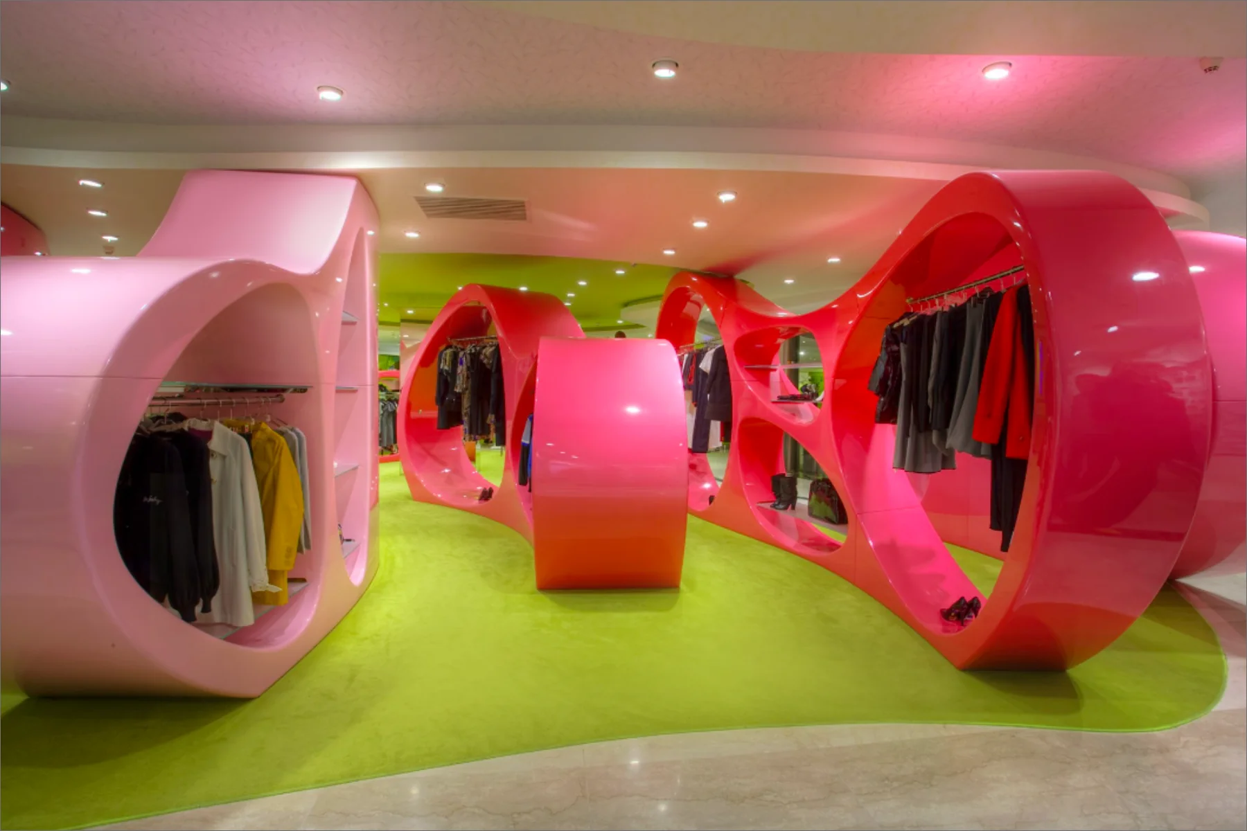Karim renovated the basement level of a mall for Bosco Pi, creating a technorganic, fluid space that encourages both shopping and socializing. Designed to draw consumers in, the layout features a labyrinth of dynamic, visually stimulating elements that engage visitors. Shaped display units are arranged around a grid of columns, each offering a unique shopping experience. The café is a continuous strip of benches, arranged to allow socializing, with seats facing inward or outward, creating an inviting urban hangout for the youth.