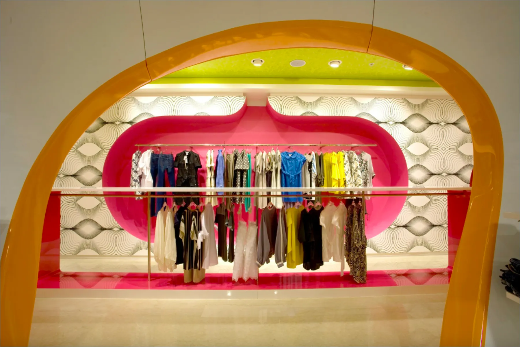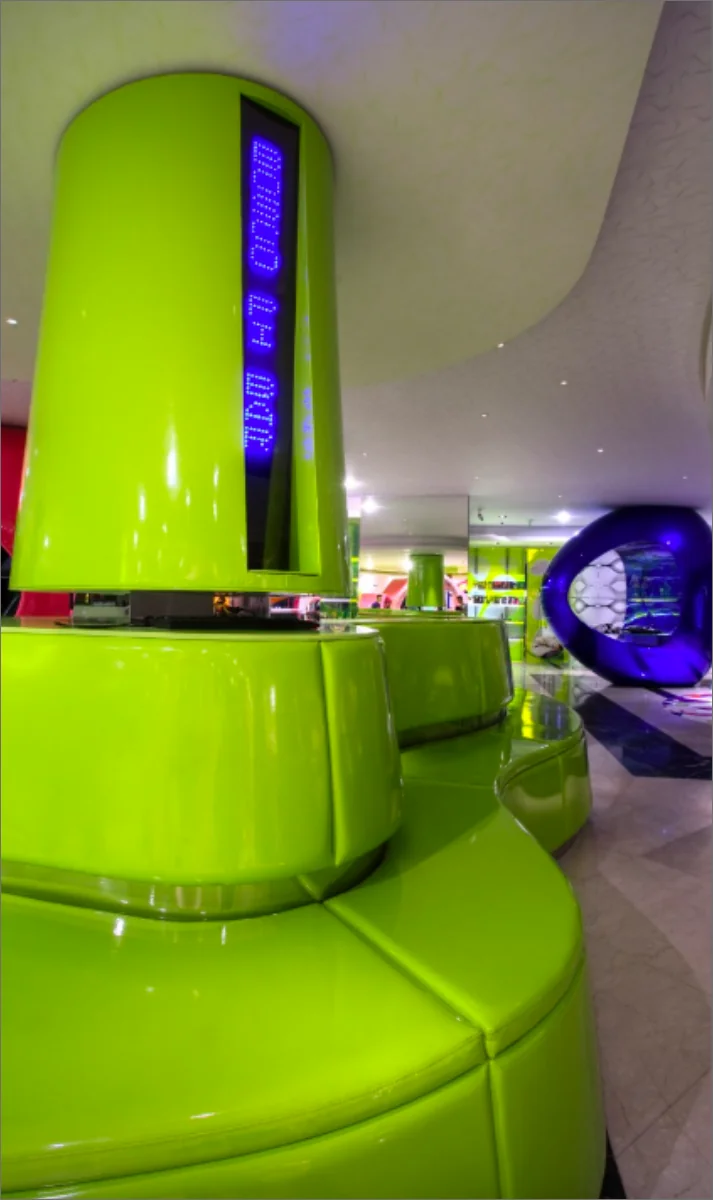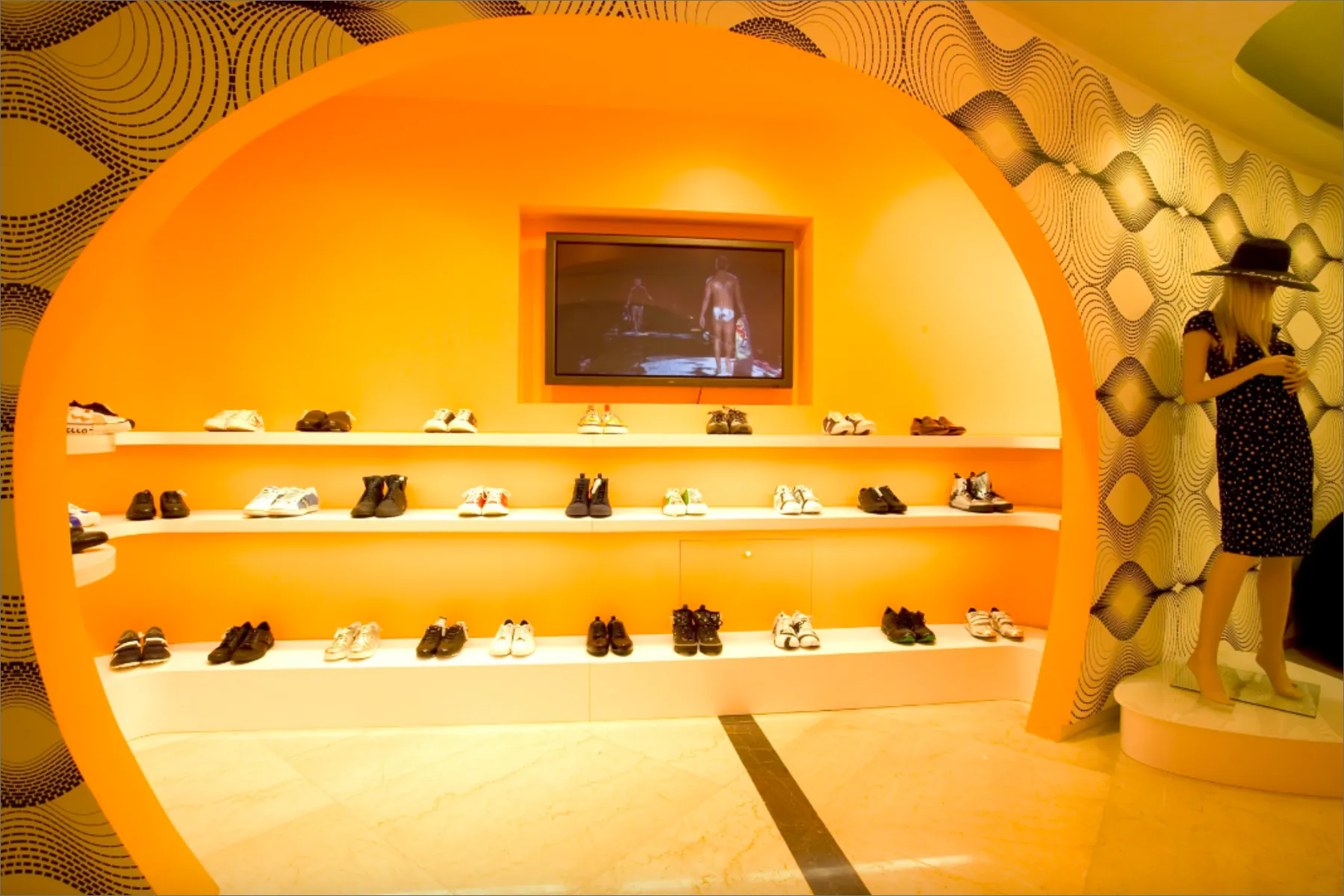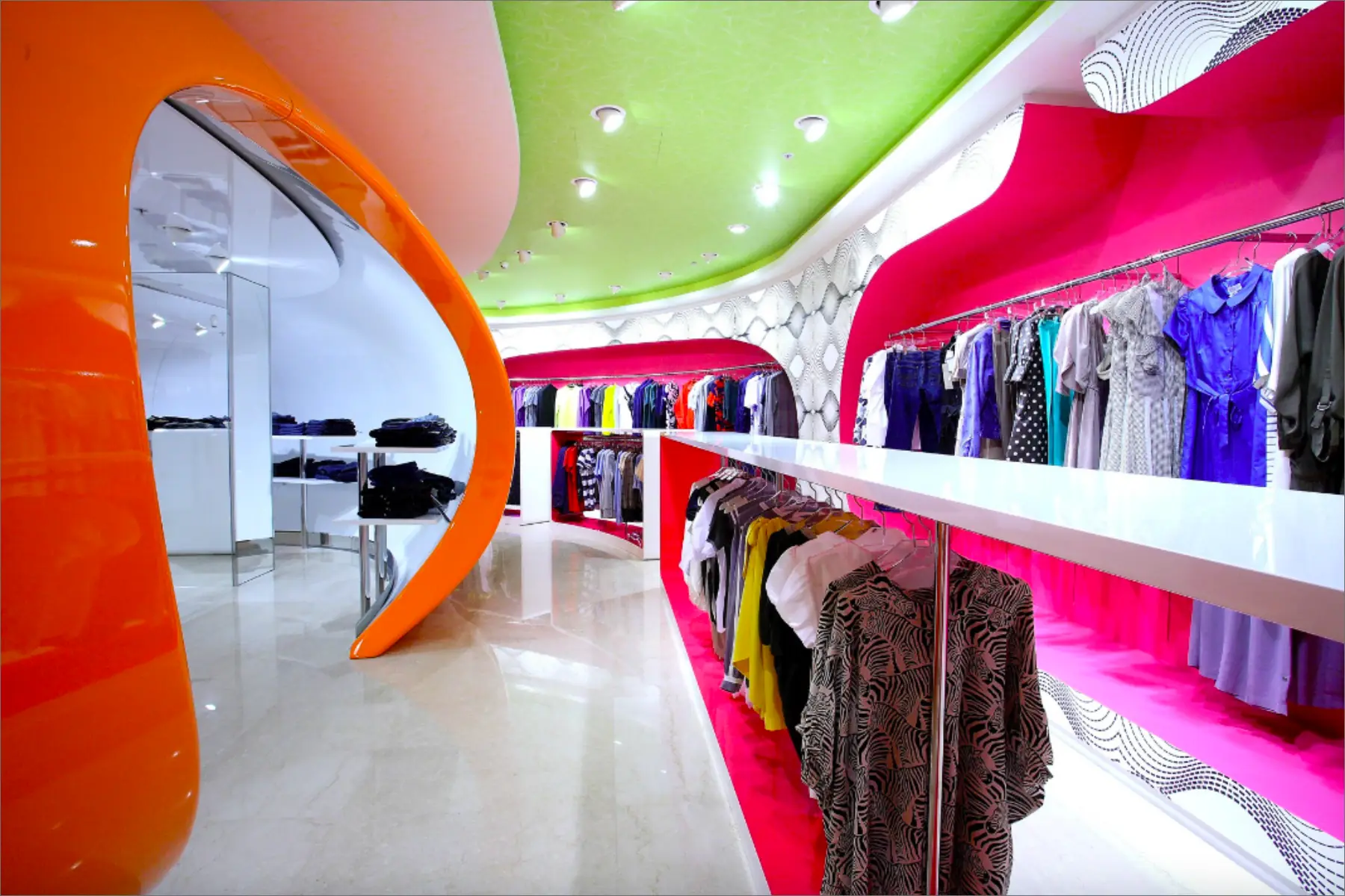 Karim renovated the basement level of a mall for Bosco Pi, creating a technorganic, fluid space that encourages both shopping and socializing. Designed to draw consumers in, the layout features a labyrinth of dynamic, visually stimulating elements that engage visitors. Shaped display units are arranged around a grid of columns, each offering a unique shopping experience. The café is a continuous strip of benches, arranged to allow socializing, with seats facing inward or outward, creating an inviting urban hangout for the youth.