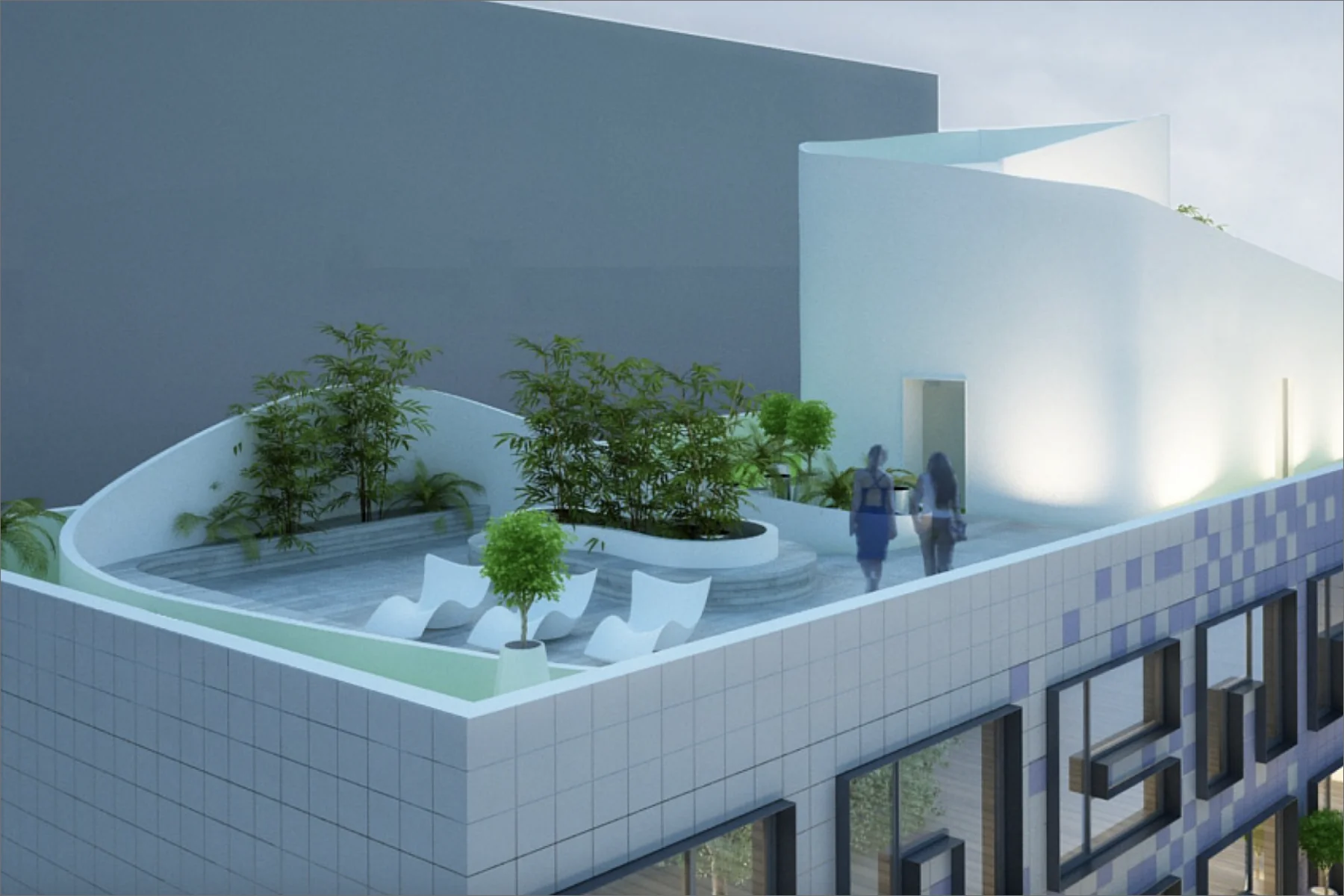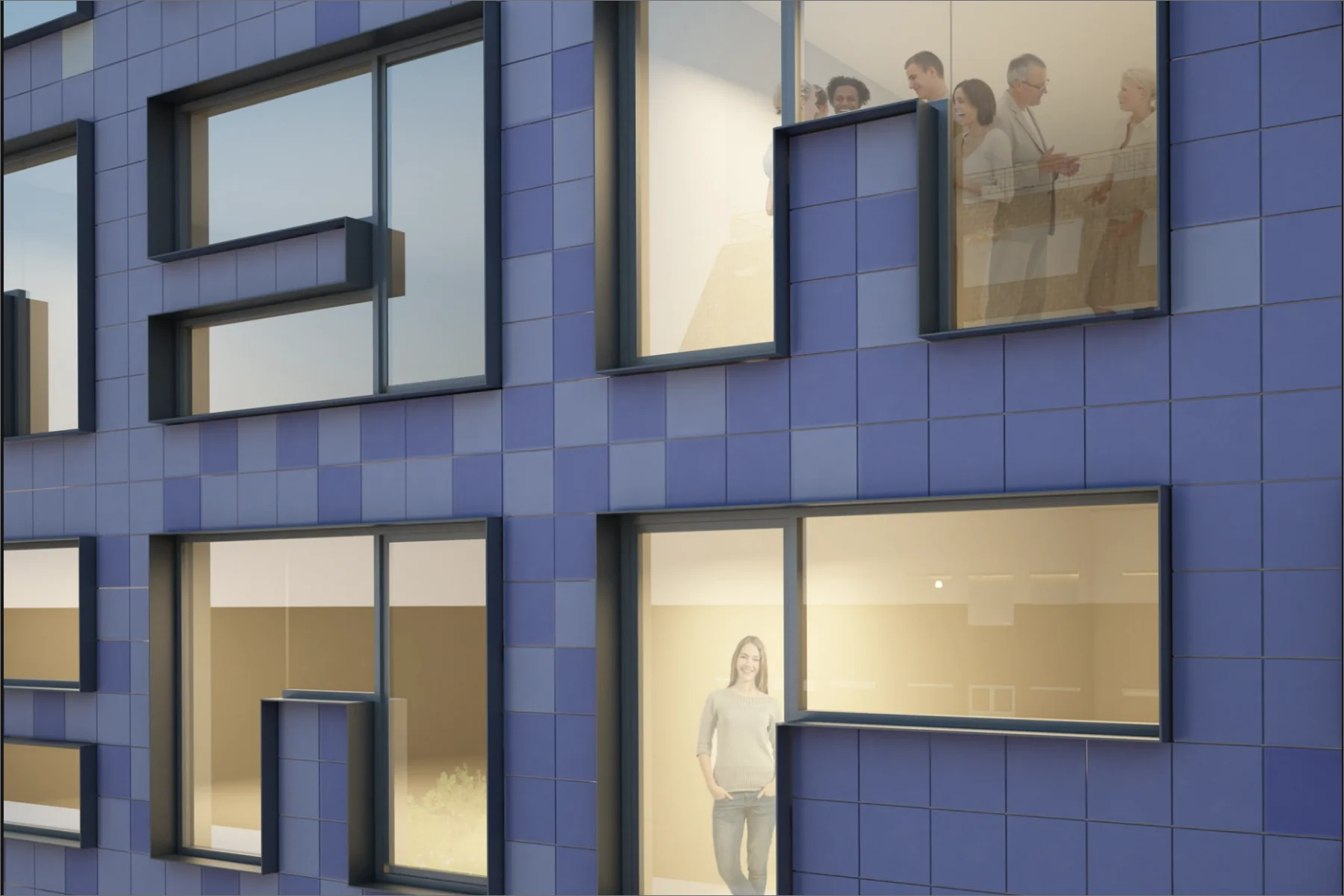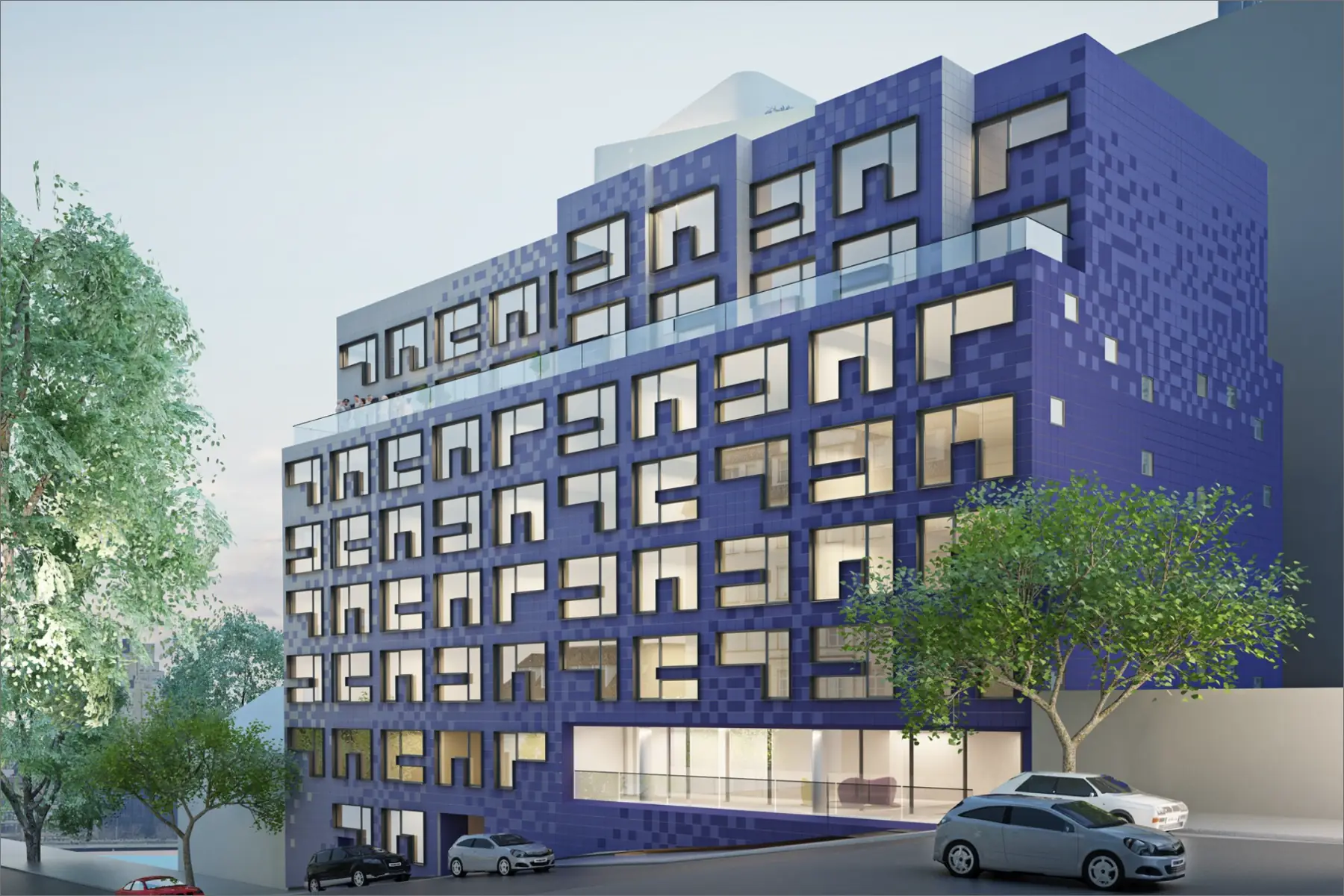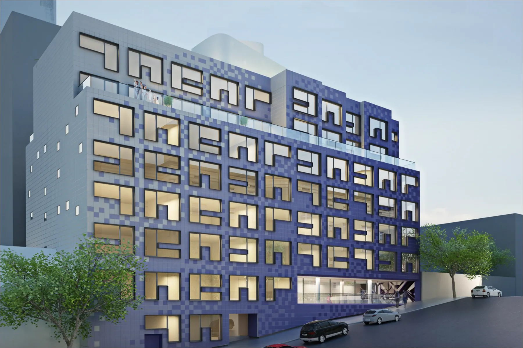 The facade’s colour story is inspired by the lilac bush native to New York, featuring a pixelated pattern in shades of purple, lilac, silver, and gold. This design employs lightweight square panels arranged in a grid. Within this grid, uniquely shaped windows include abstracted Hebrew letters that spell "life" and "love," resonating deeply with the diverse local cultures of Inwood, including Irish, Spanish, and Dominican communities. This thoughtful integration of pattern, geometry, light, and colour fosters a sense of well-being for its inhabitants.