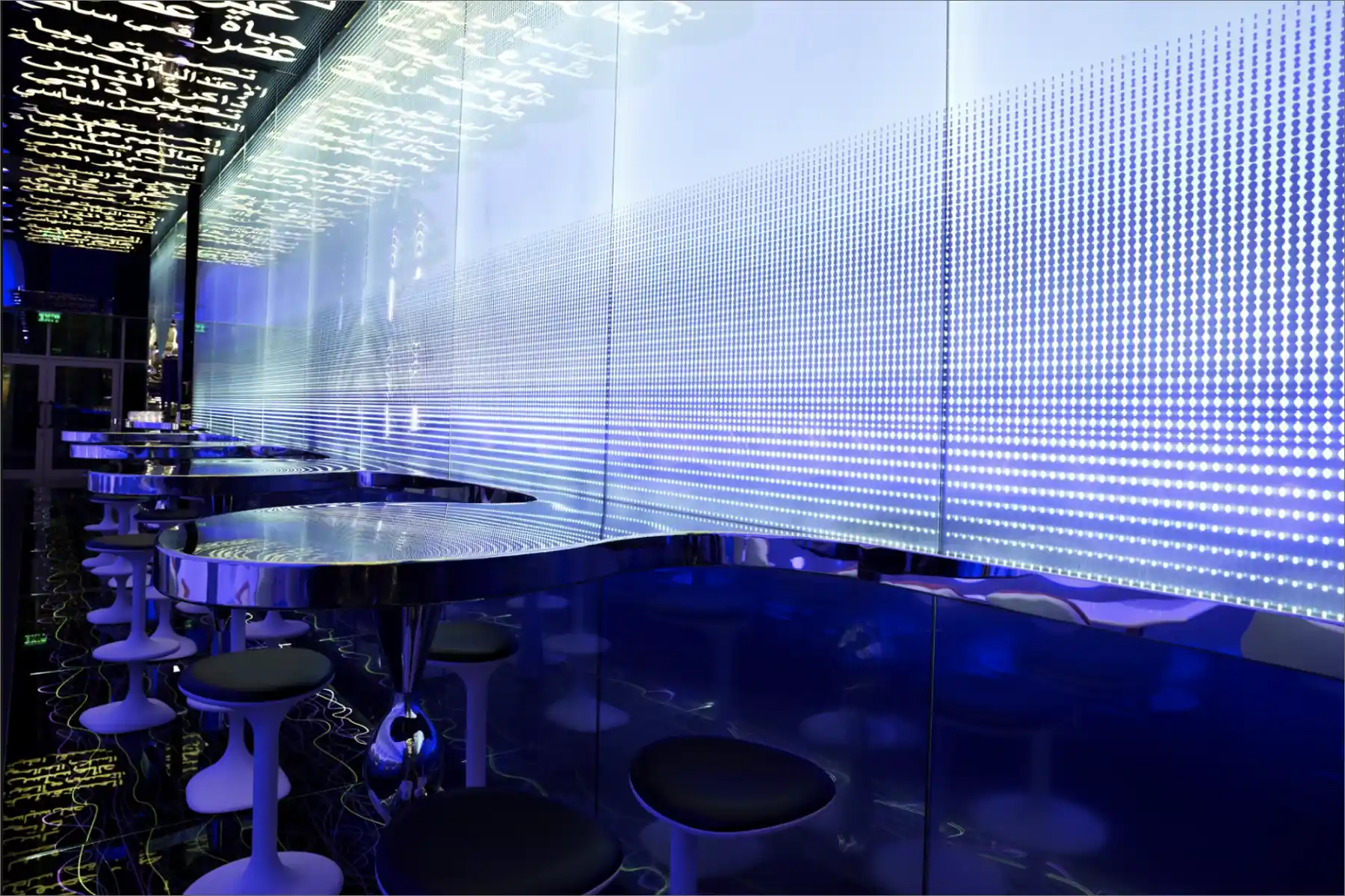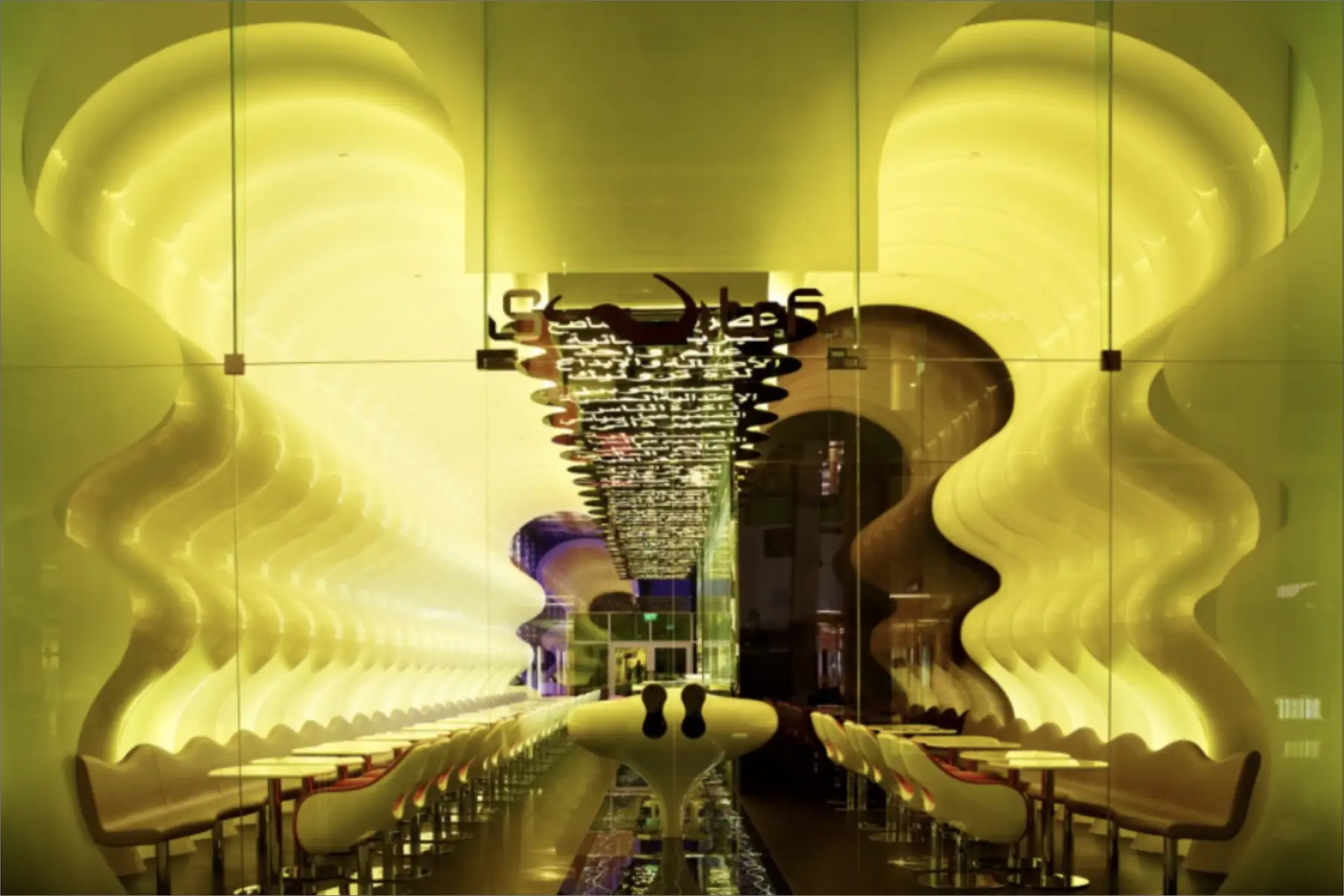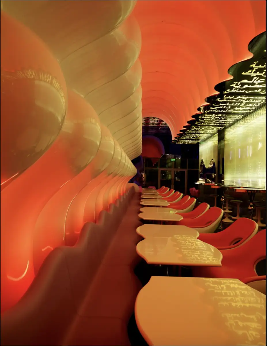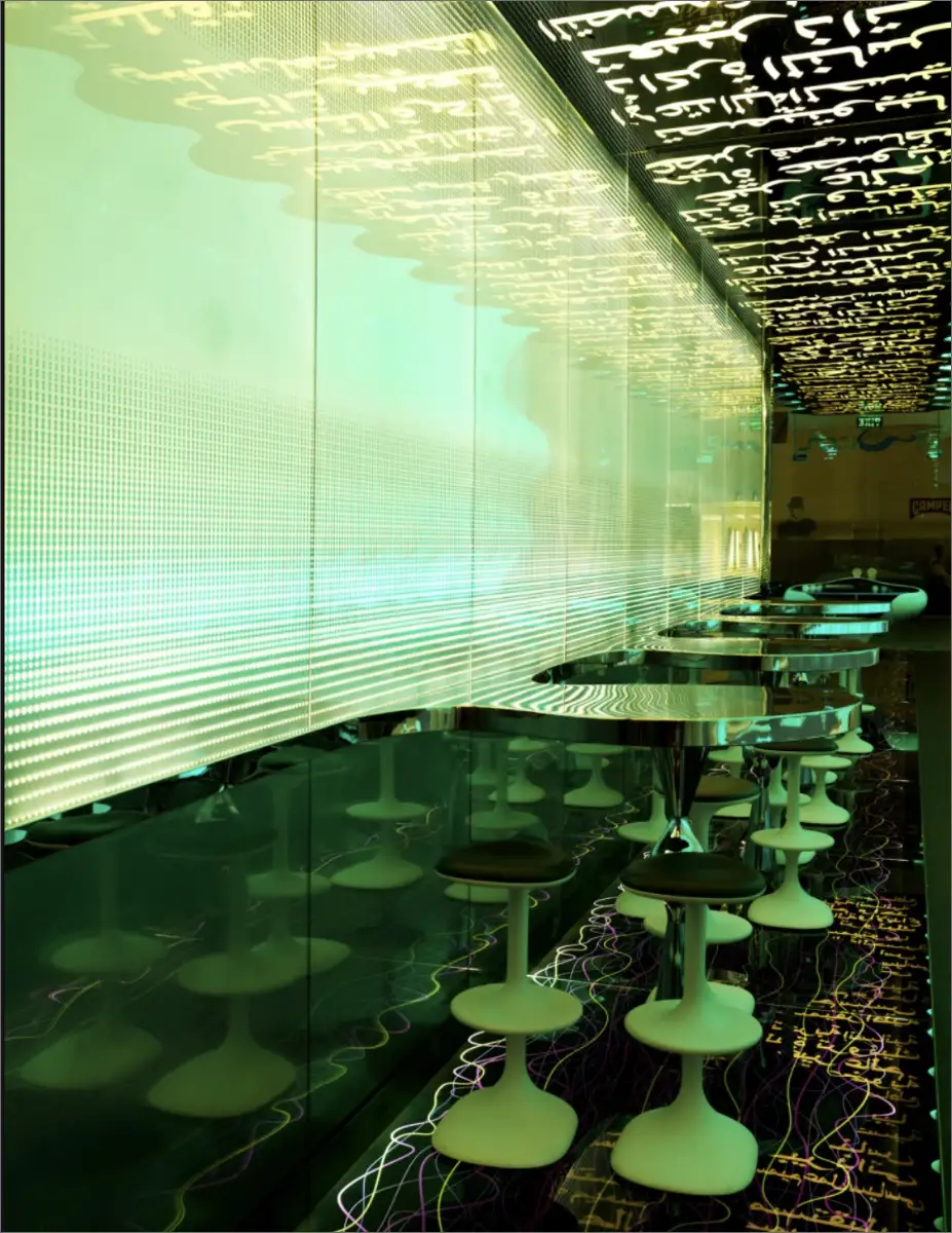 Every aspect engages the senses, from sights to scents, crafting a memorable global dining experience. The backlit ceiling displays stylized Arabic phrases, while the wave-shaped seating enhances both efficiency and dynamism. Karim aimed to create a serene oasis within the Dubai Mall, establishing a distinctive landmark that resonates far beyond the city.