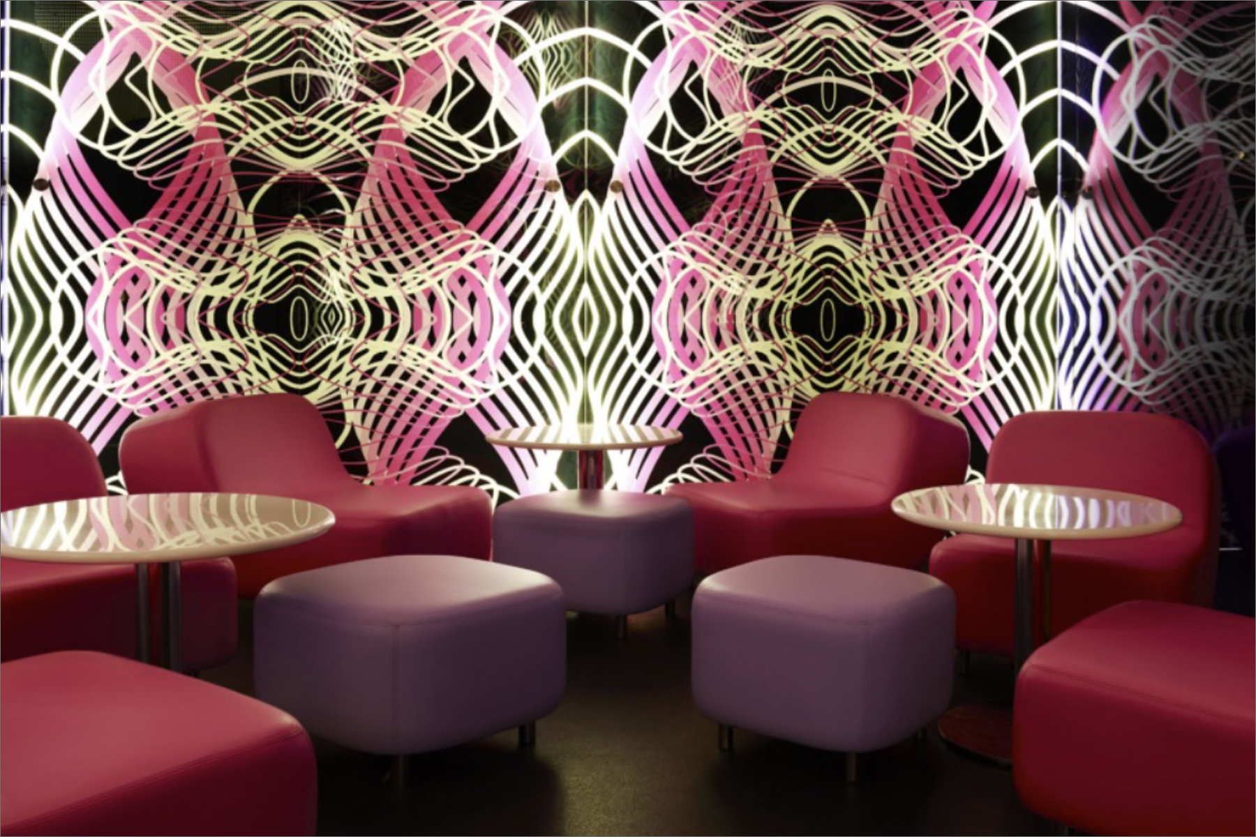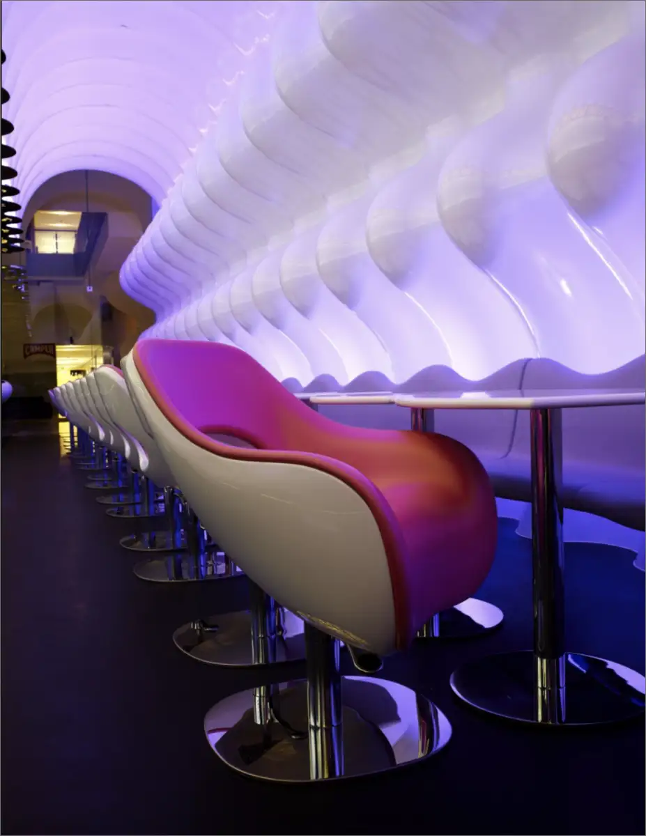 Karim envisioned Switch as a striking, symmetrical space featuring a continuous, undulating wall that wraps around the interior, reminiscent of desert sand dunes. This design creates a captivating interplay of light and shadow, fully enveloping guests in a unique atmosphere of balance.