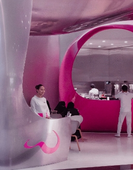 The Switch at Mirdif City Center in Dubai invites curiosity and delight with its organic design. The undulating walls and ceilings create a seamless blend of nature and technology, while fiber glass surfaces diffuse light and colour for a lively sensory experience.