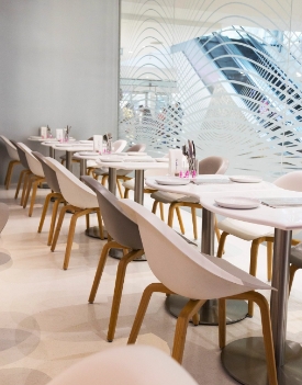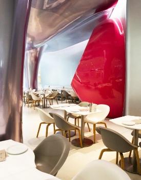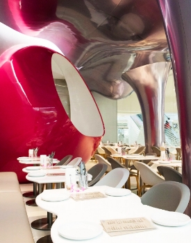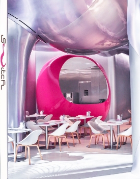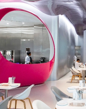 A striking feature, The Pink Blob, serves as an oversized display window that anchors the space and highlights the restaurant's offerings. Full-height, frameless glass enhances the café’s openness, reinforcing the impression of a space carved from its surroundings. Storefront graphics contribute to the immersive feeling of a man-made natural environment.