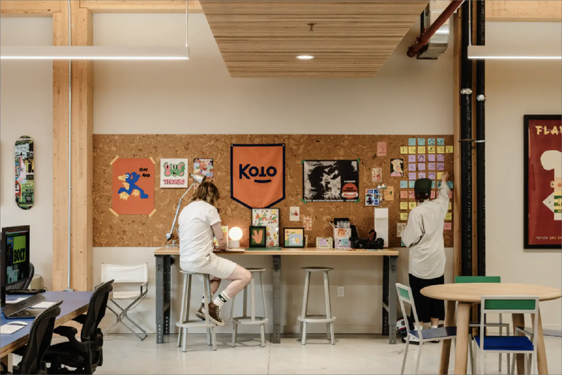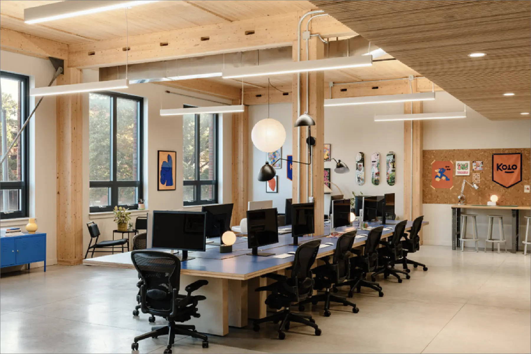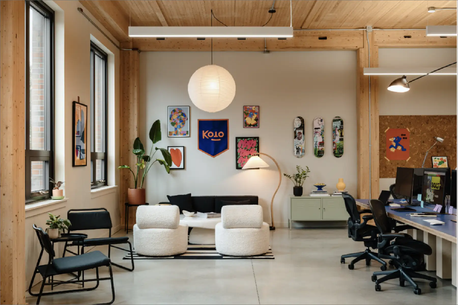 Roarke Design Studio collaborated with a creative agency to design a space that embodies a youthful and relaxed atmosphere while incorporating essential office functionalities. The result is an environment that promotes innovation and collaboration, inspiring employees to thrive creatively and bring their best ideas to life.