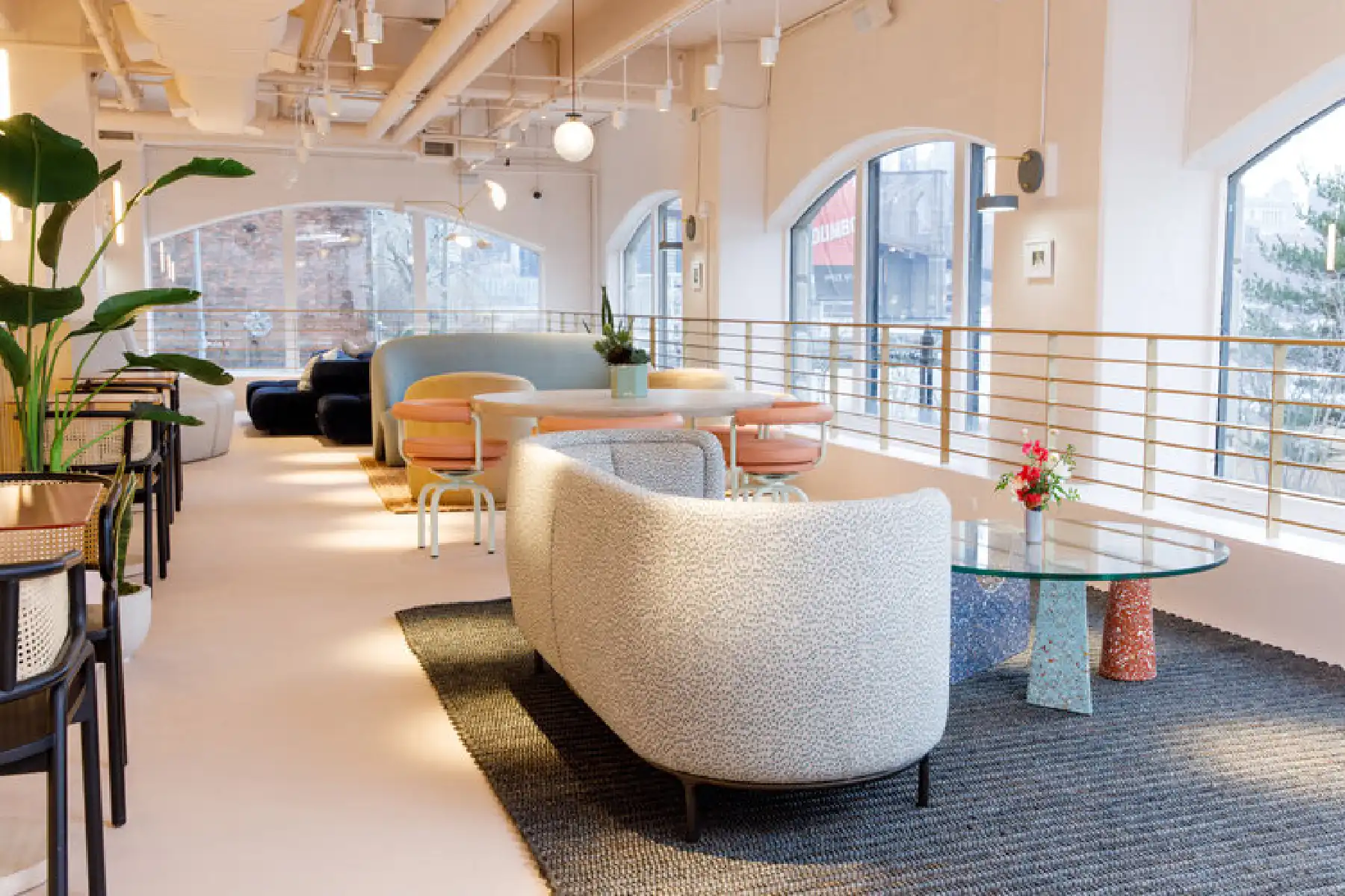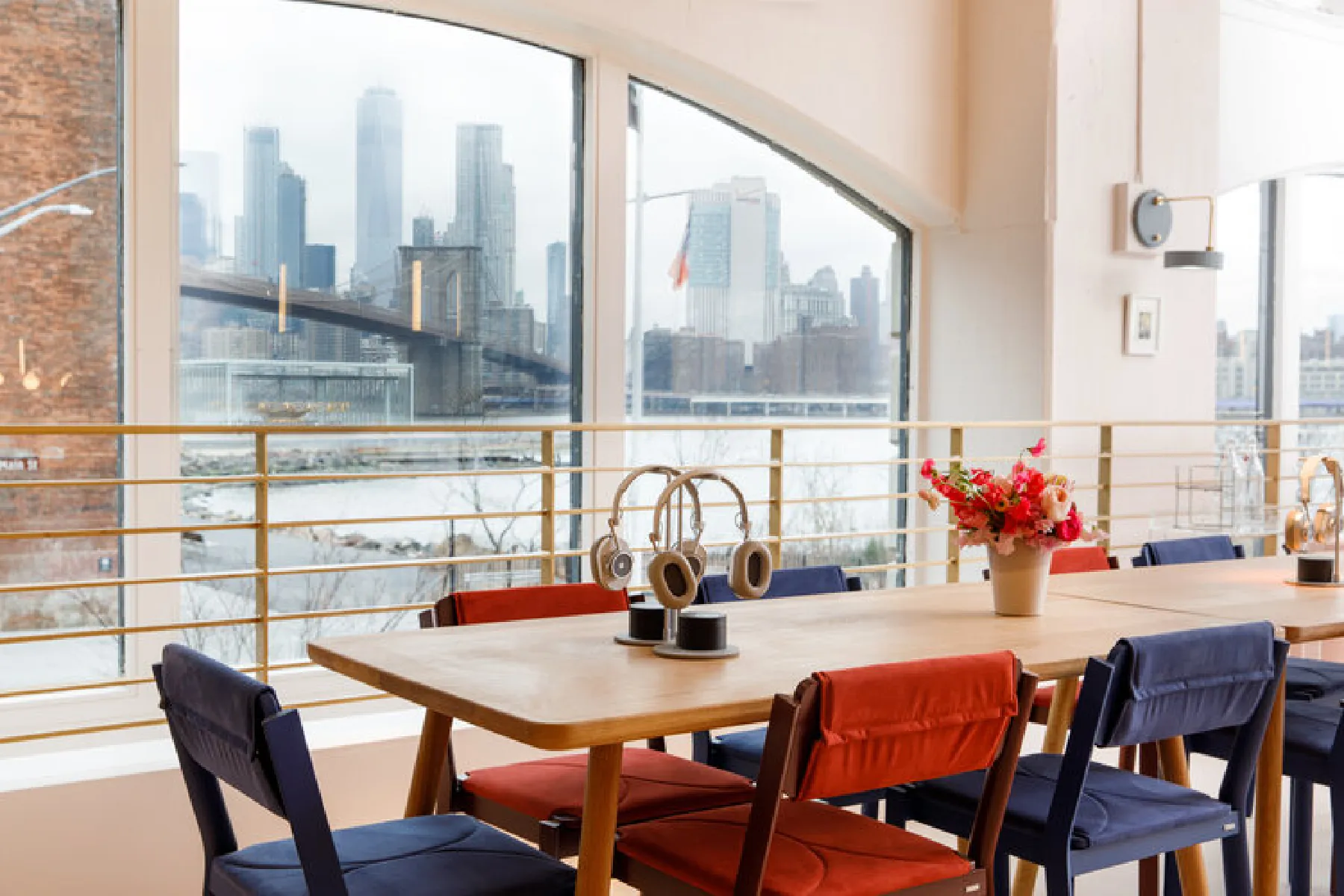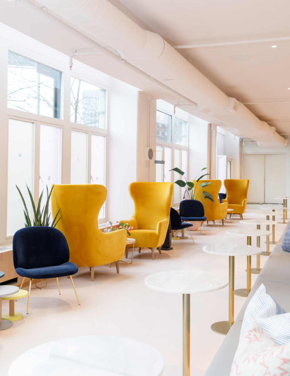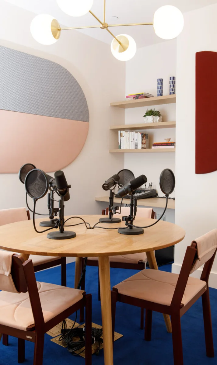 Preserving the industrial character of a former tape factory while playfully reinterpreting its layout, the interior combines preserved surfaces with rich, contemporary colours and textures. A central double-height space offers varied seating areas for large events or smaller, focused meetings, facilitating transitions from social interaction to quiet retreat.
