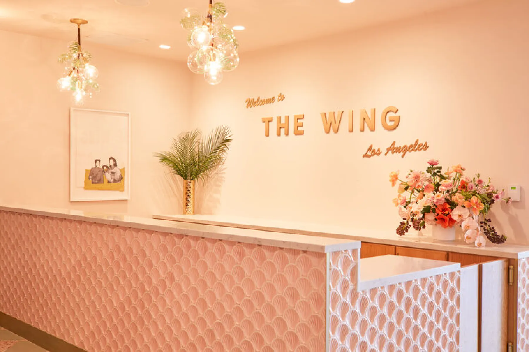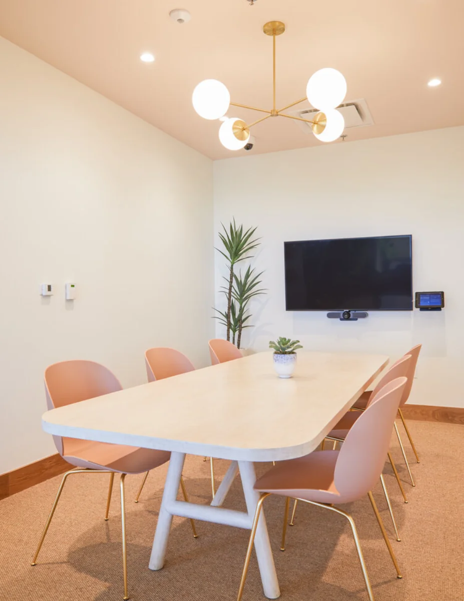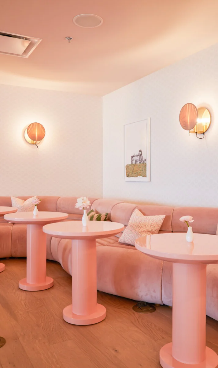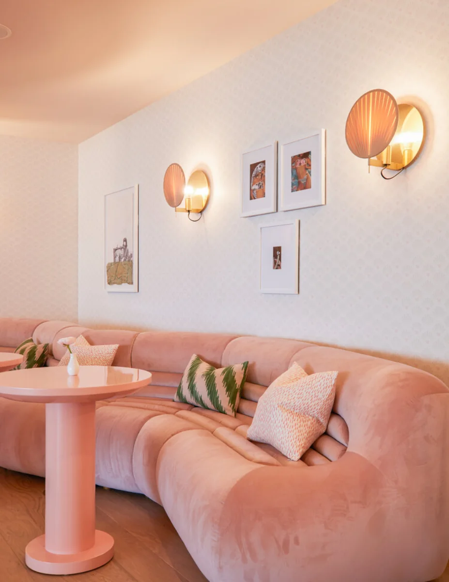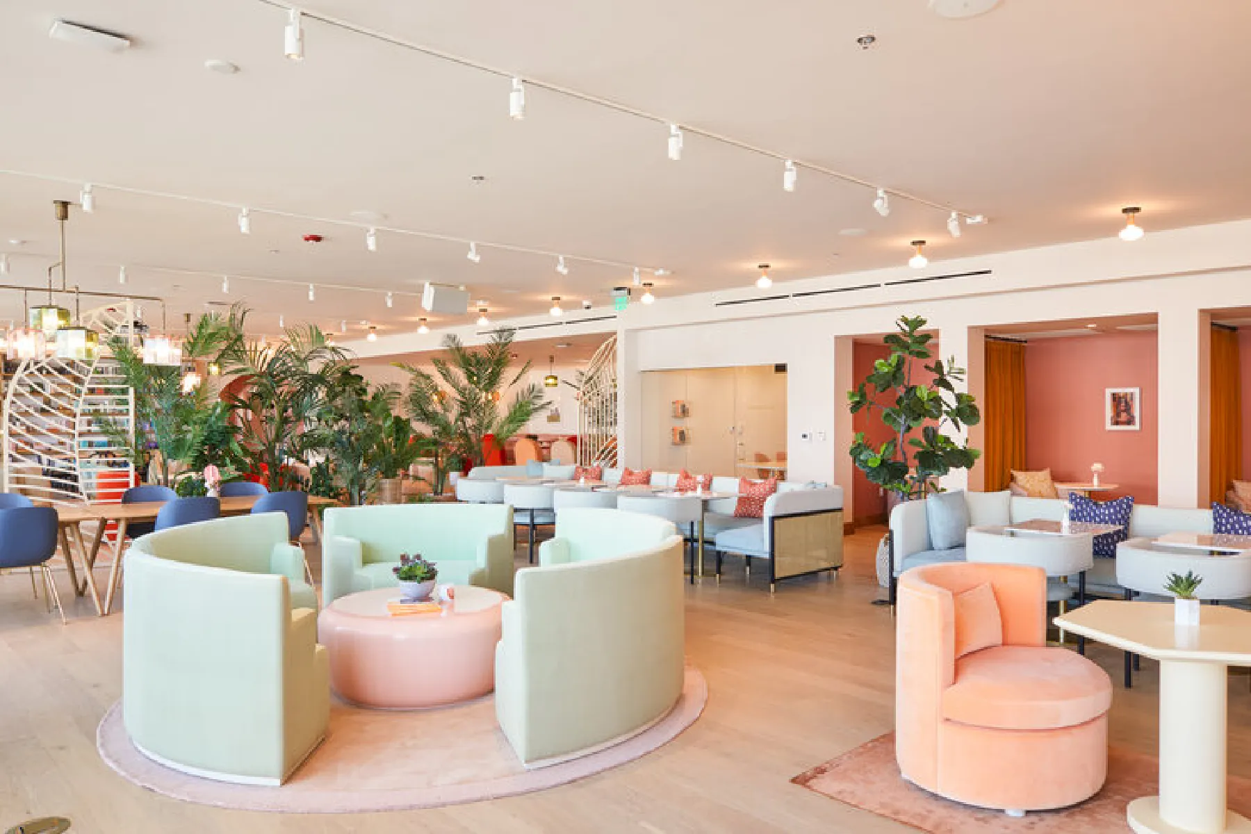 A coworking space designed with California cool and Hollywood glam in mind, the palette is inspired by sultry sunset with corals, peaches, and pinks in the upholstered furniture.