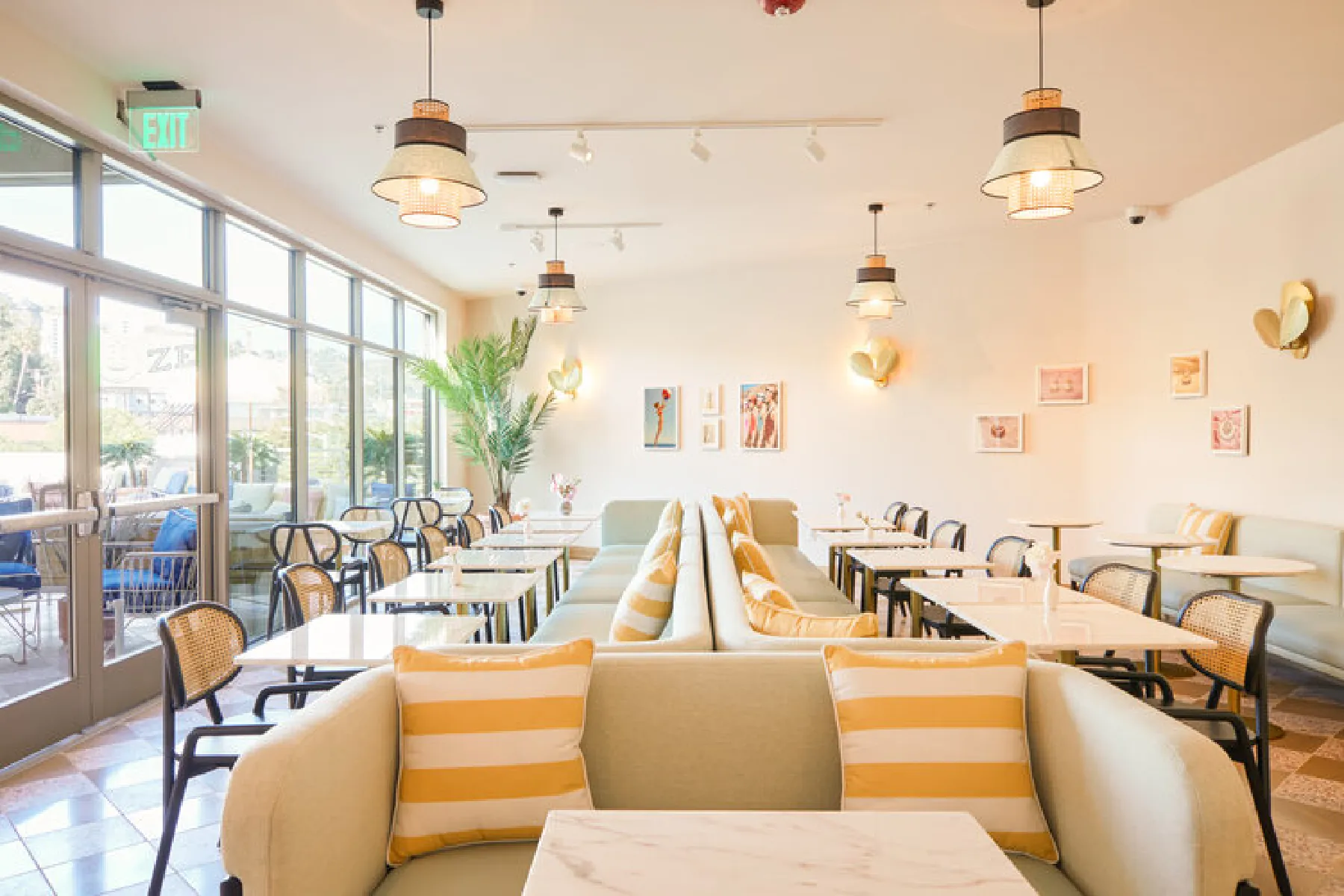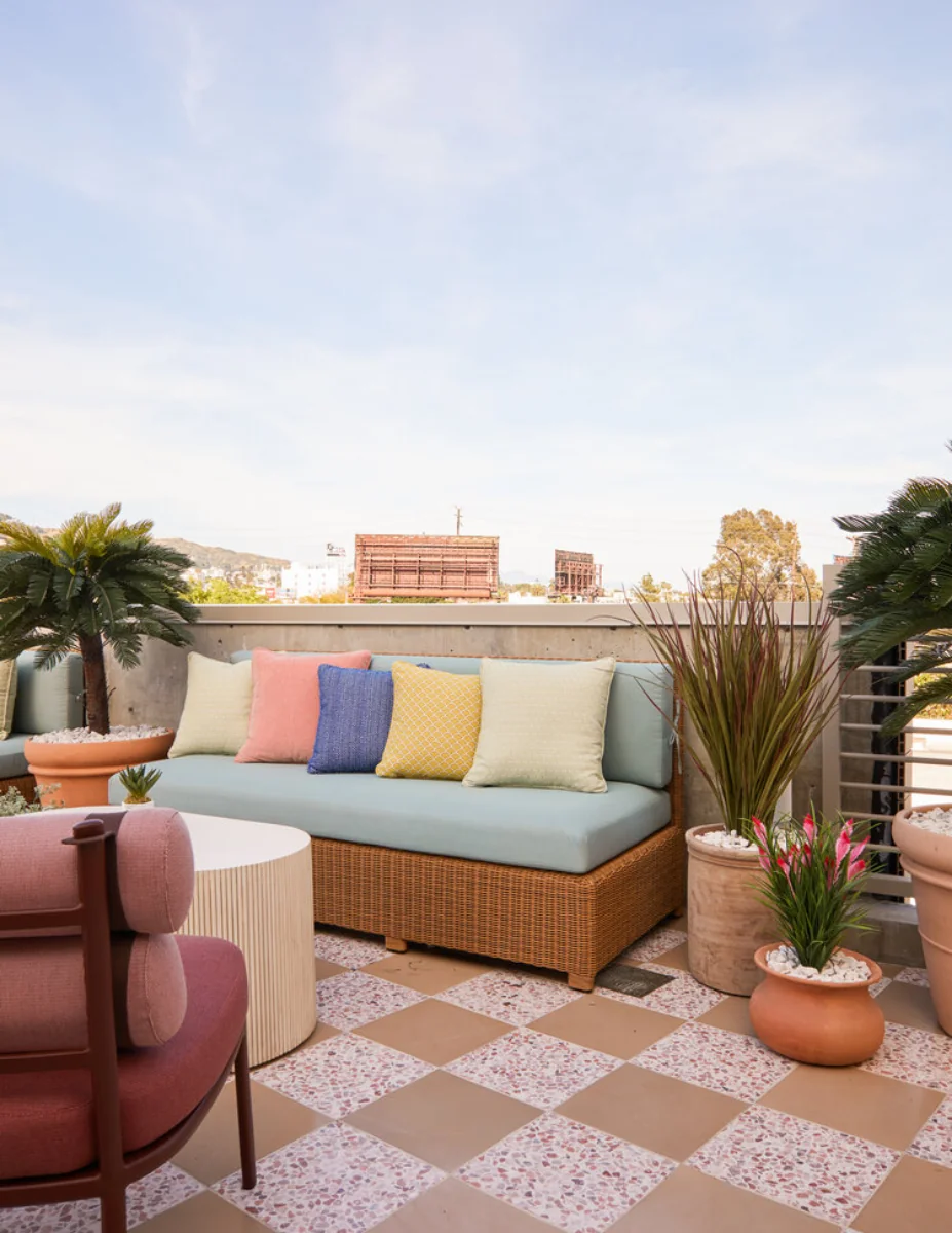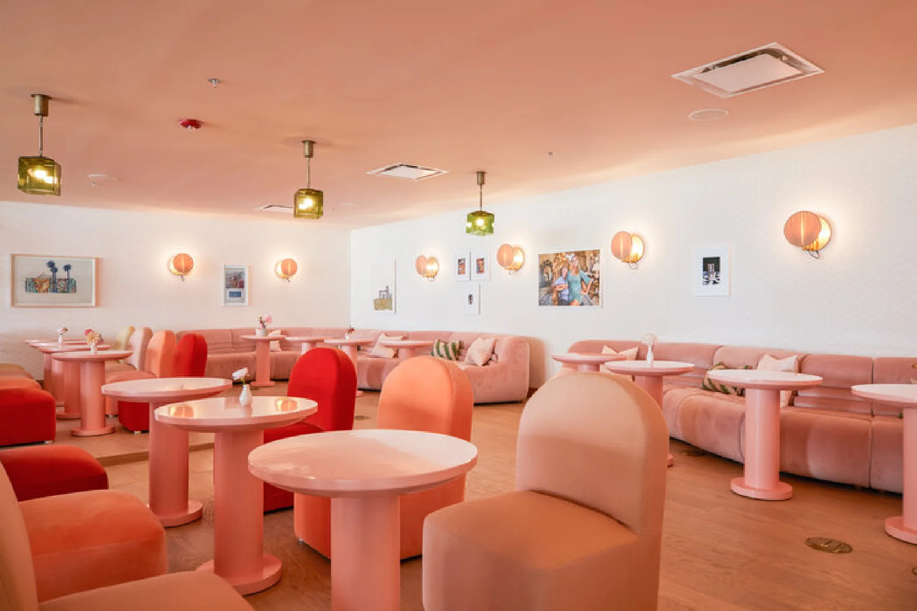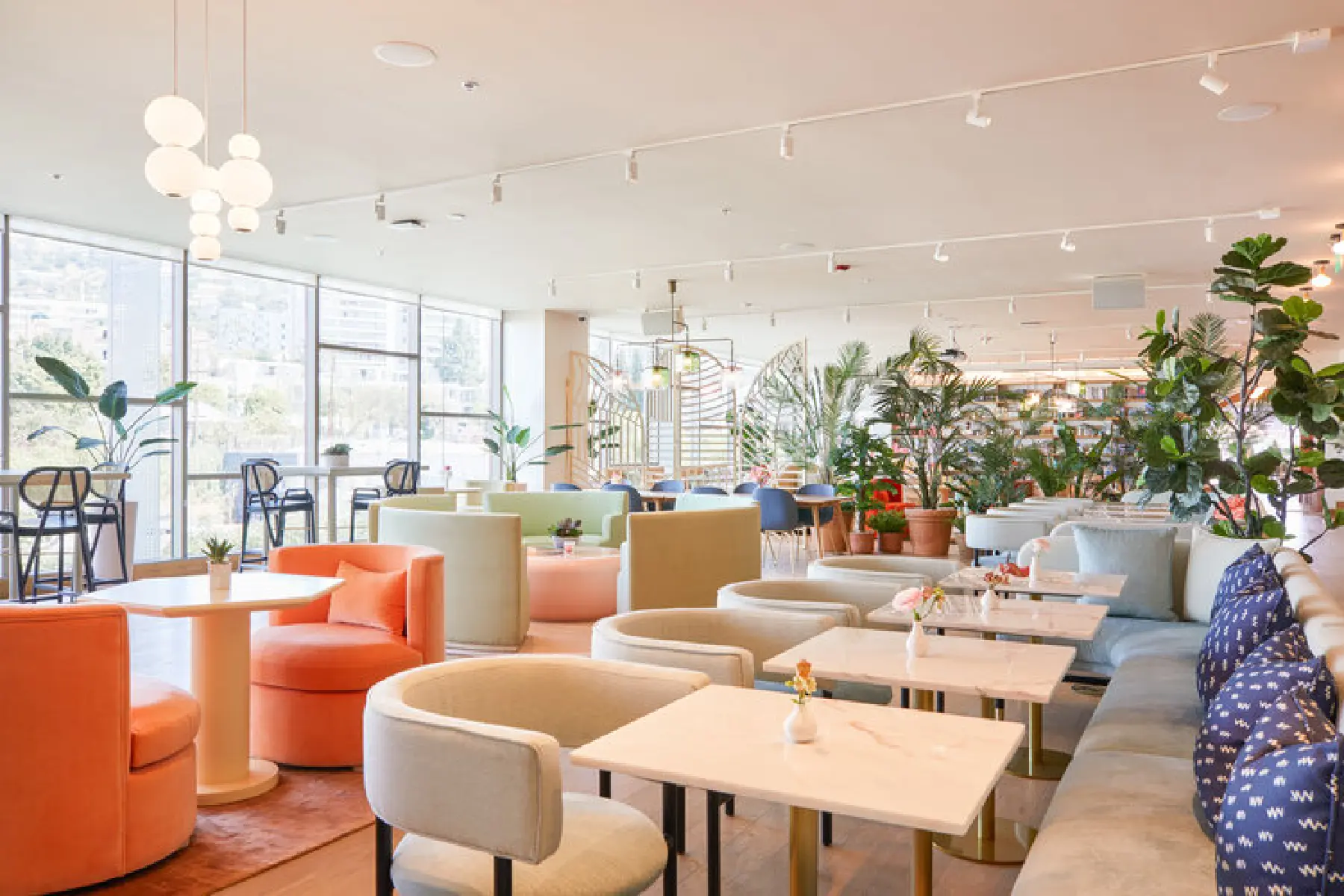 A coworking space designed with California cool and Hollywood glam in mind, the palette is inspired by sultry sunset with corals, peaches, and pinks in the upholstered furniture.